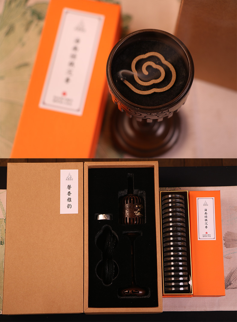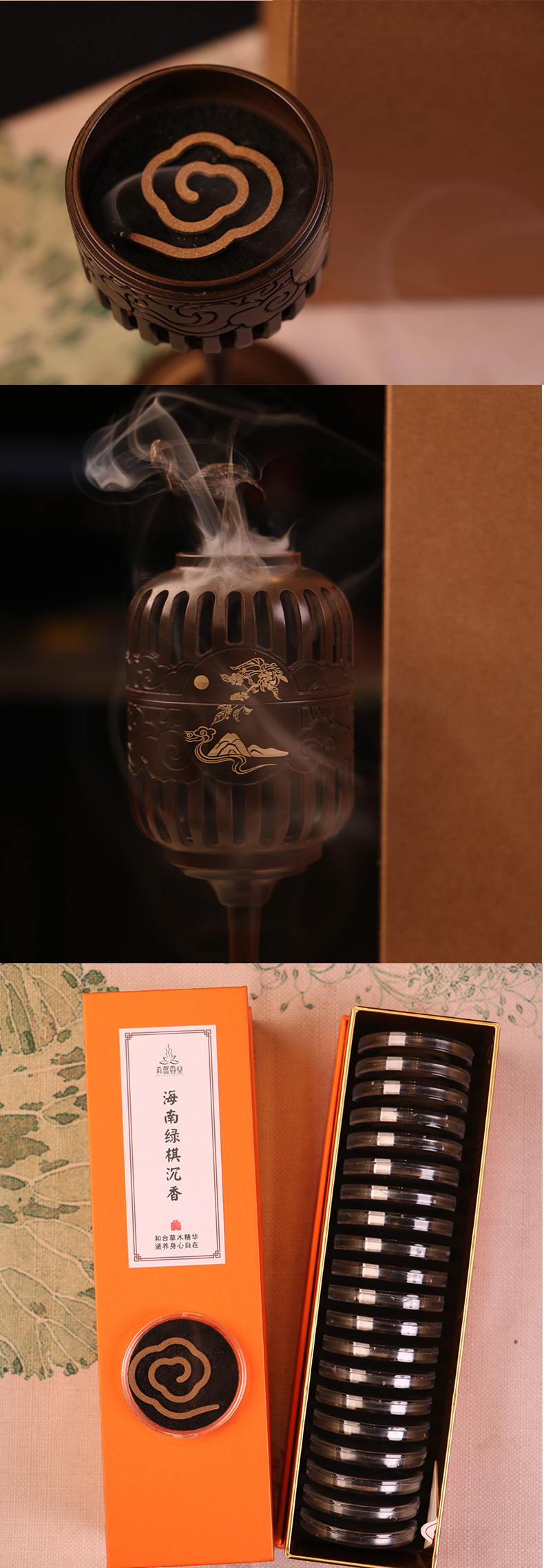 【茶香器韵】高端沉香组合 观月铜香炉(送防火棉10片)一套奇韵沉香(无粘粉、祥云形状、20片装*2 2盒奇韵沉香