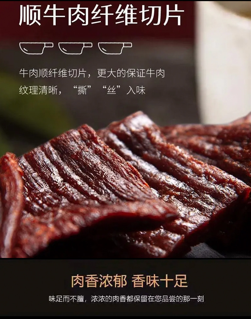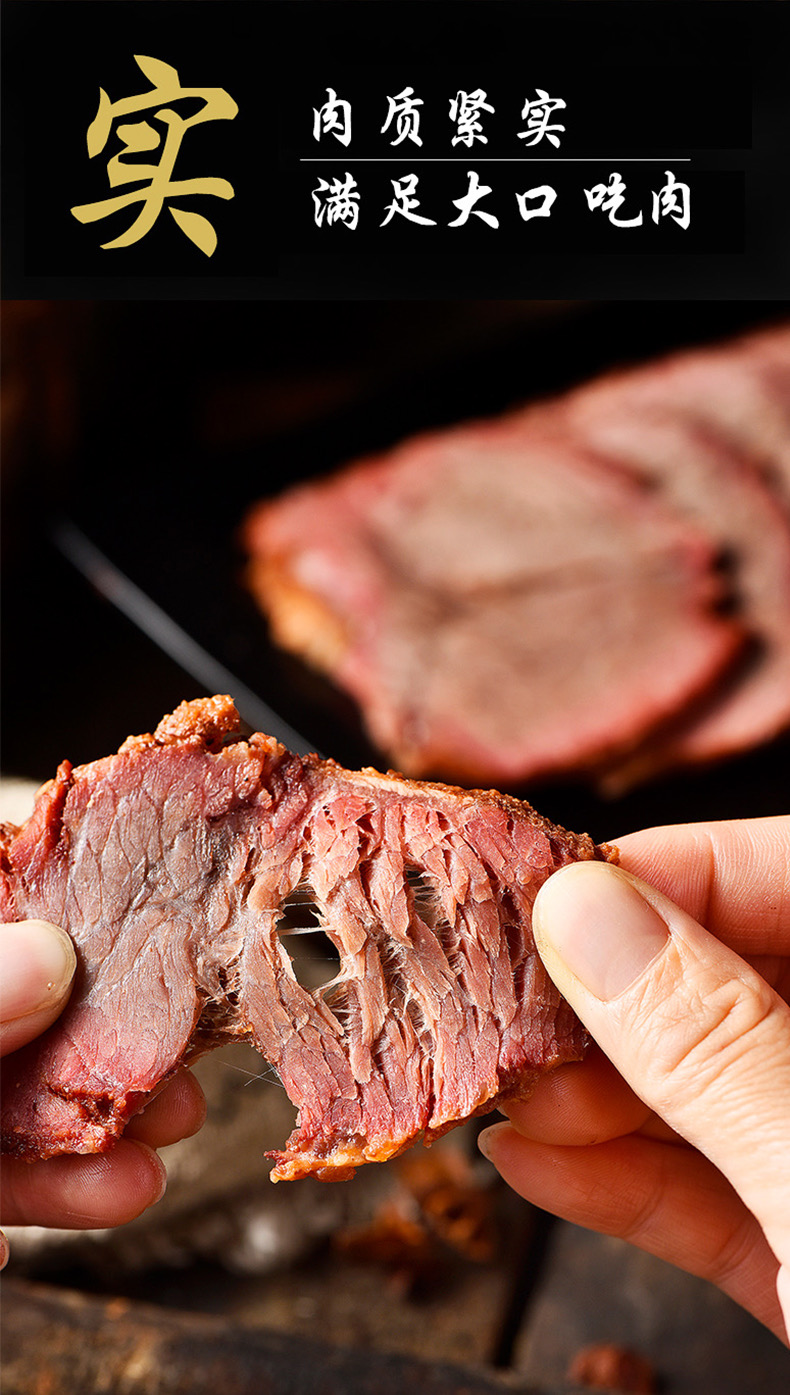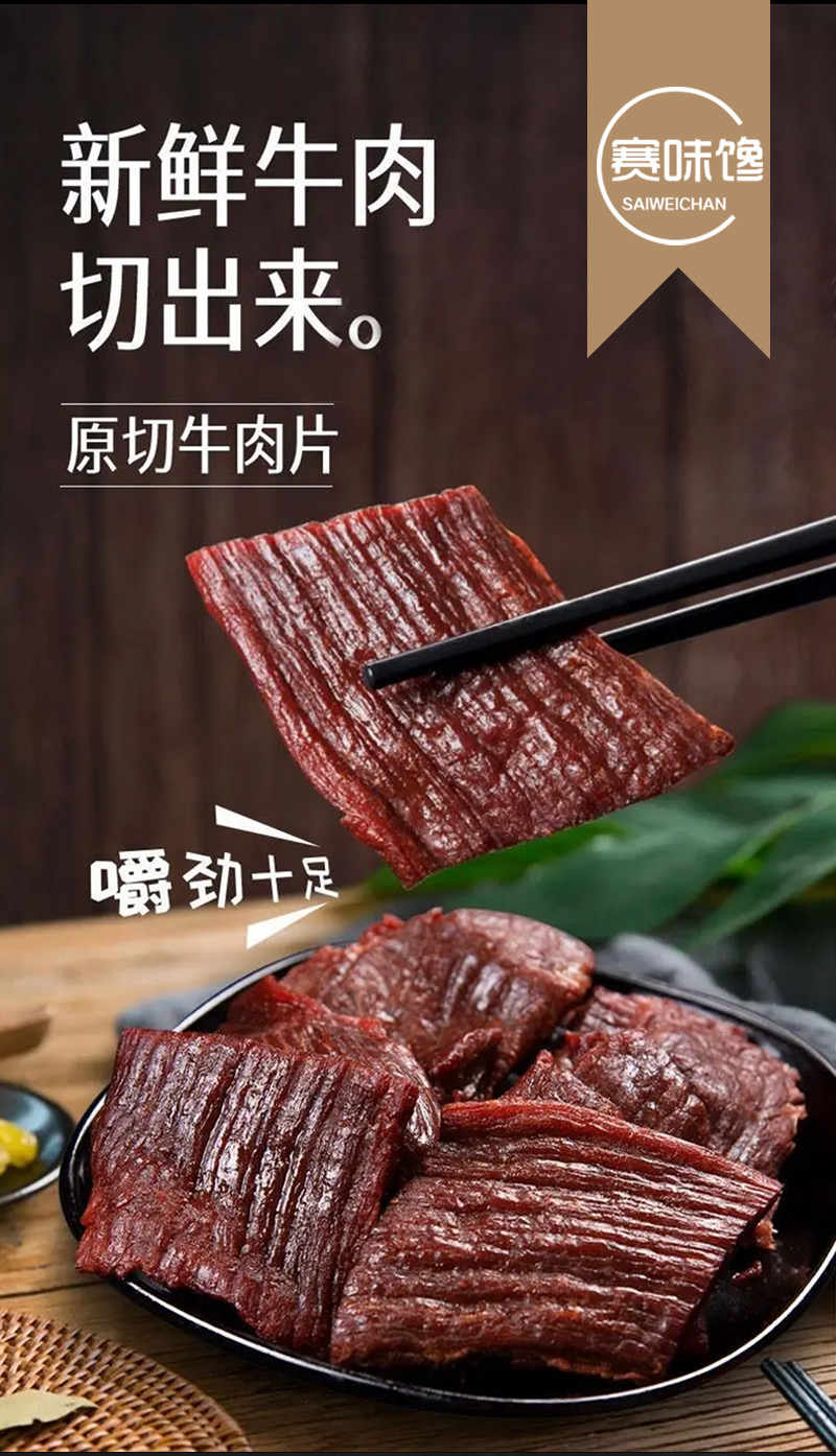 赛味馋用的也是内蒙草原放养黄牛,得天独厚的生态环境,造就了牛肉的优秀品质,深棕明亮,绵润柔韧,筋肉一体, 后腿瘦肉更是完美把握牛肉的肥瘦和质感,大块整切,有筋有肉!制作上遵循传统古法工艺,上乘香料24小时腌制,再文火慢炖,完全酱熟后在老汤里浸泡2小时,每一条肉丝都很入味,酱香浓郁,烂而不散,嫩滑不塞牙。除了卤牛肉外,还有手撕牛肉干和牛肉片,也是纹理清晰,“撕”“丝”入味,切好的牛肉,加入秘制调料腌制入味,再经过48小时挂晒风干后高温烤熟,制作过程中不添加防腐剂和色素,也是蛮好吃的!