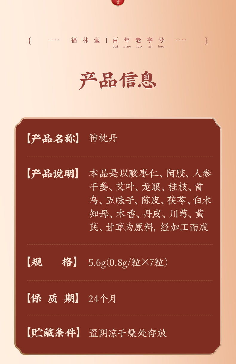【品名】百年中华老字号 福林堂 古法神枕丹 传统工艺 古法制作 7粒/盒 【规格】7粒/盒 【产地】国内 【保质期】24个月 【发货包装】独立包装 【发货地】河南 【发货快递】中通 【不发货区域】新疆、西藏、港澳台 【发货时效】48-72小时,周末节假日顺延 |