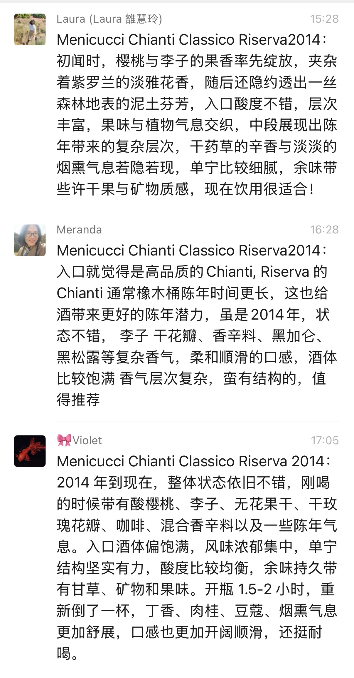 在开瓶 1.5-2 小时后,大家又重新倒了一杯,丁香、肉桂、豆蔻、烟熏等气息清晰可嗅,口感也更加顺滑、开阔。国际采购同事对这款酒评价很高,她说一入口就觉得比一般的经典基安蒂品质都要好,结构扎实,相当耐喝~