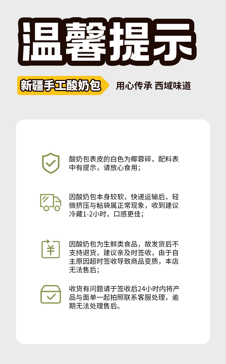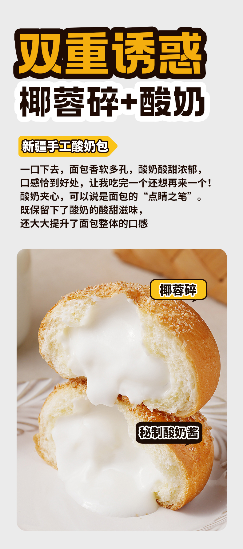 新疆酸奶包,是用新疆本地的原料制成。外层只用牛奶、鸡蛋和优质小麦粉,不加一滴水,松软筋道,麦香浓郁!酸奶馅儿也是重头戏,独特的气候和特殊的地理位置,造就了新疆奶得天独厚的口感,而经过秘制调配后的风味酸奶,酸酸甜甜,奶味香醇!