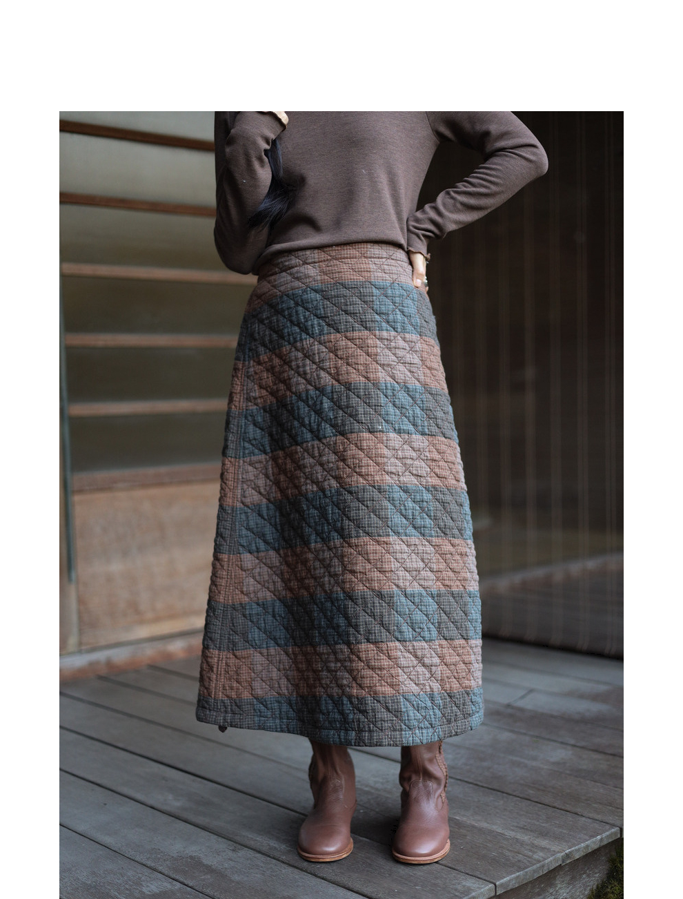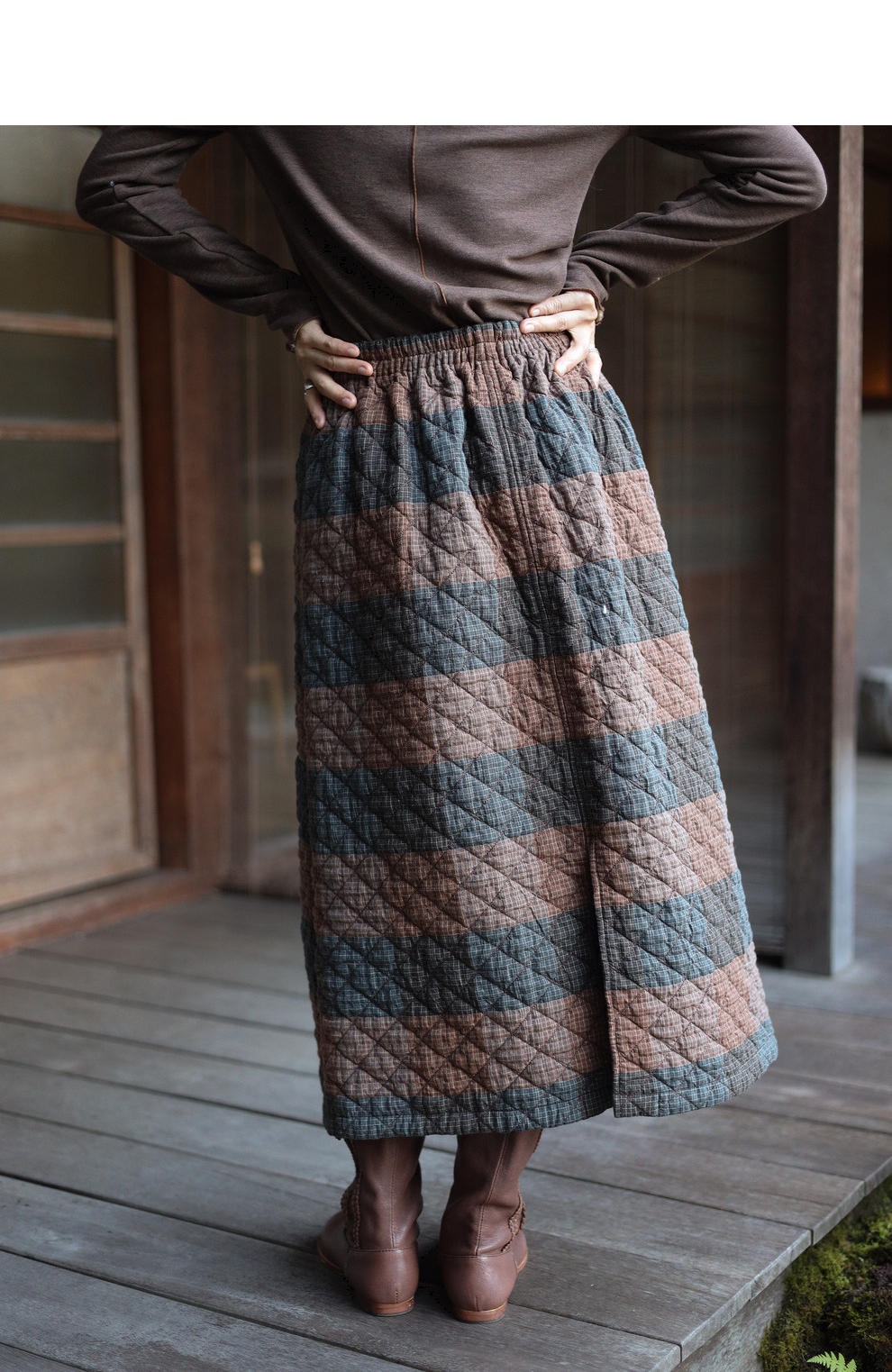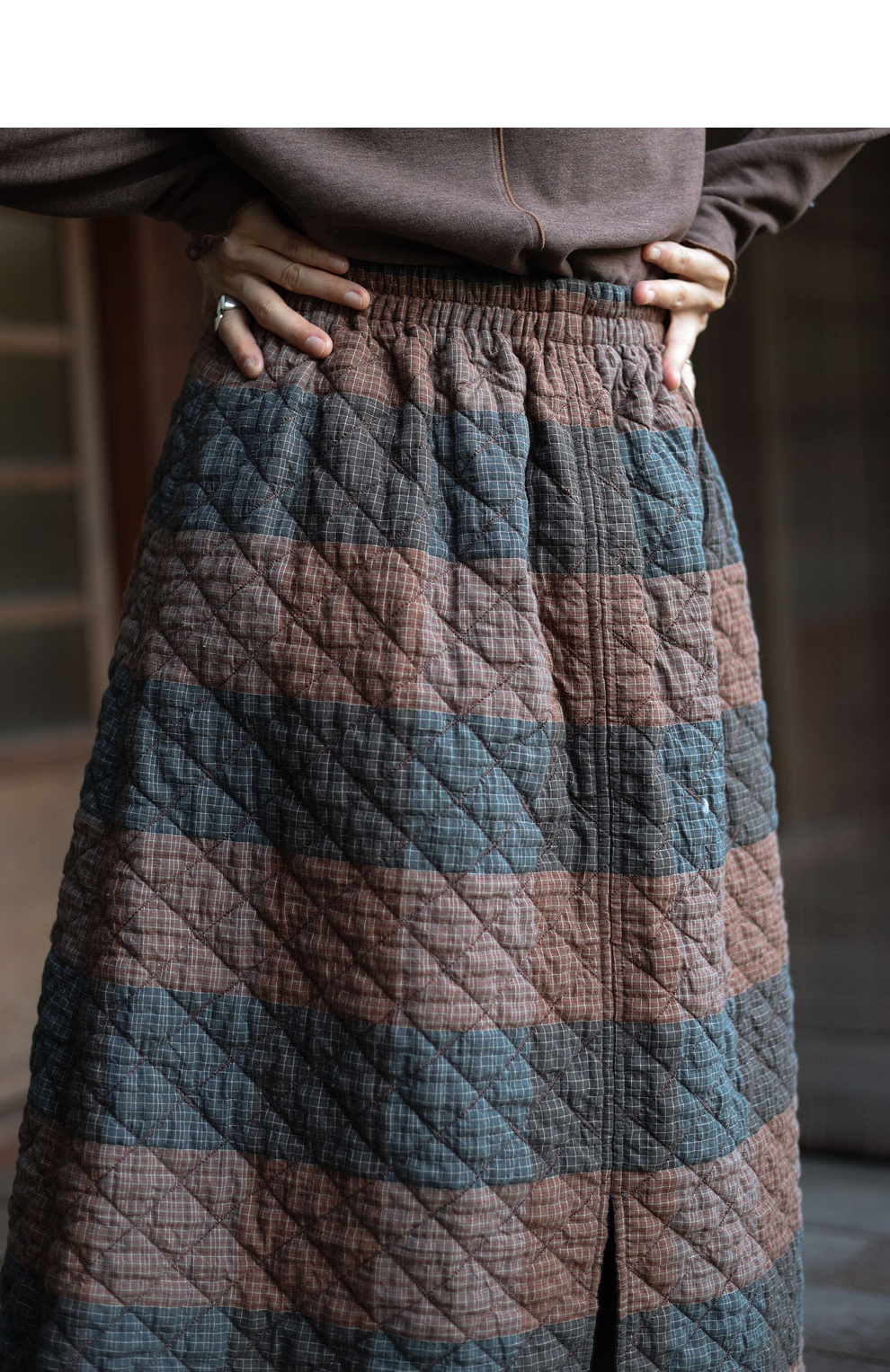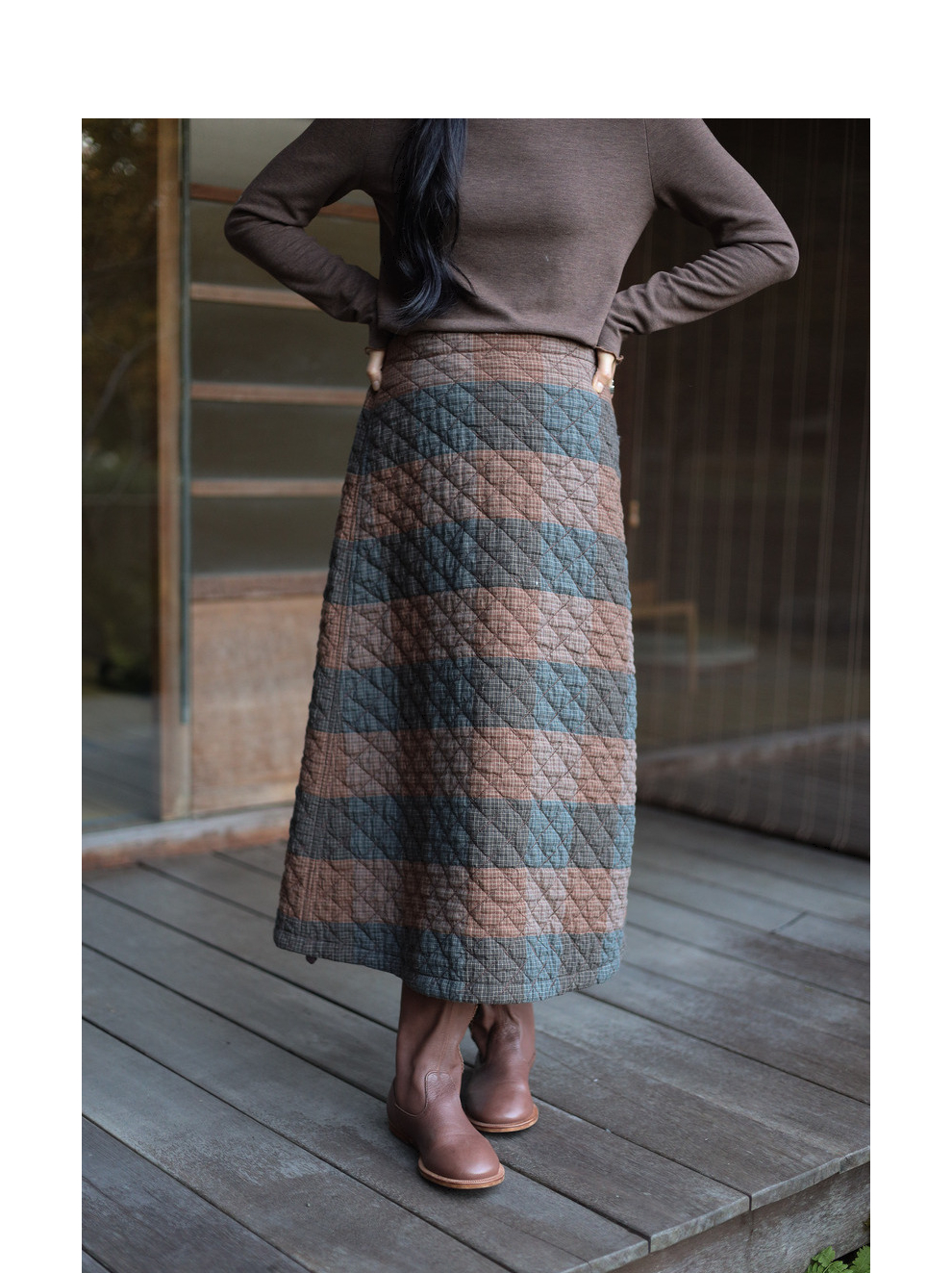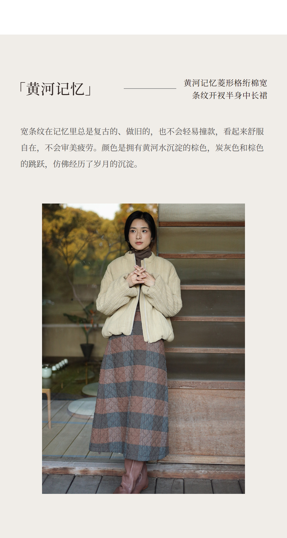绽放971朵/【IP黄河记忆系列】菱形格绗棉宽条纹开衩中长款半身裙