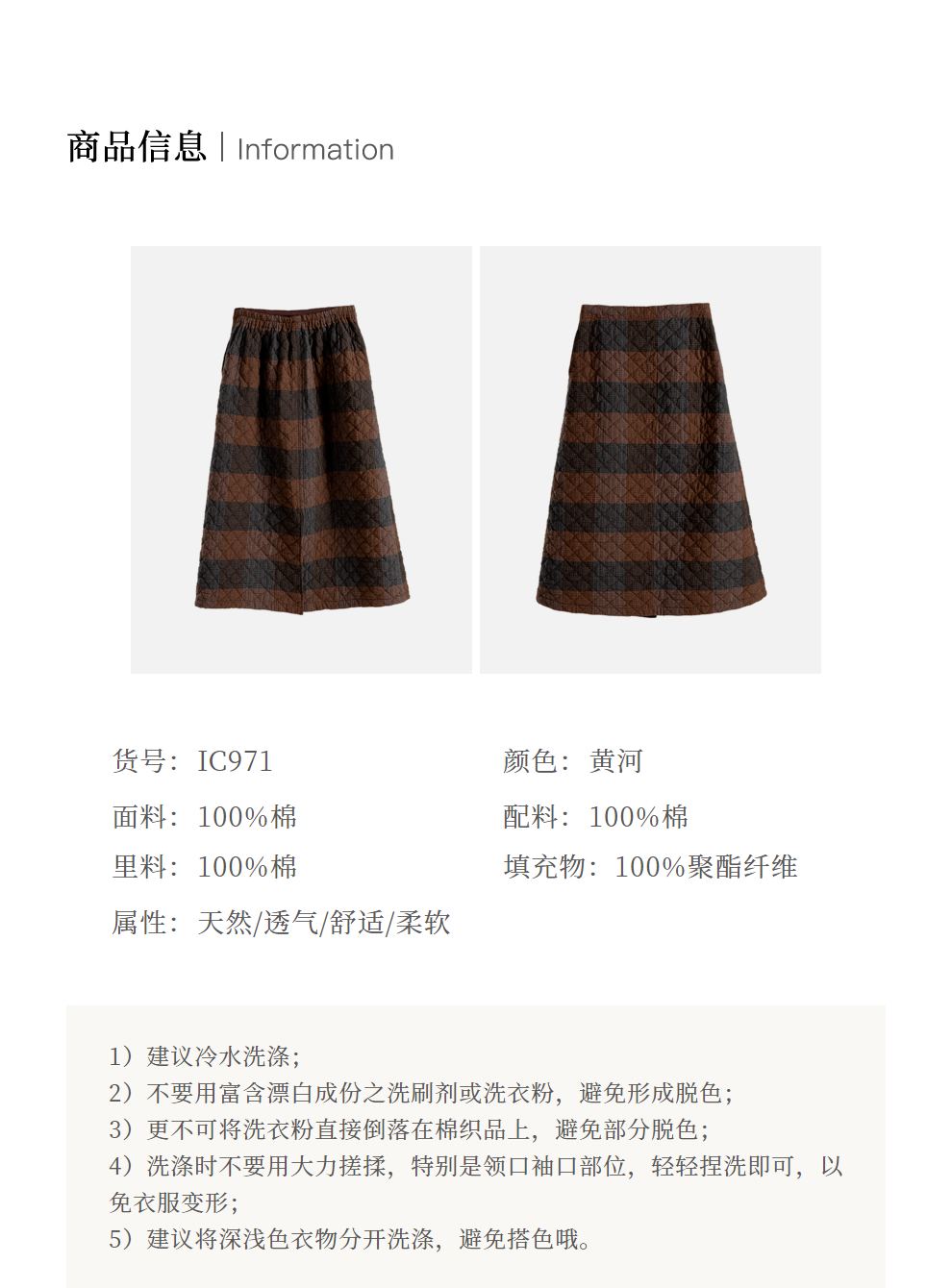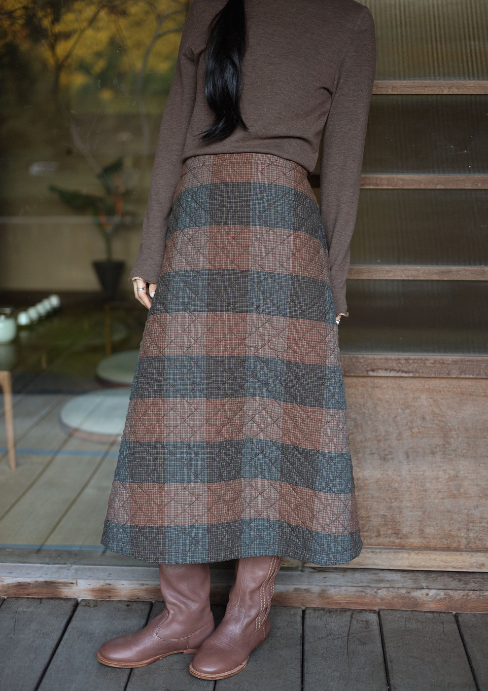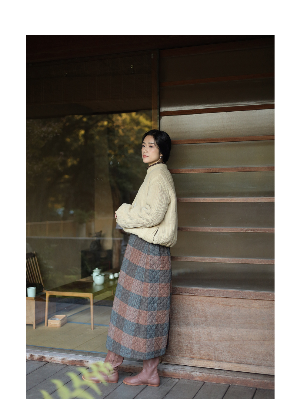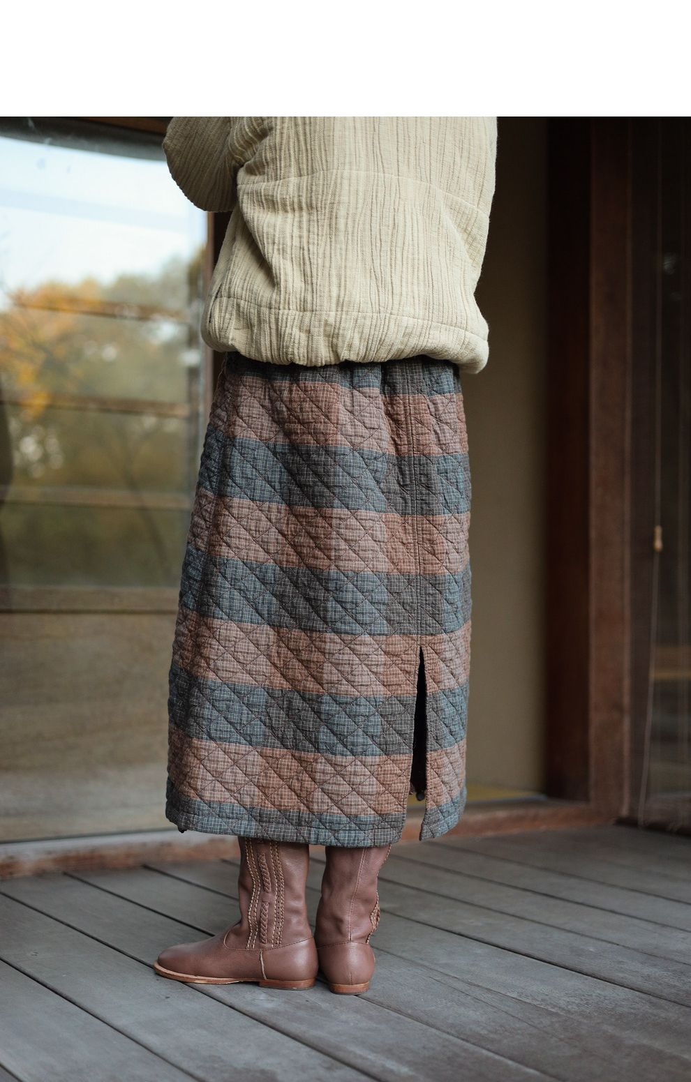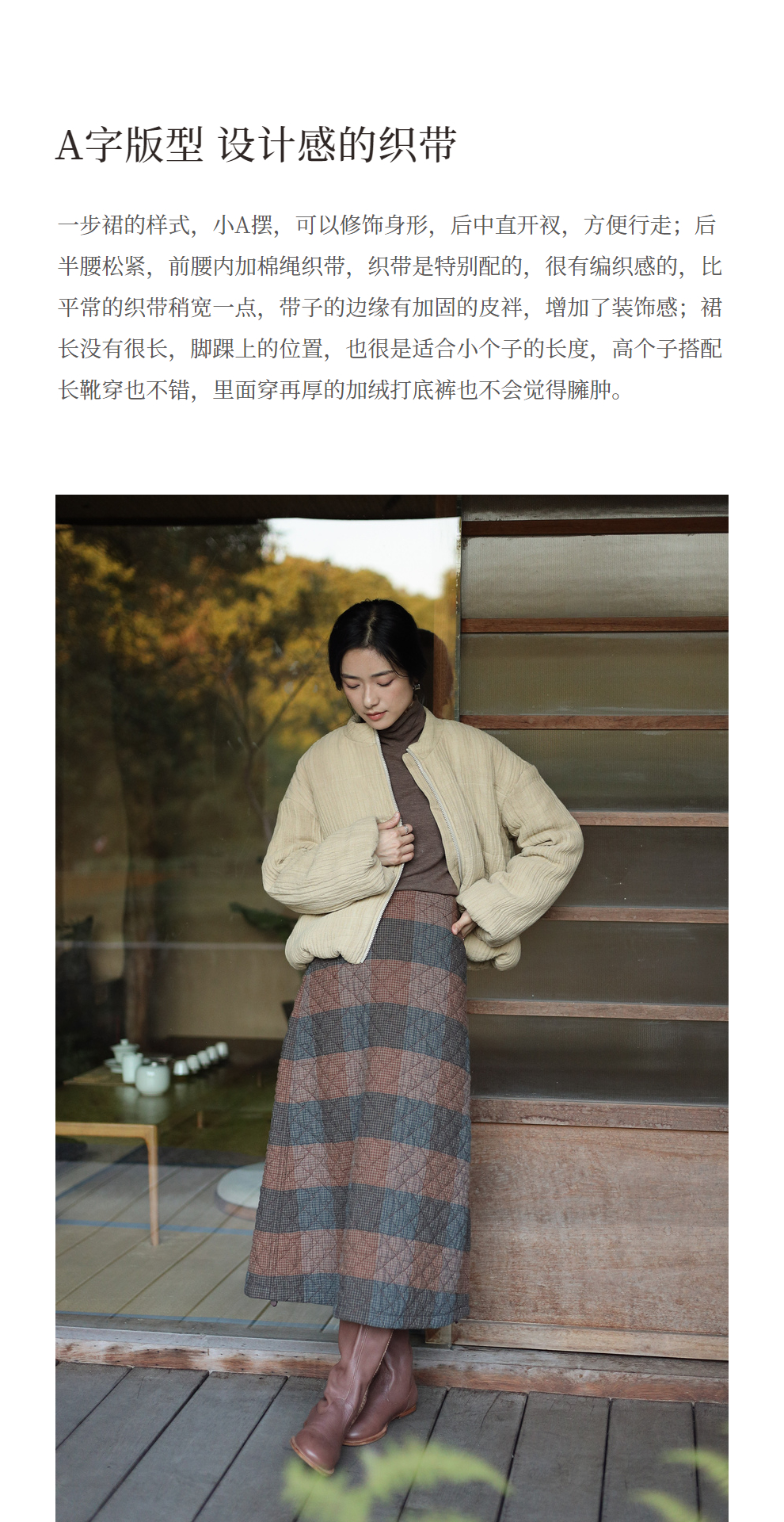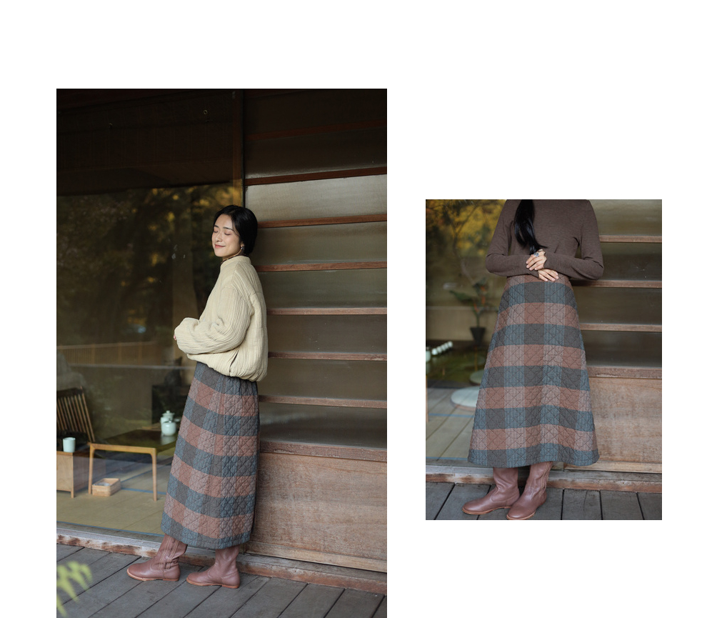 绽放971朵/【IP黄河记忆系列】菱形格绗棉宽条纹开衩中长款半身裙
