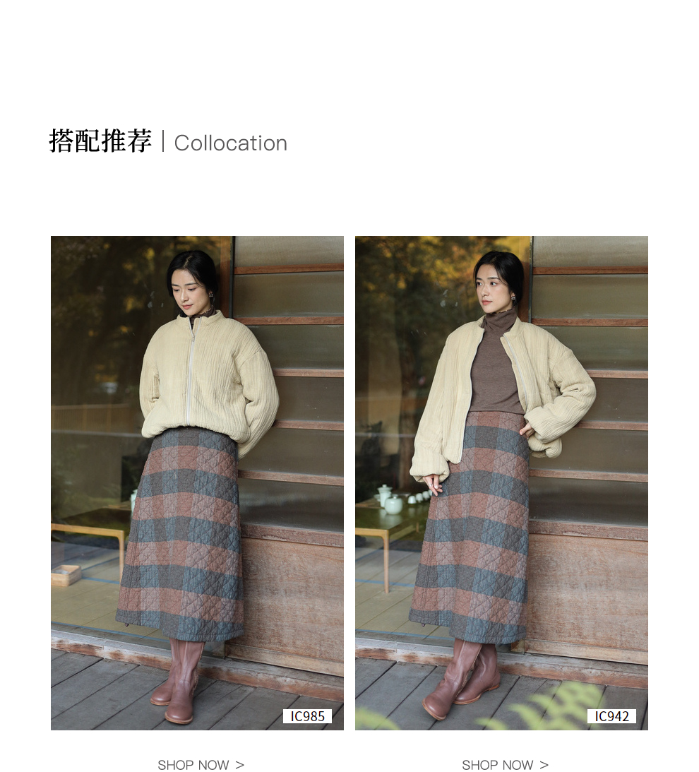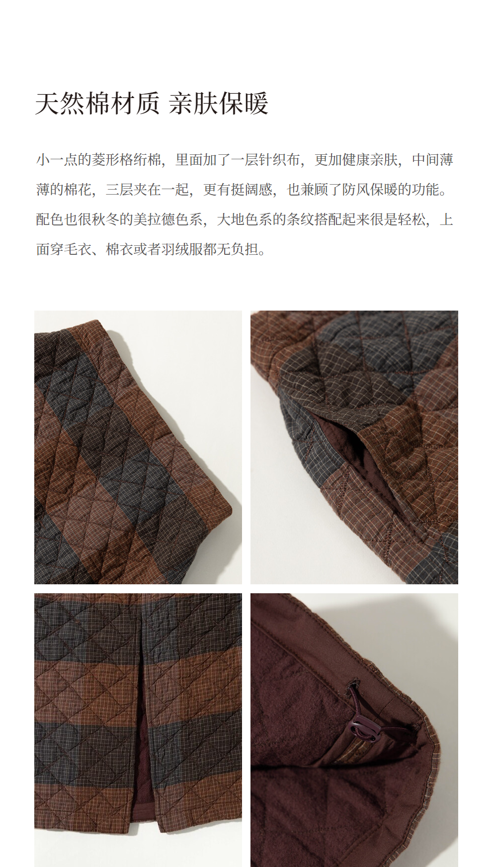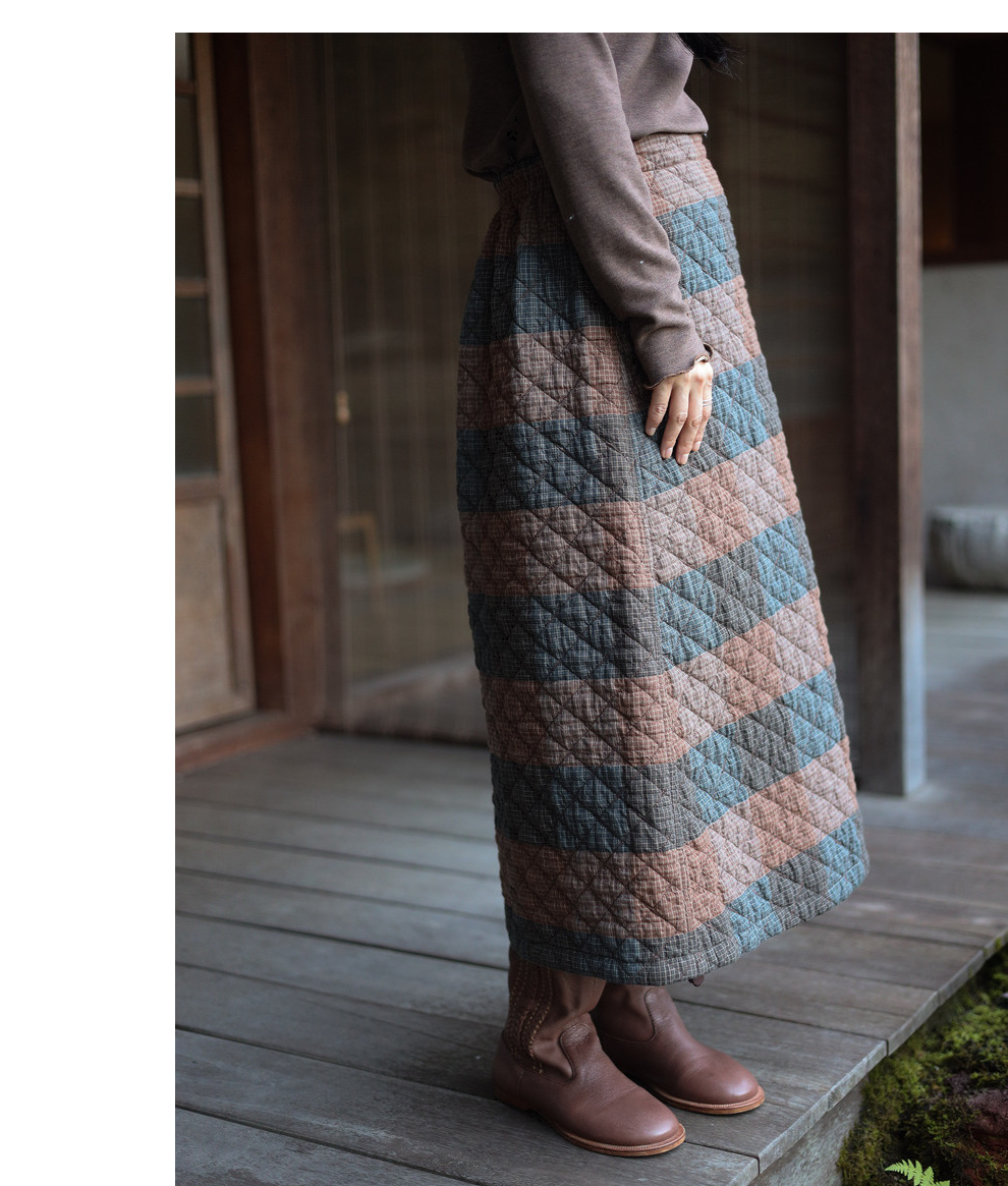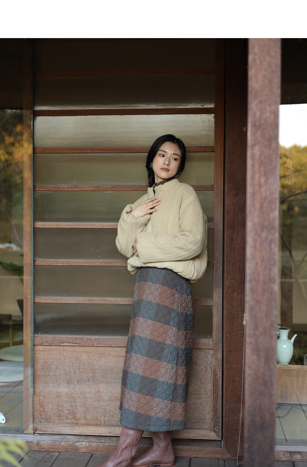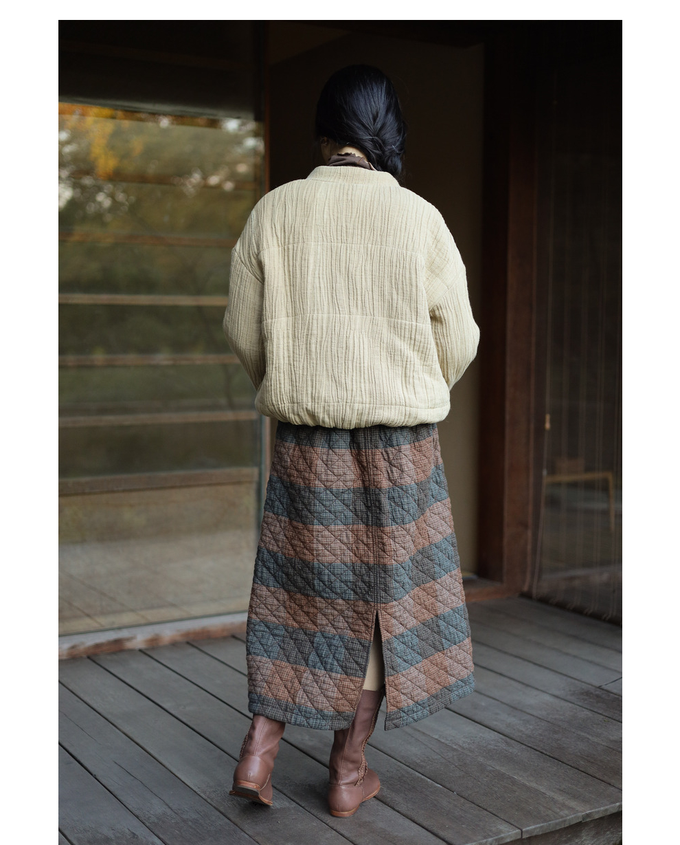 绽放971朵/【IP黄河记忆系列】菱形格绗棉宽条纹开衩中长款半身裙
