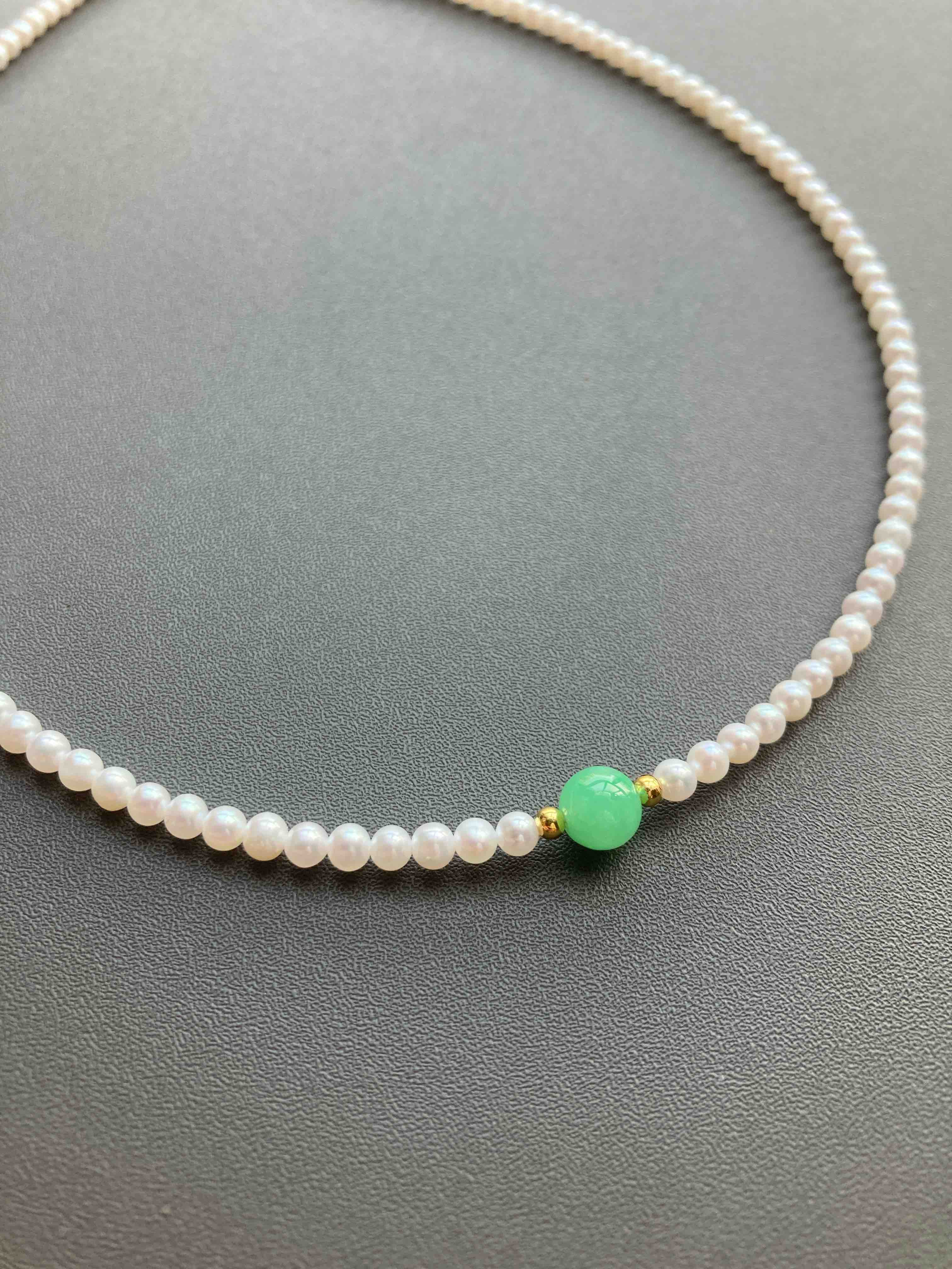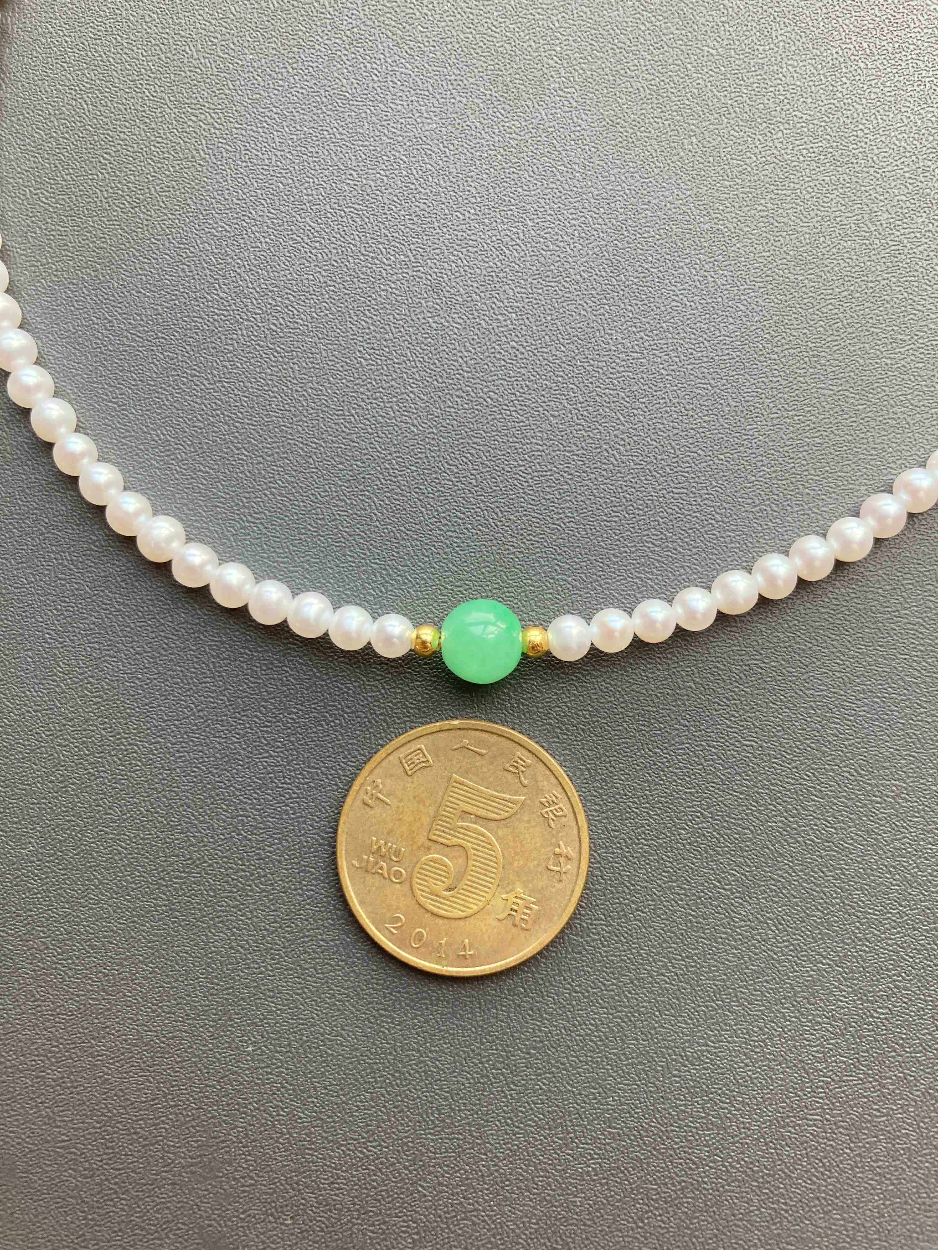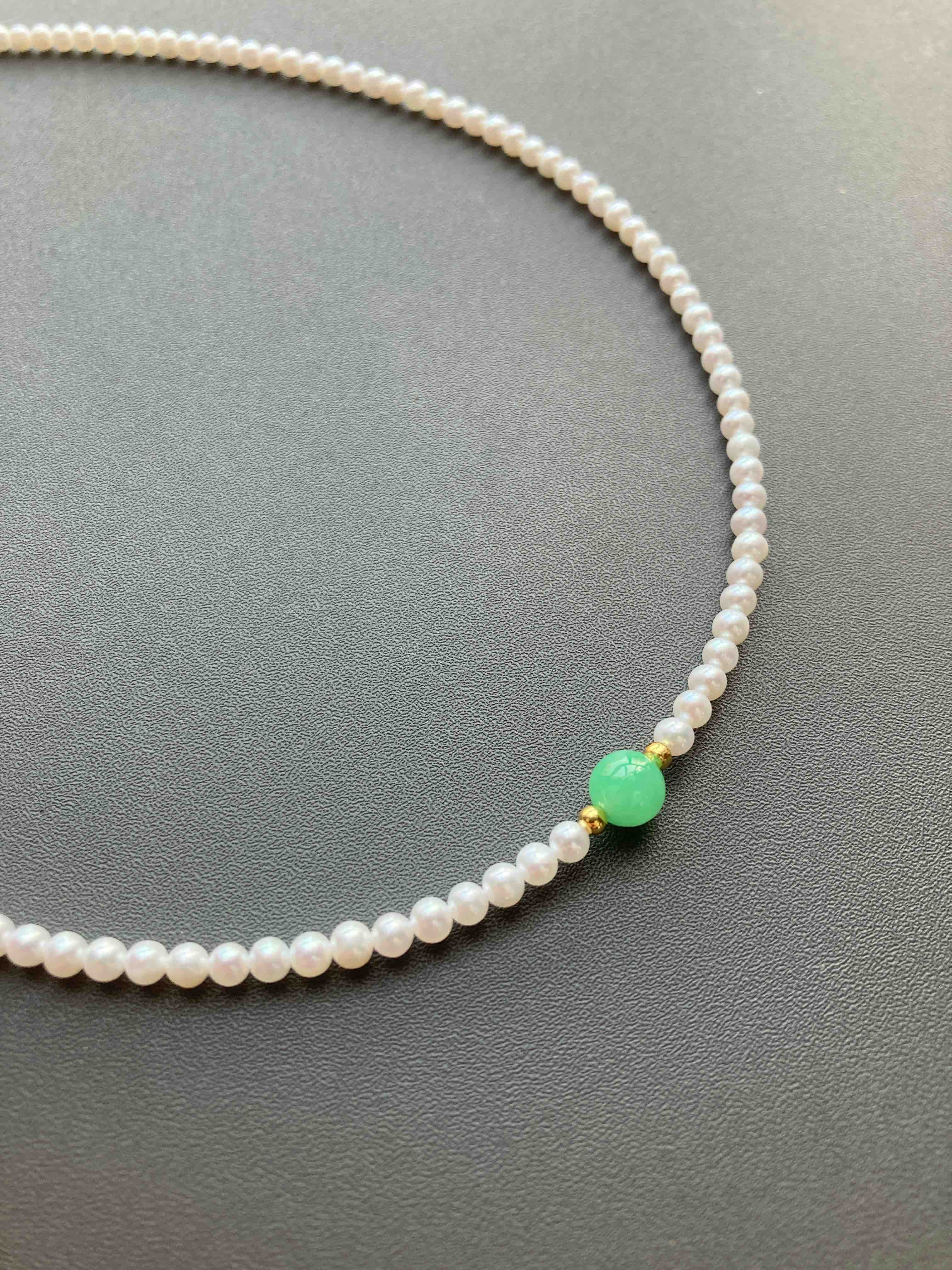 专业级珍珠与专业级翡翠的结合,5A级淡水无核baby珠项链天花板,正圆无瑕极强光,市面上一条就要一千多,我们加上缅甸阳绿翡翠珠子,总共才一千出头,禄来一出必属精品。珍珠3-3.5mm,翡翠珠子6.7mm,链长40cm加5cm可调延长链,全18k金镶嵌,下单开工串珠,一周内发货,珍珠佩戴请勿碰水,不要戴着洗澡
