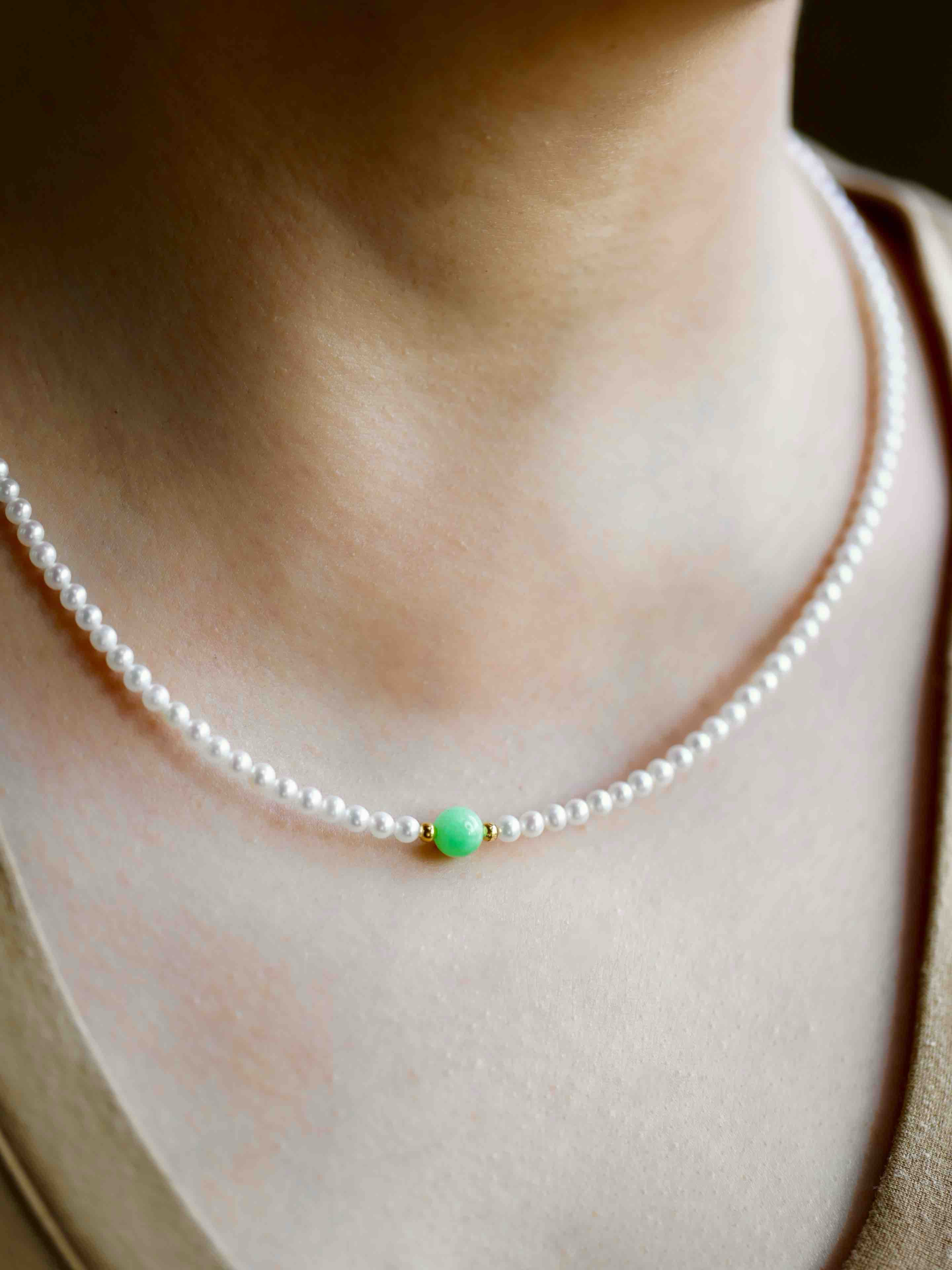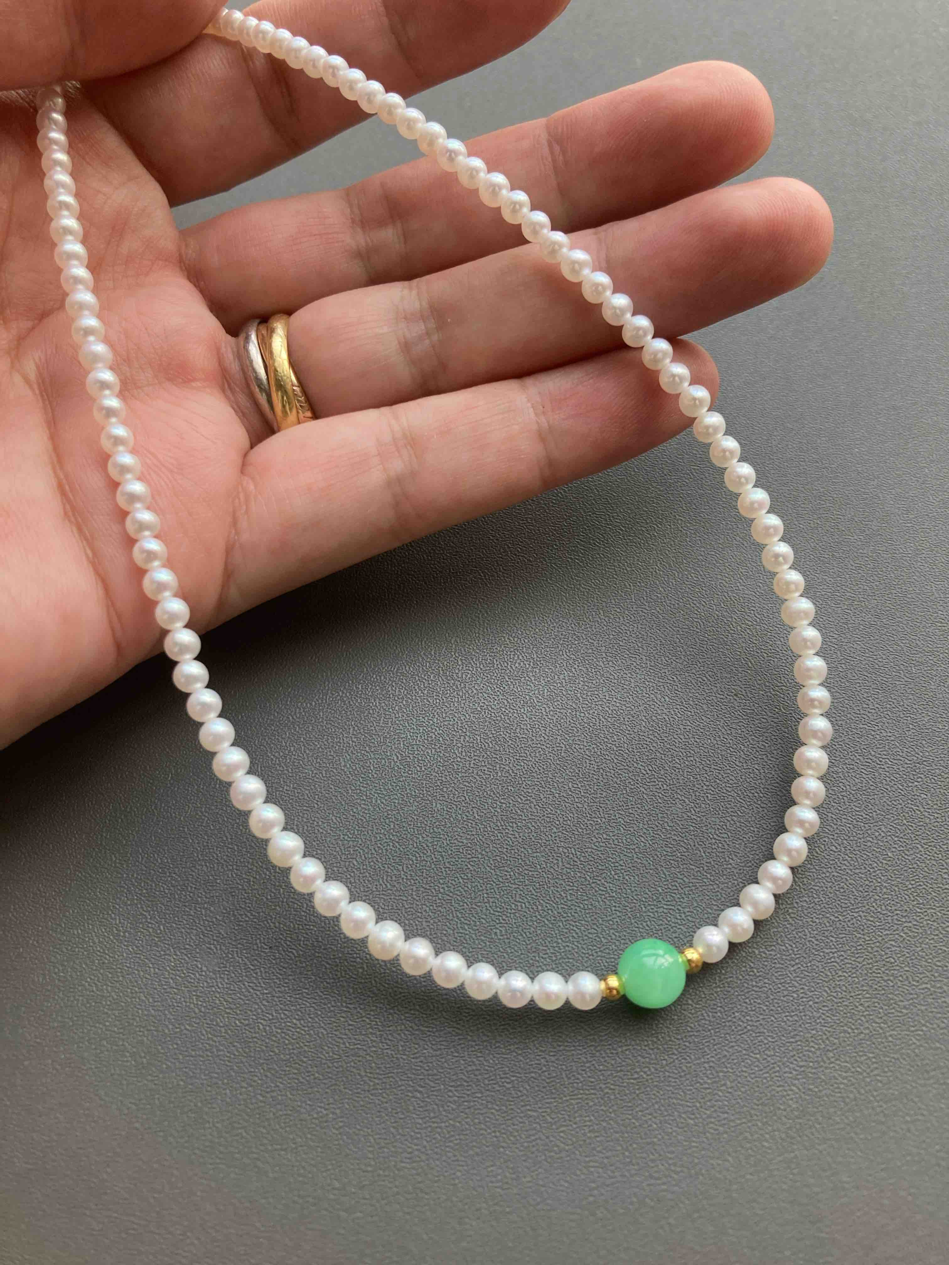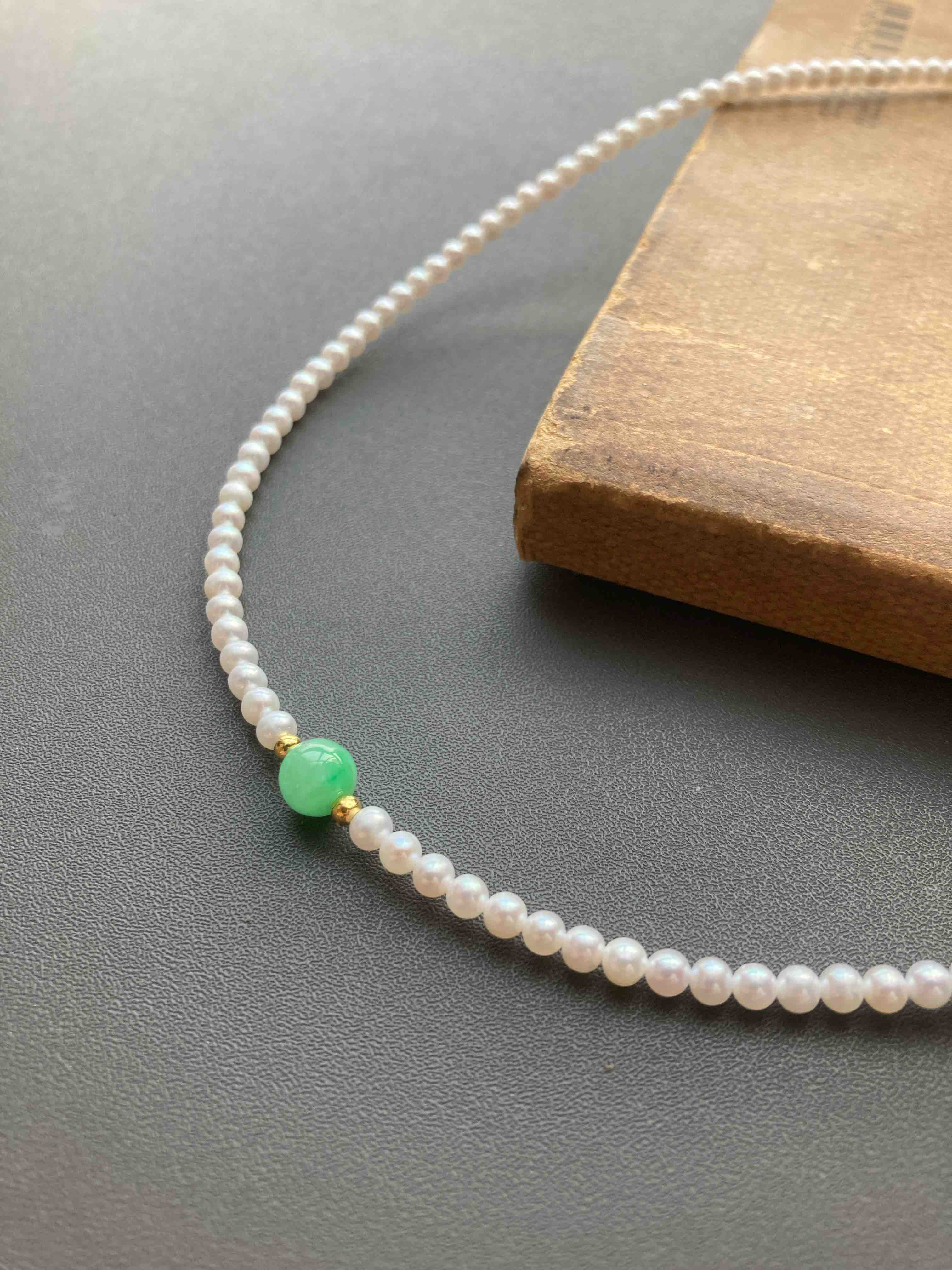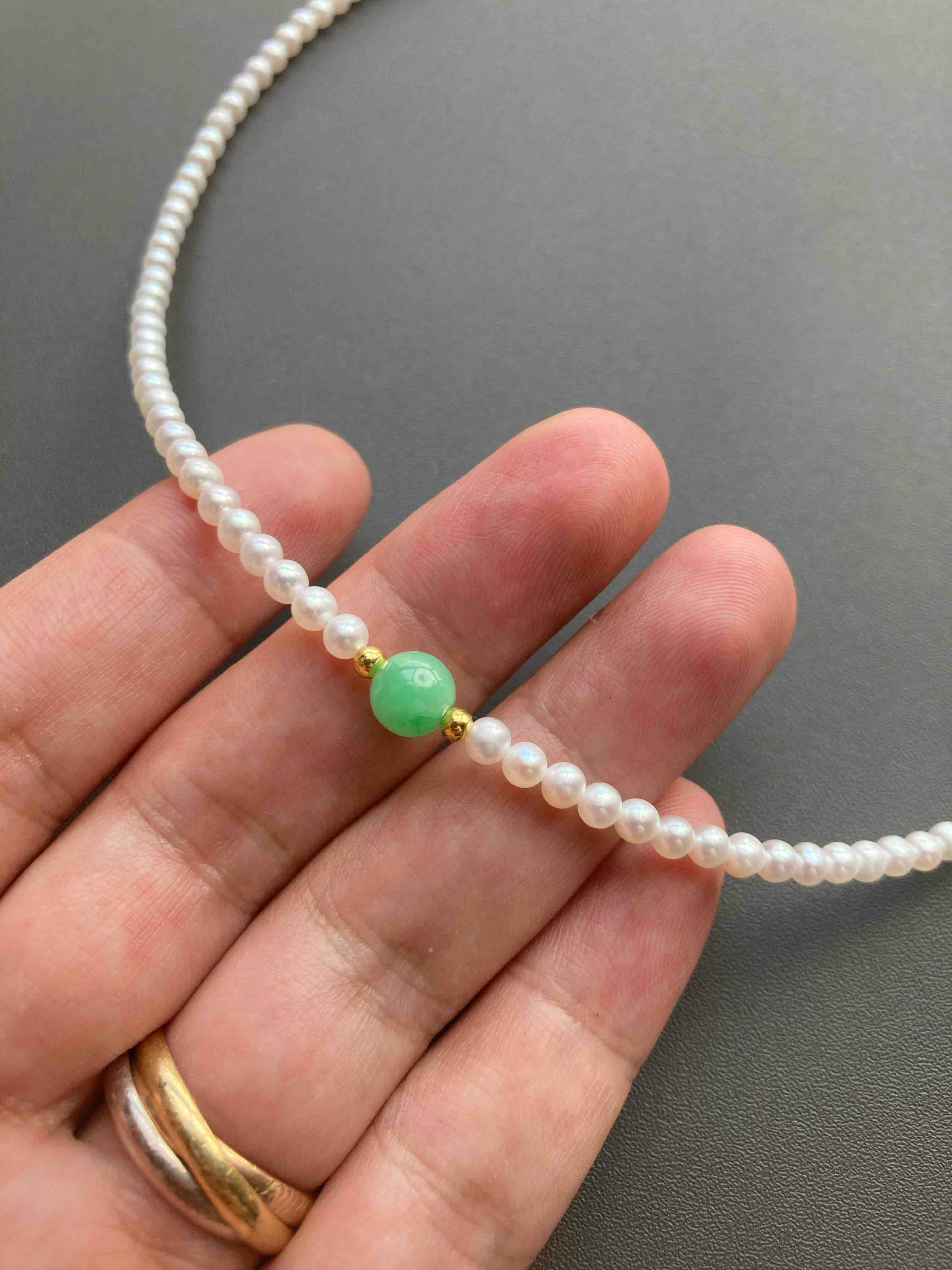 专业级珍珠与专业级翡翠的结合,5A级淡水无核baby珠项链天花板,正圆无瑕极强光,市面上一条就要一千多,我们加上缅甸阳绿翡翠珠子,总共才一千出头,禄来一出必属精品。珍珠3-3.5mm,翡翠珠子6.7mm,链长40cm加5cm可调延长链,全18k金镶嵌,下单开工串珠,一周内发货,珍珠佩戴请勿碰水,不要戴着洗澡