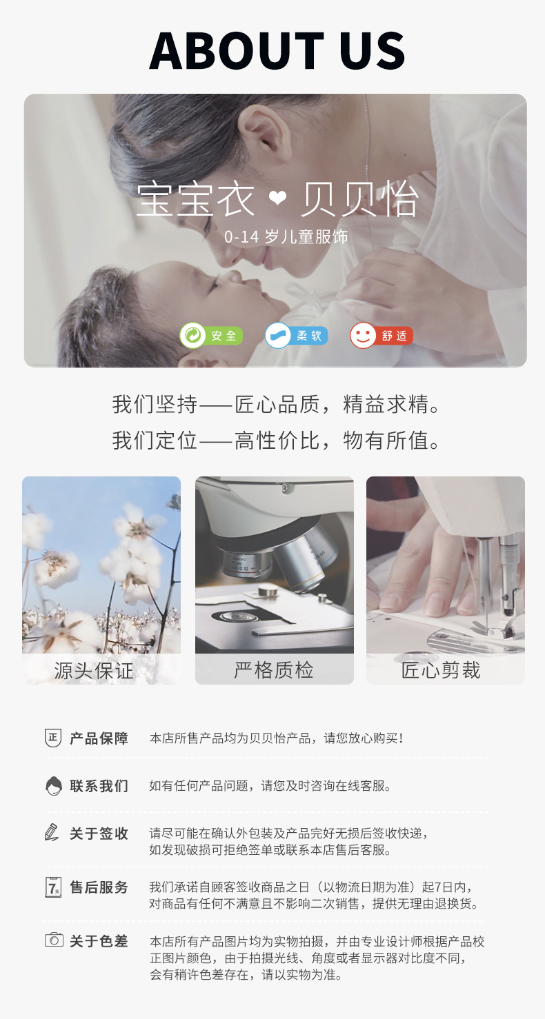 - 贝贝怡专注0-6岁婴幼儿服饰,坚持安全、柔软、舒适的产品理念,为千万中国家庭提供超高品质、安全可靠的婴幼儿服饰产品,妈妈放心,宝宝开心!