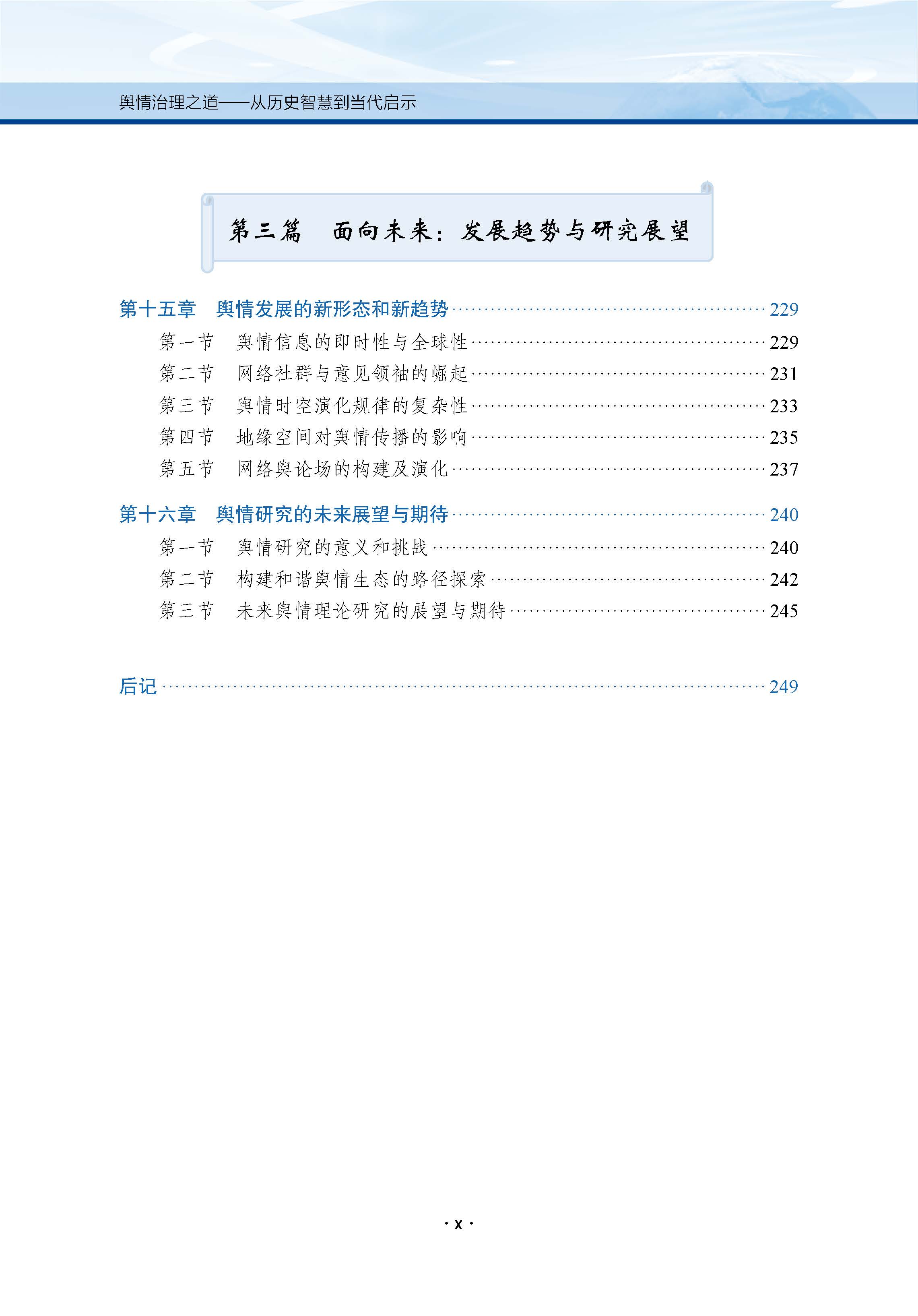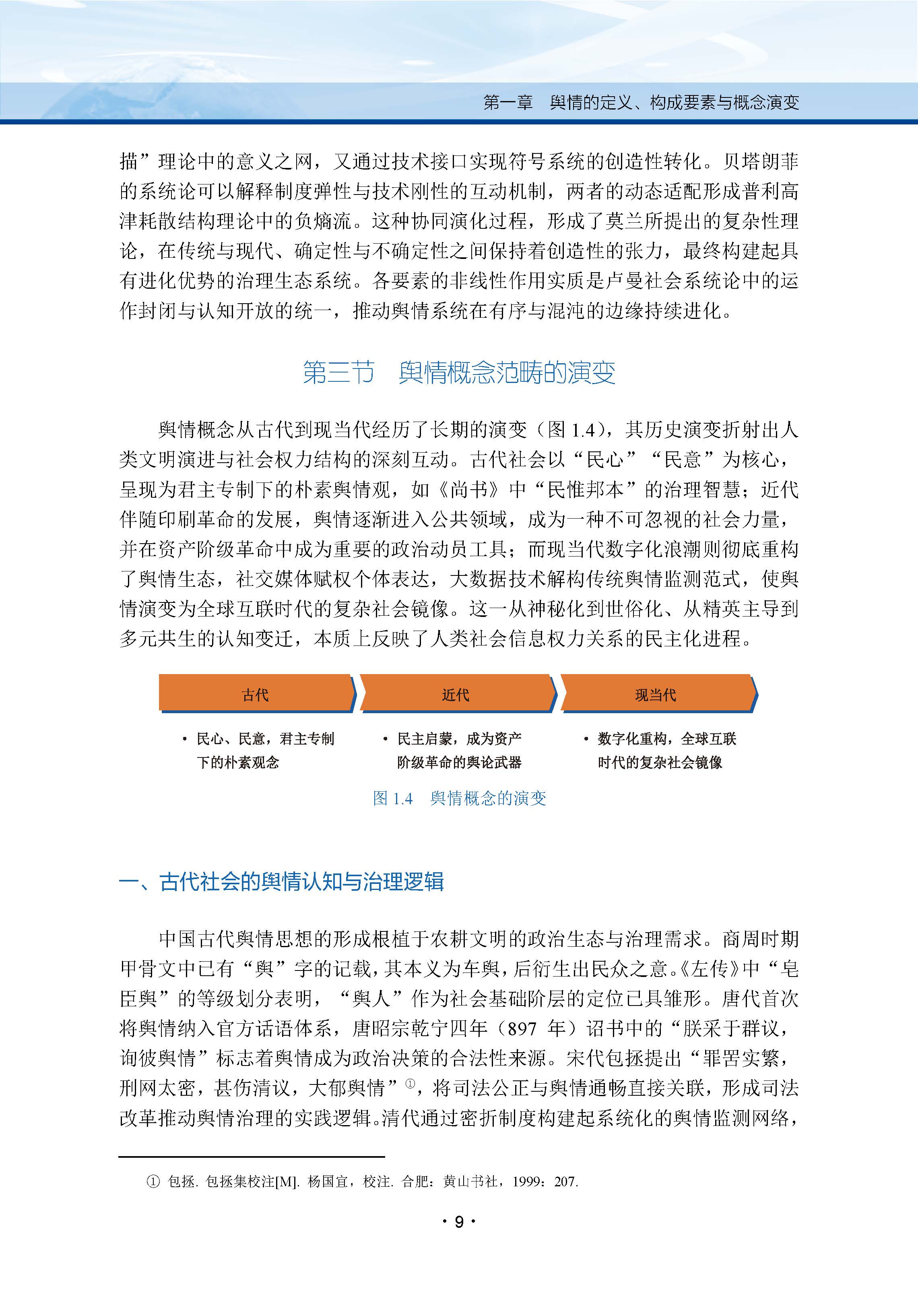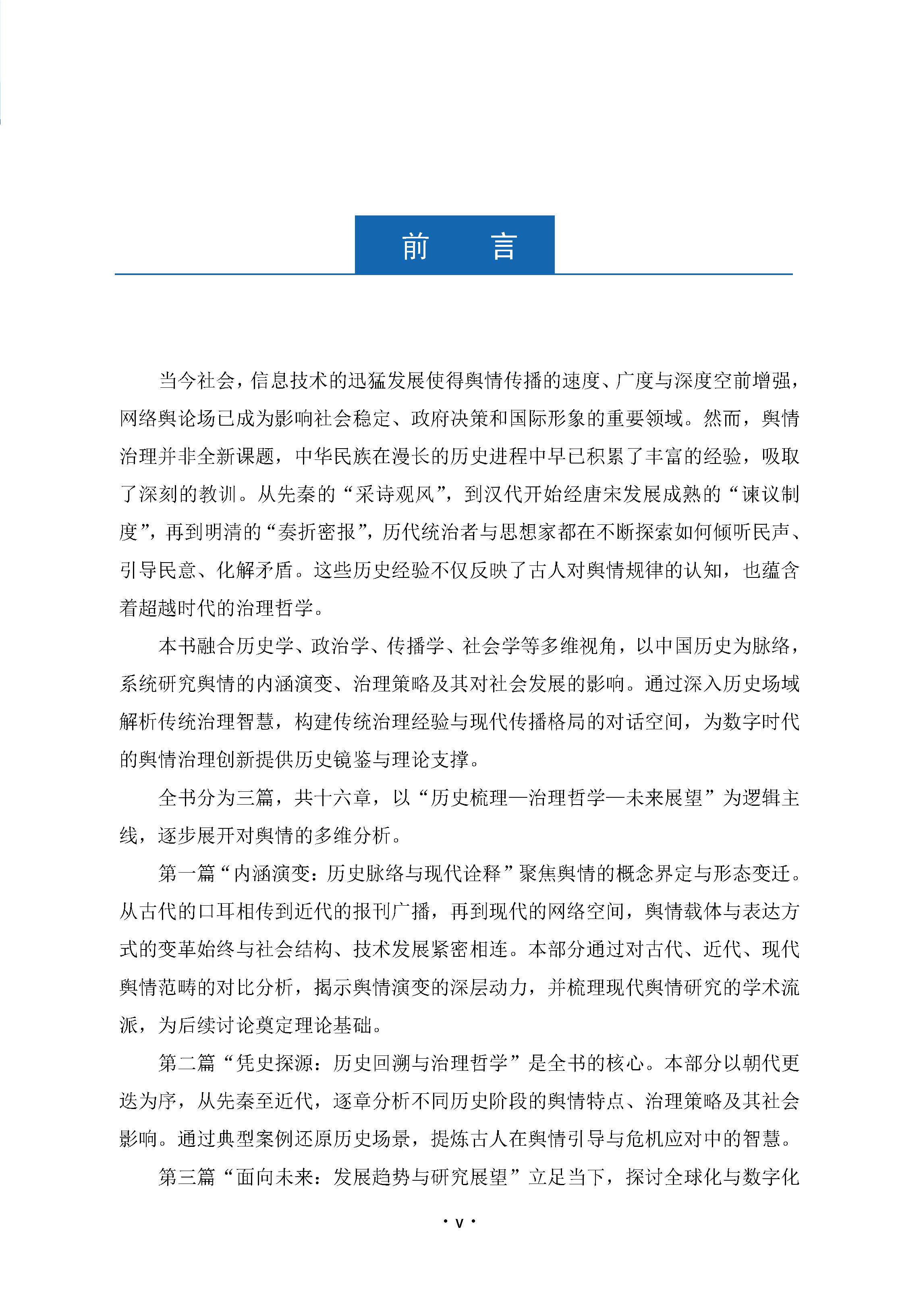 本书系统梳理了舆情从古至今的内涵演变、历史脉络及未来展望。全书分为三篇:第一篇剖析舆情的内涵演变,包括其定义、构成要素及古今概念范畴的演变,并总结了现代舆情研究的四大流派;第二篇凭史探源,以朝代为主线,分析先秦至近代舆情的时代特点、传播形式及典型案例,揭示历史舆情的现实价值;第三篇面向未来,探讨舆情发展的新趋势及研究展望。本书将历史视角与现代理论相结合,既注重舆情的理论建构,又通过丰富的历史案例提供实践启示,为理解舆情与社会治理的关系提供了全新视角。