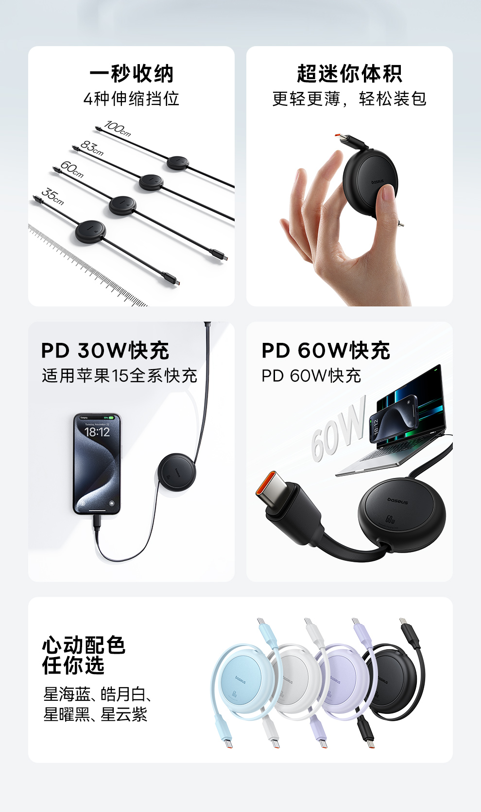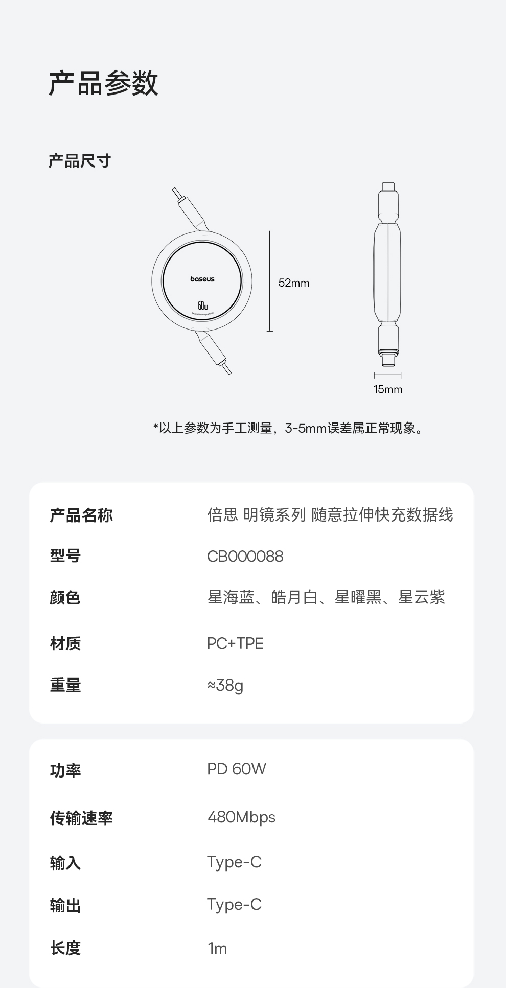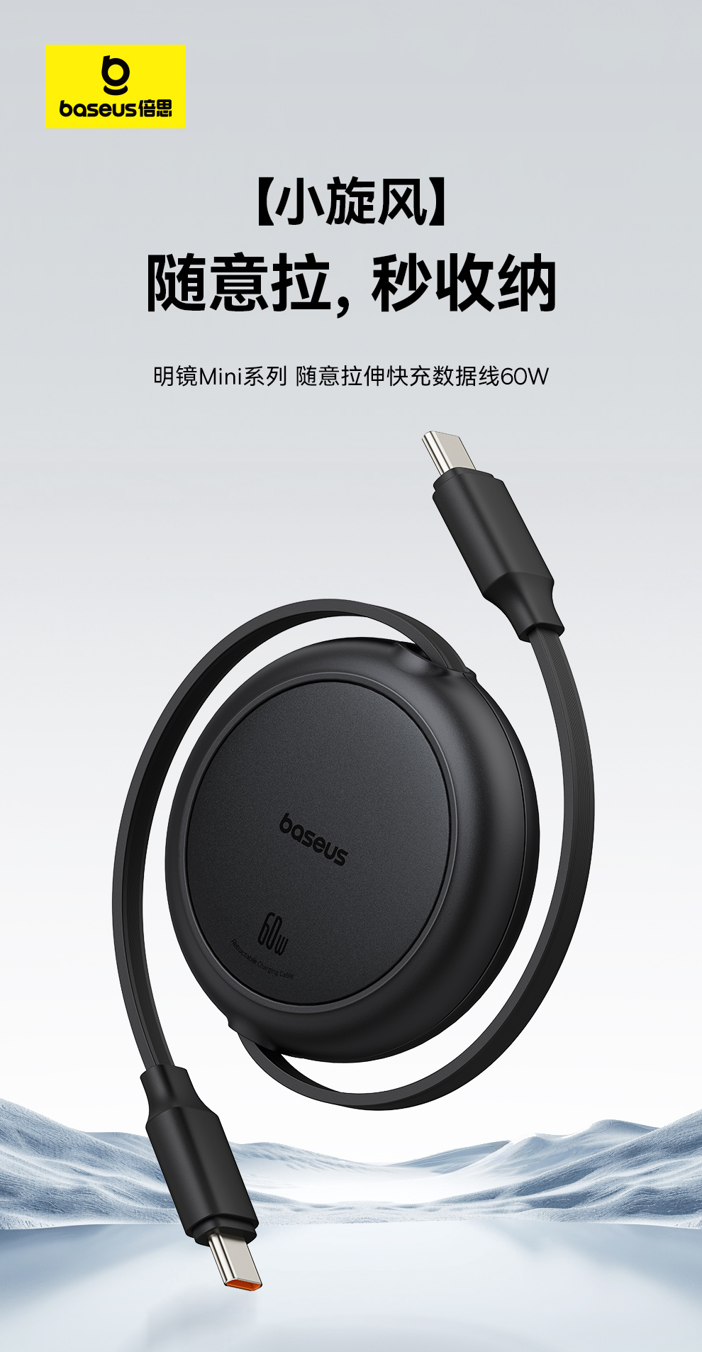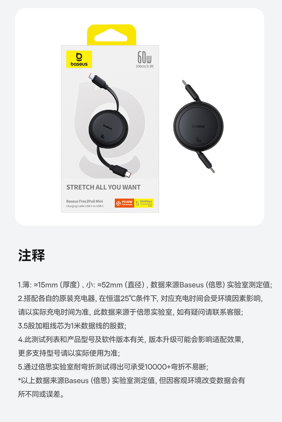 【69元3件】倍思 明镜Mini系列 随意拉伸快充数据线 Type-C to Type-C 60W