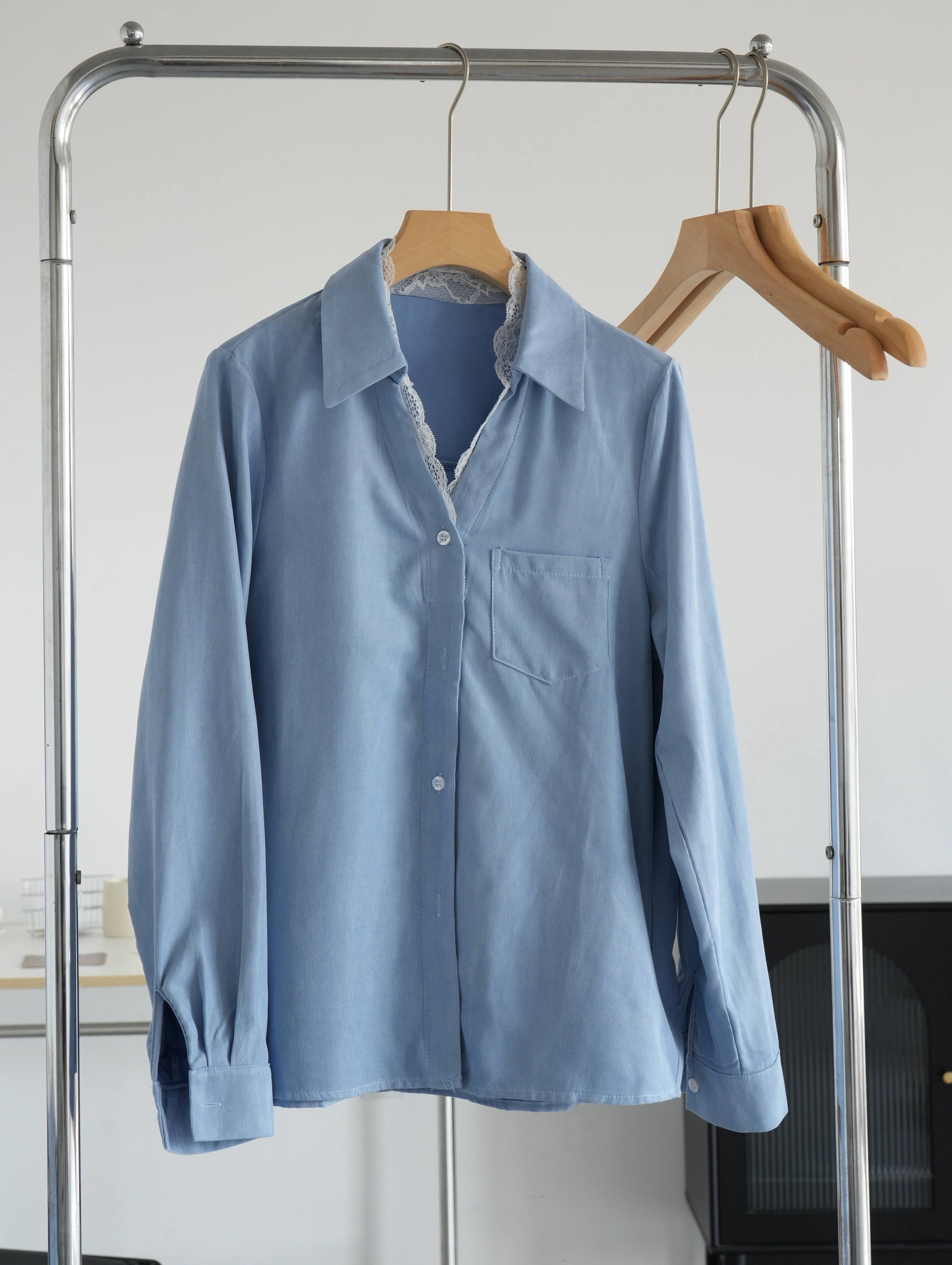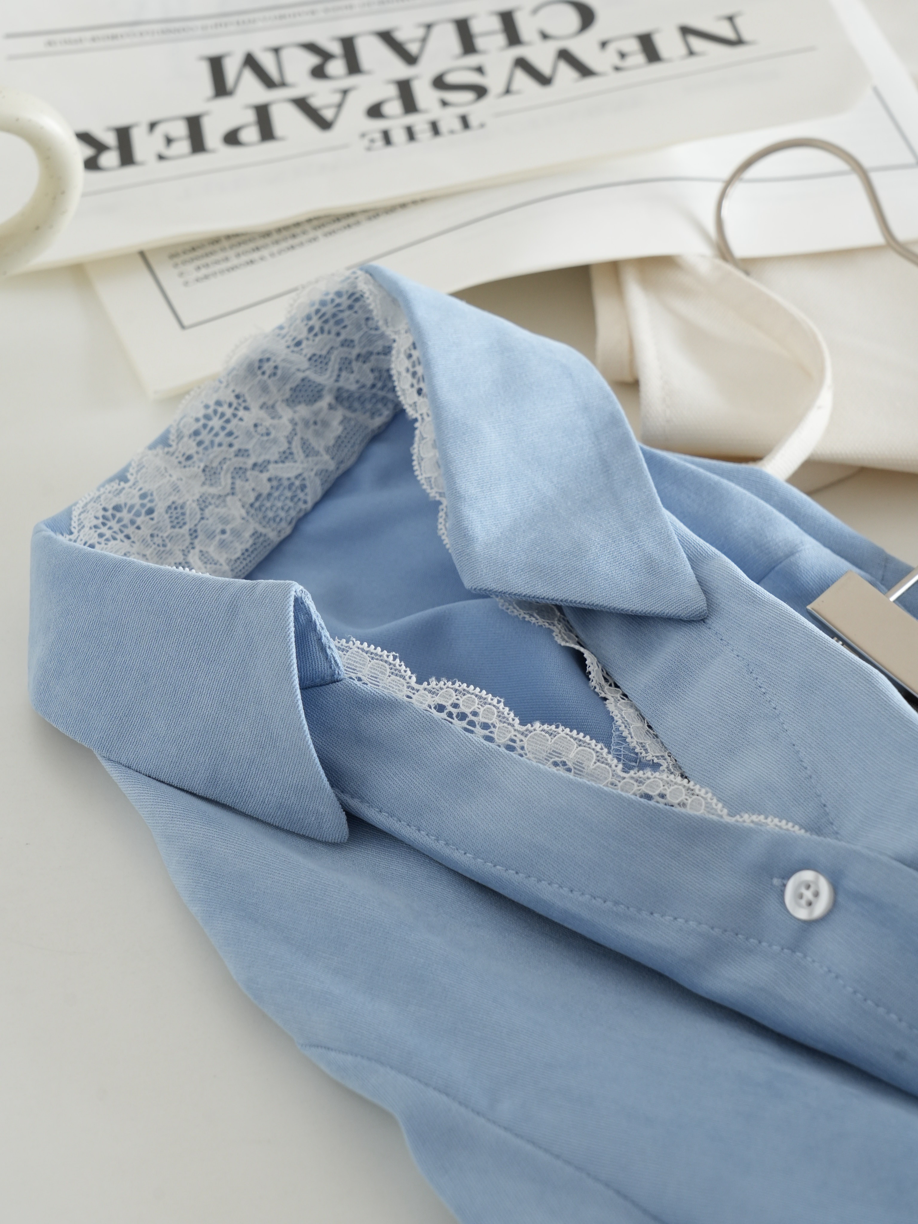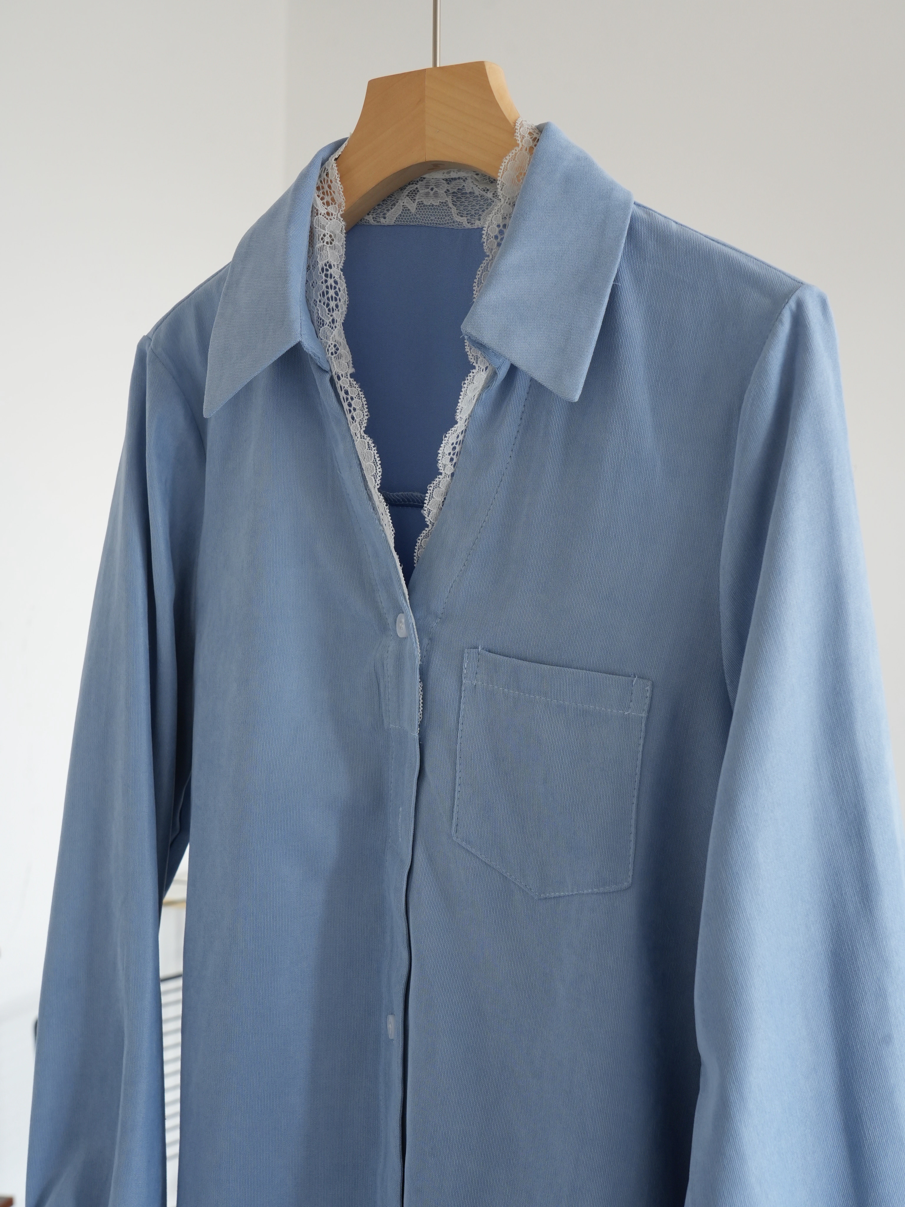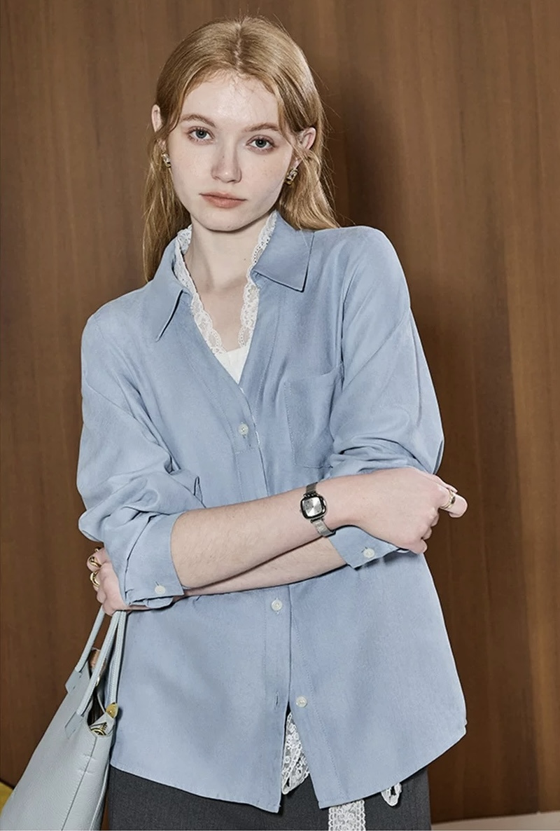 超显白黄黑皮必备~这件春日蕾丝拼接蓝衬衫真的要夸爆~颜值超高,质感超绝,实用性价爆表 ,梭织垂感面料拼接蕾丝,自带光泽感,像给皮肤开了柔光滤镜,整个人都散发温柔的气质,不需要刻意搭配,单穿就吸引人注目,内搭增添品味细节,喜欢的要把这件焊在身上!
