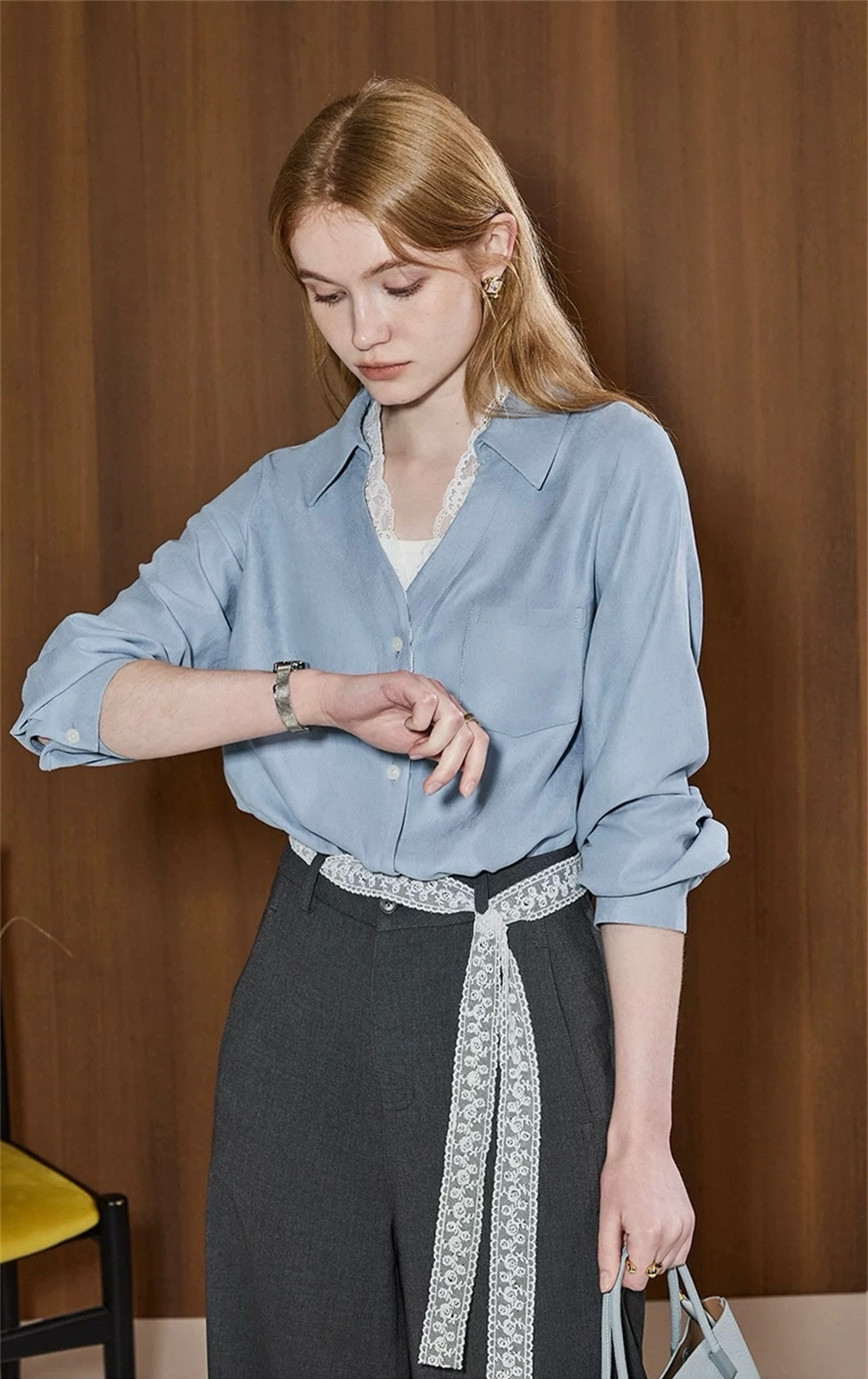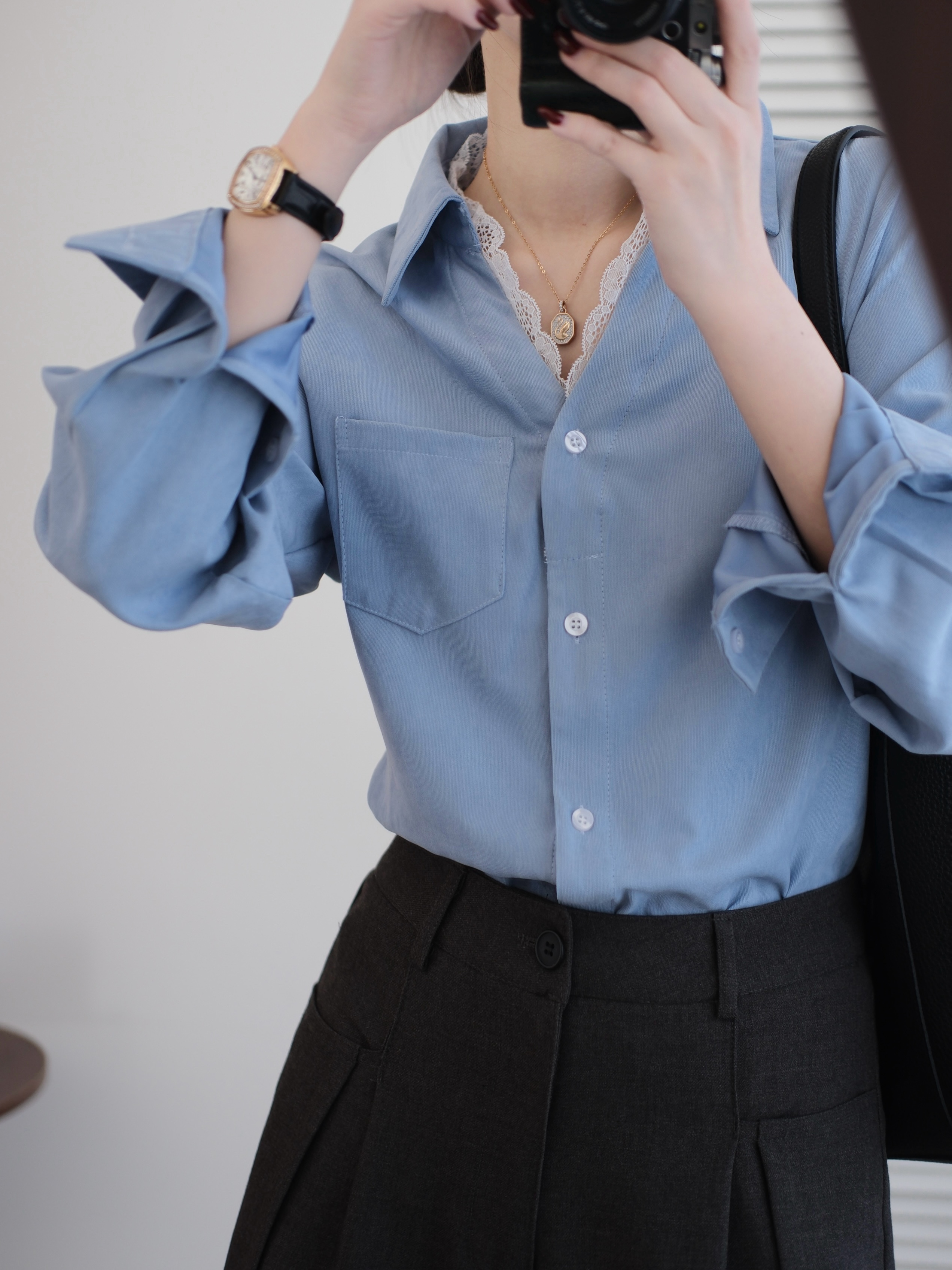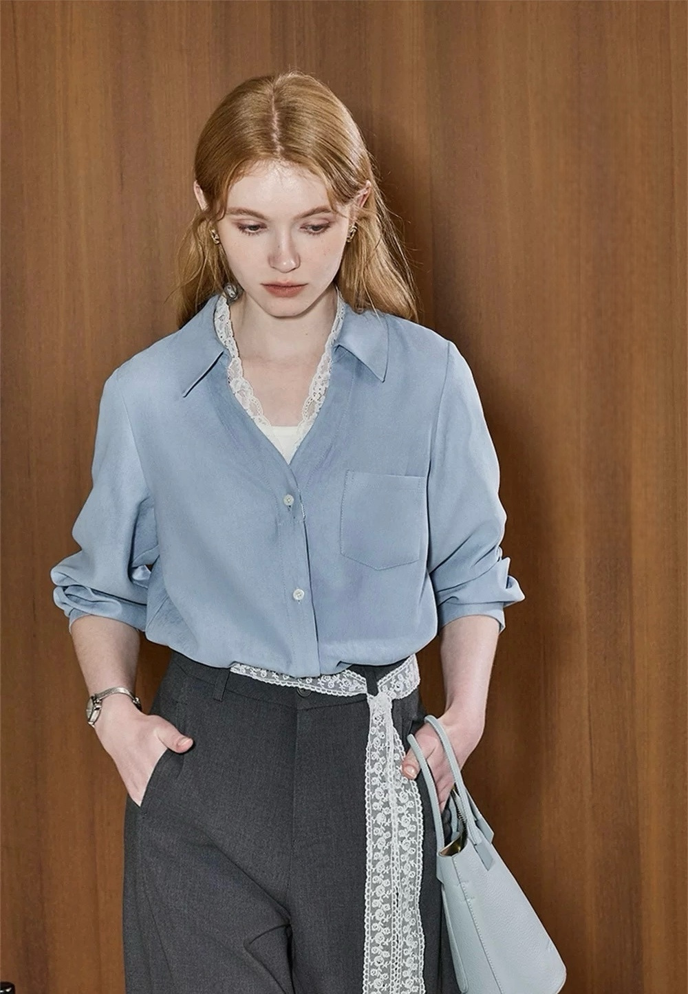 超显白黄黑皮必备~这件春日蕾丝拼接蓝衬衫真的要夸爆~颜值超高,质感超绝,实用性价爆表 ,梭织垂感面料拼接蕾丝,自带光泽感,像给皮肤开了柔光滤镜,整个人都散发温柔的气质,不需要刻意搭配,单穿就吸引人注目,内搭增添品味细节,喜欢的要把这件焊在身上!
