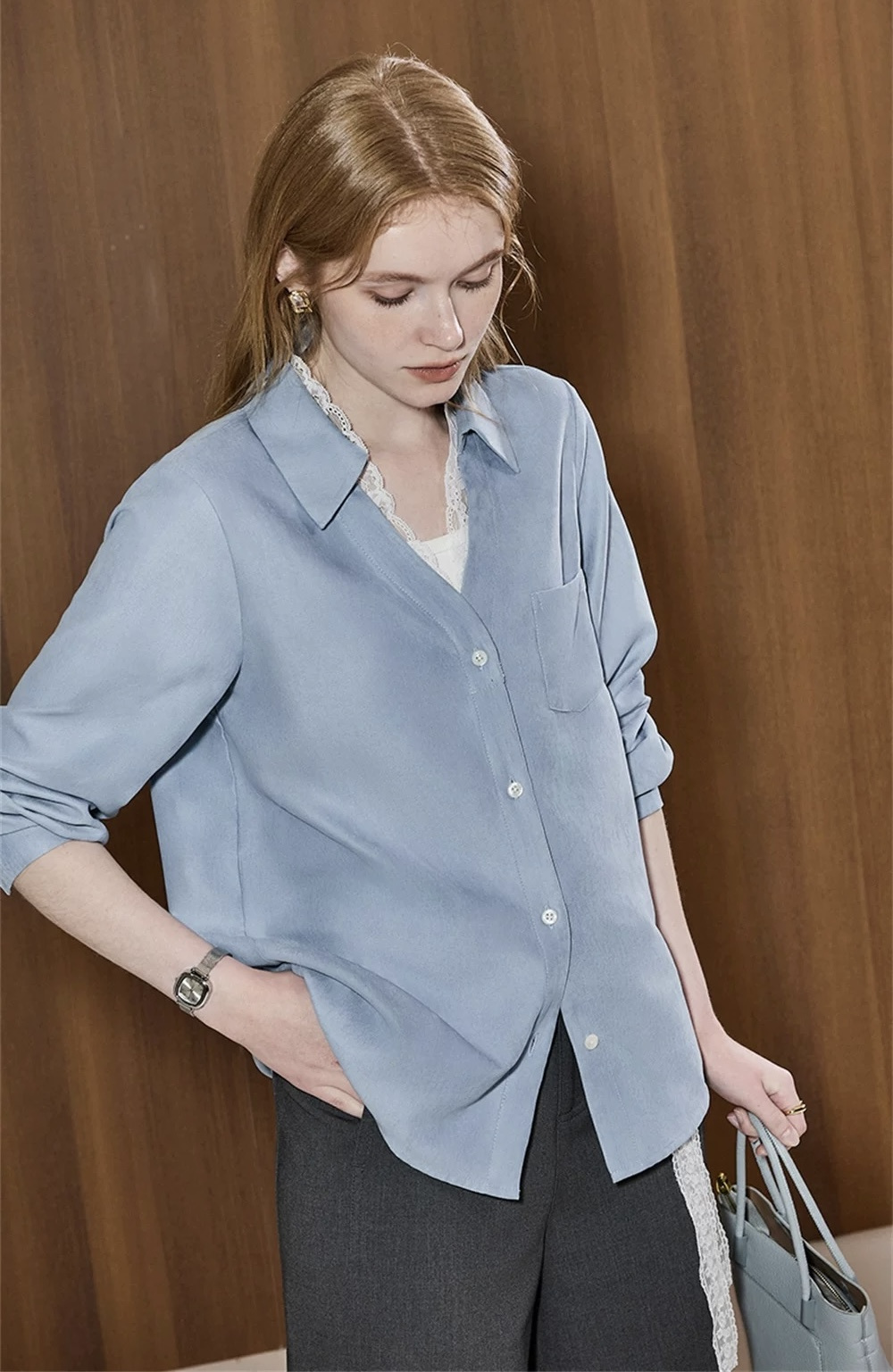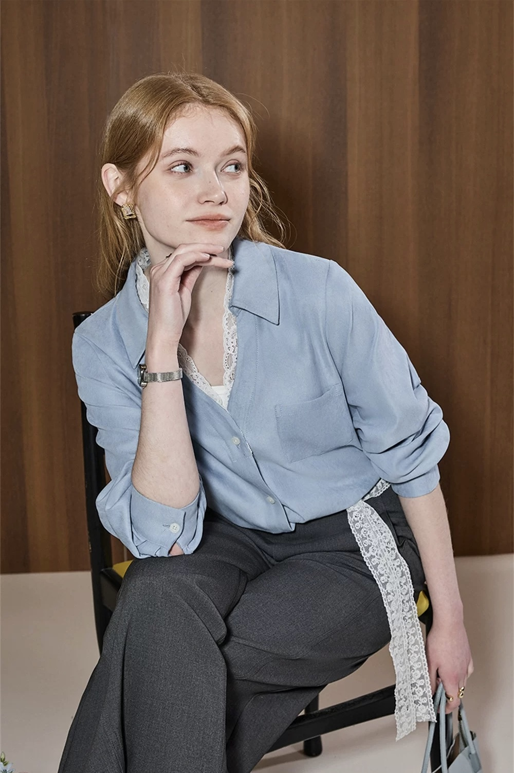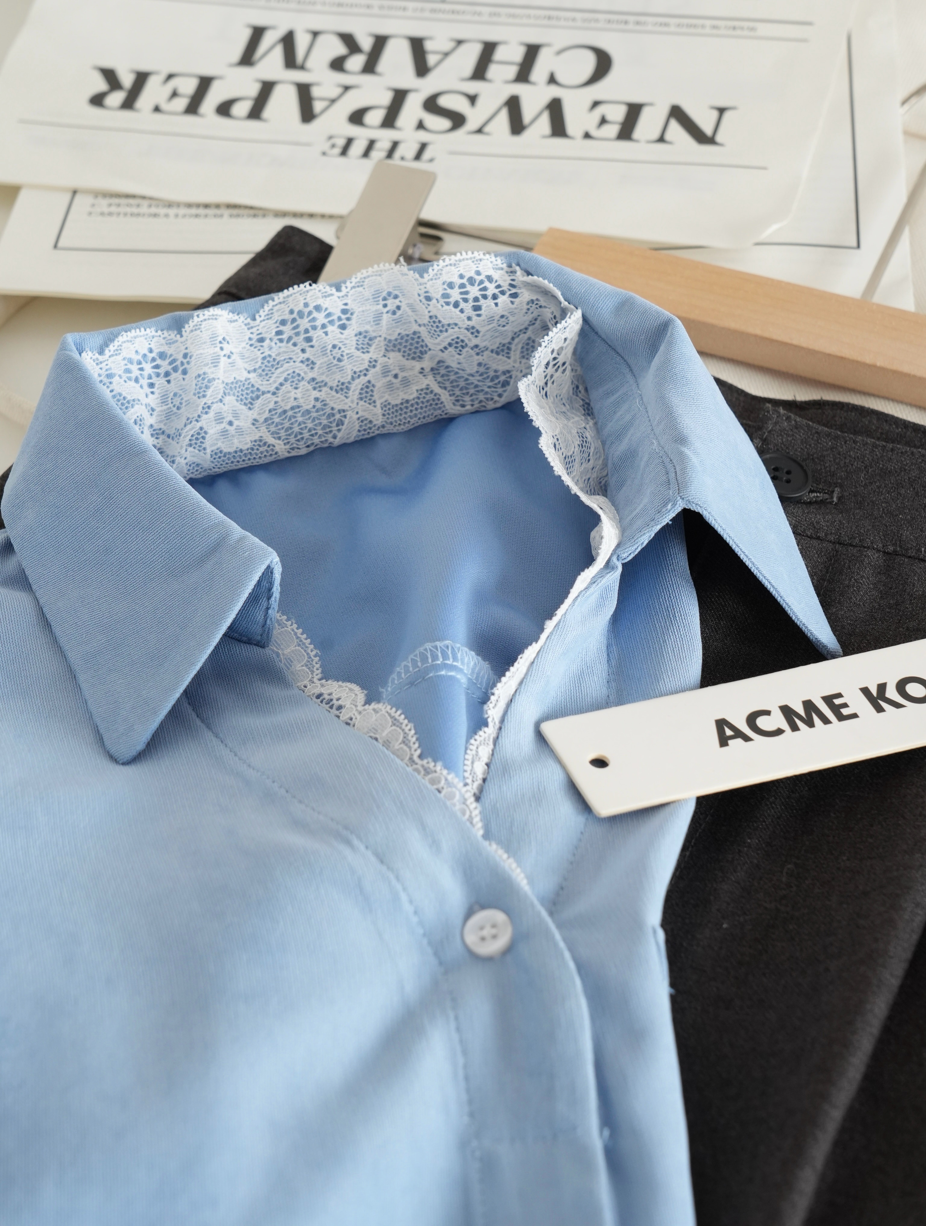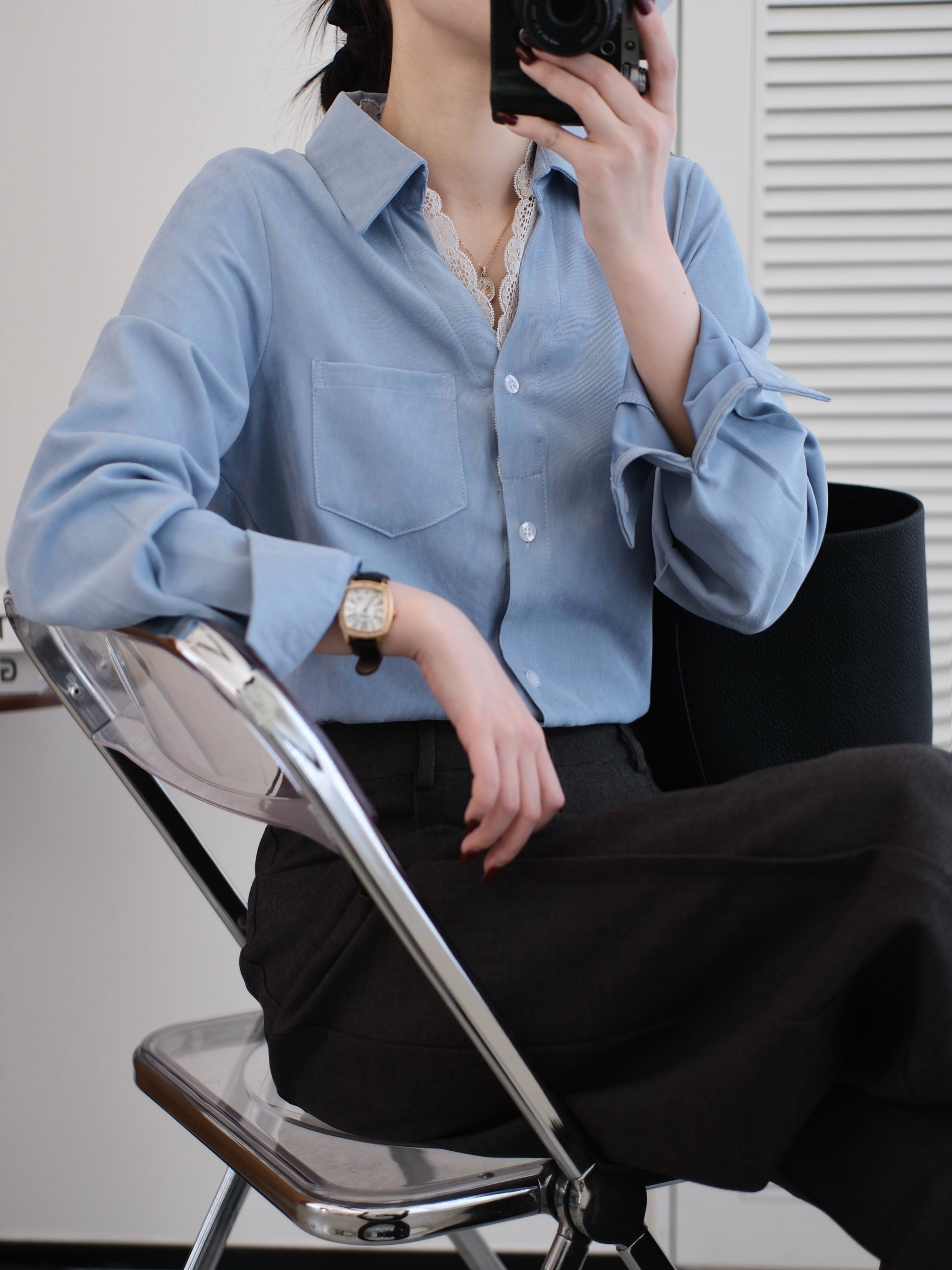 超显白黄黑皮必备~这件春日蕾丝拼接蓝衬衫真的要夸爆~颜值超高,质感超绝,实用性价爆表 ,梭织垂感面料拼接蕾丝,自带光泽感,像给皮肤开了柔光滤镜,整个人都散发温柔的气质,不需要刻意搭配,单穿就吸引人注目,内搭增添品味细节,喜欢的要把这件焊在身上!