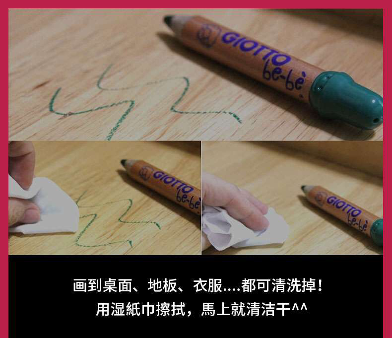 4. 画到桌面,地板,衣服…都可以清洗掉!用湿纸巾擦拭,马上就清洁干净。