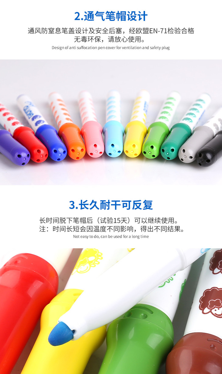 3. 安全无毒,墨水经过欧盟皮肤敏感检测合格,可水洗,不小心画到衣服,用温水和肥皂就可以洗干净!!