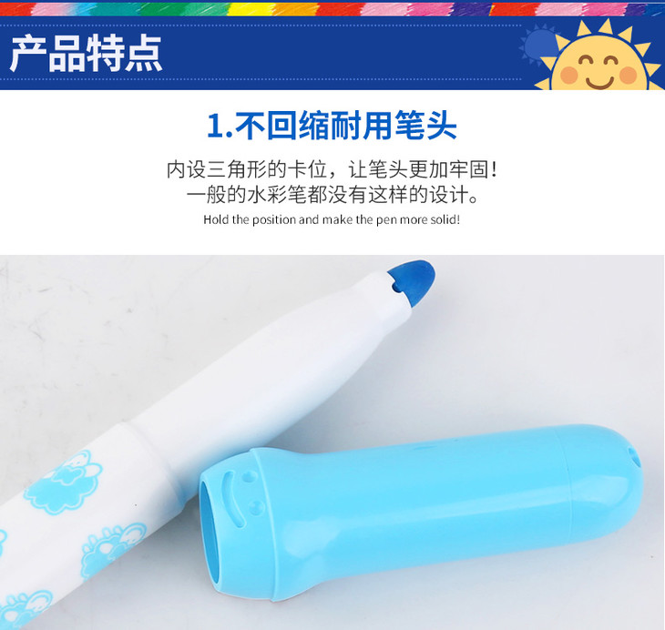 2. 笔盖上有一个微笑的小笑脸表情,小朋友会很喜欢,顶端开孔防窒息,防啃咬设计,不可拆卸。
