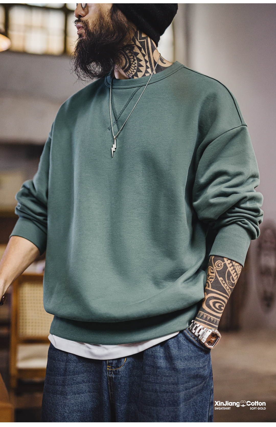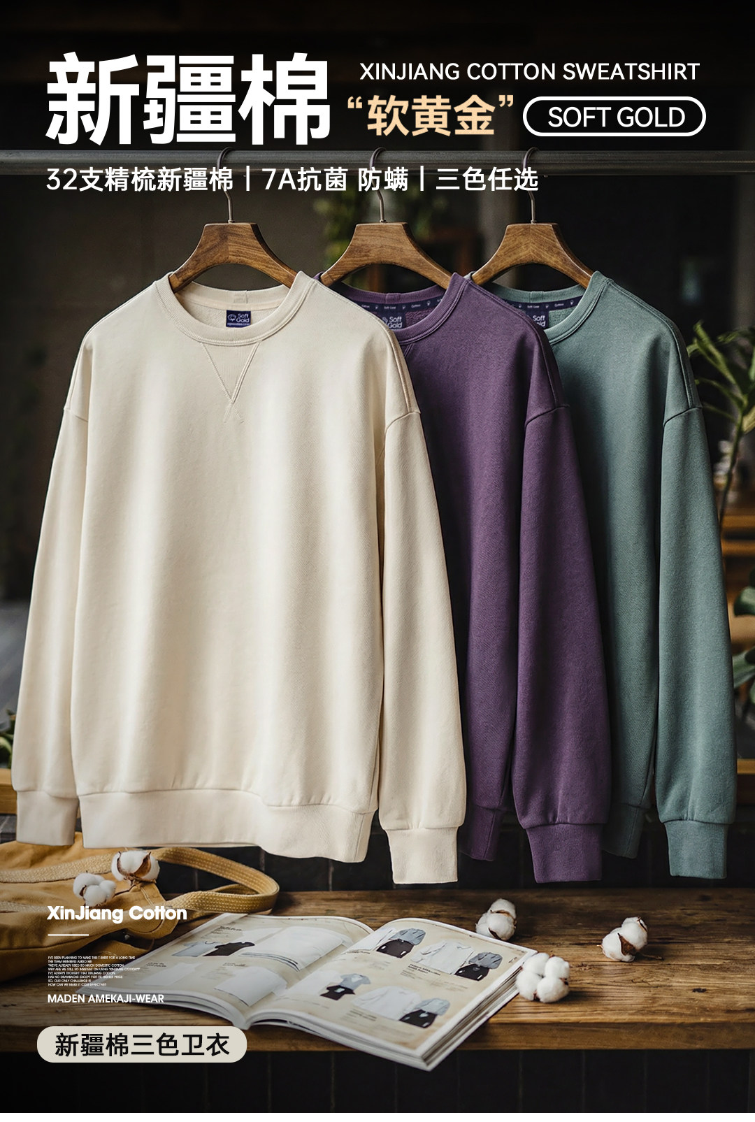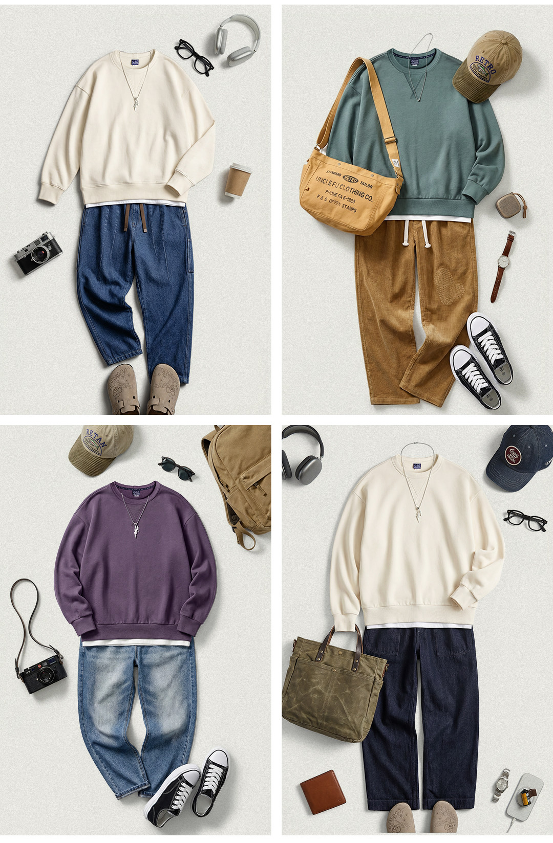 马登工装美式新疆棉卫衣紫色圆领套头无帽外穿宽松长袖外套男款春