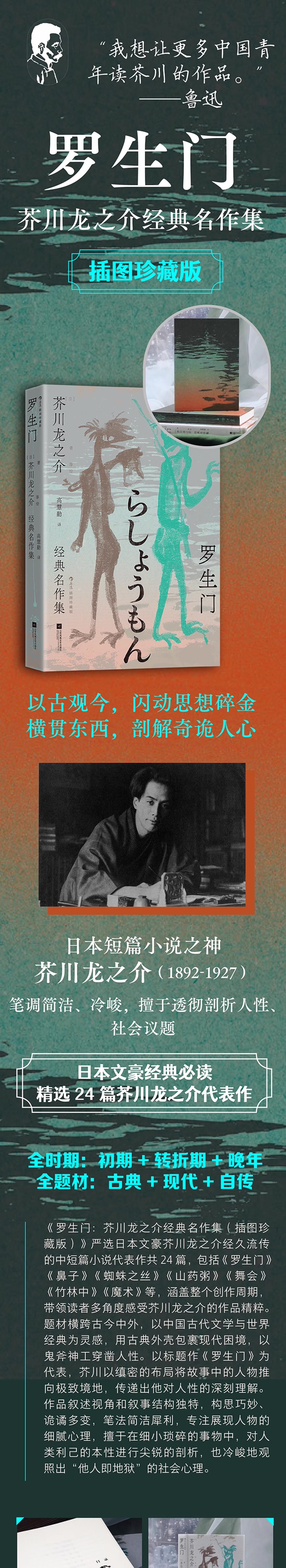 《罗生门:芥川龙之介经典名作集(插图珍藏版)》严选日本文豪芥川龙之介经久流传的中短篇小说代表作共24篇,包括《罗生门》《鼻子》《蜘蛛之丝》《山药粥》《舞会》《竹林中》《魔术》等,涵盖整个创作周期,带领读者多角度感受芥川龙之介的作品精粹。以标题作《罗生门》为代表,芥川以缜密的布局将故事中的人物推向极致境地,传递出他对人性的深刻理解。作品叙述视角和叙事结构独特,构思巧妙、诡谲多变,笔法简洁犀利,专注展现人物的细腻心理,擅于在细小琐碎的事物中,对人类利己的本性进行尖锐的剖析,也冷峻地观照出“他人即地狱”的社会心理。本书插图选用芥川龙之介本人创作的绘画、墨书,如河童图、妖怪图、山水草木图,以及俳句、汉诗等洒脱的挥毫之作。