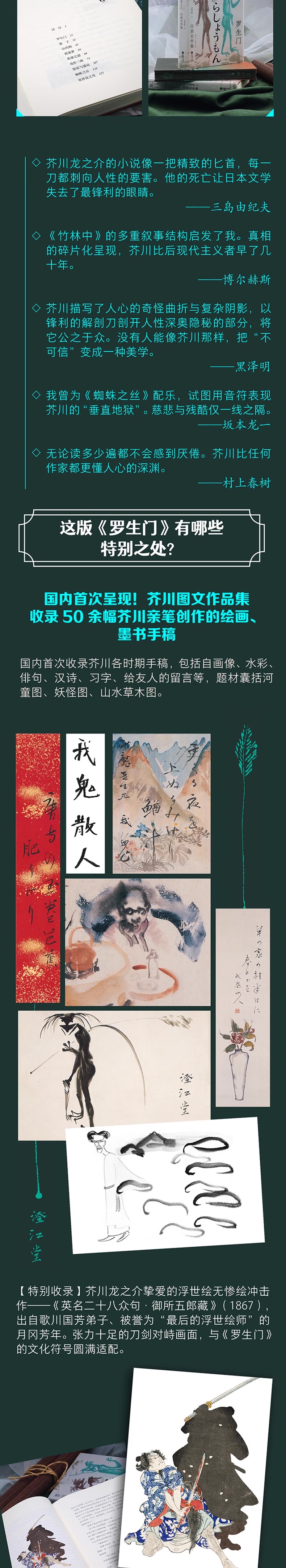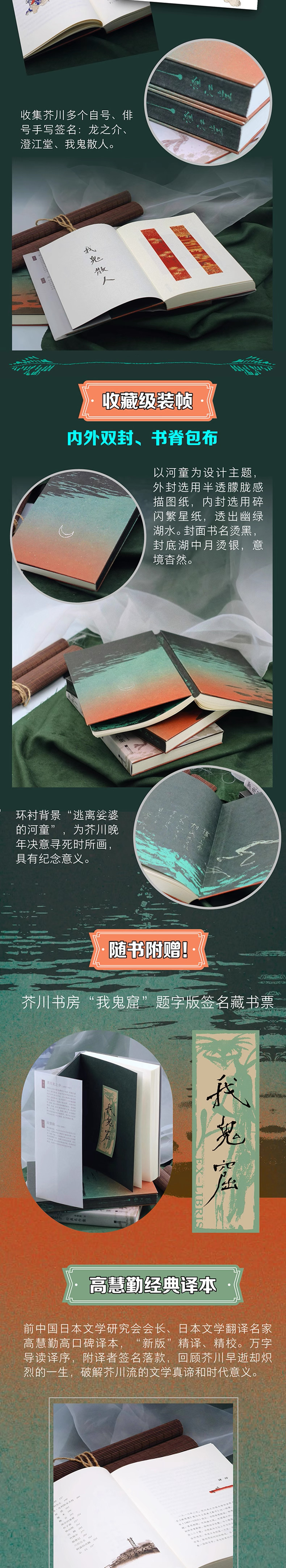 ○全时期:初期+转折期+晚年。全题材:古典+现代+自传。全方位欣赏芥川锐利多变的书写风貌。