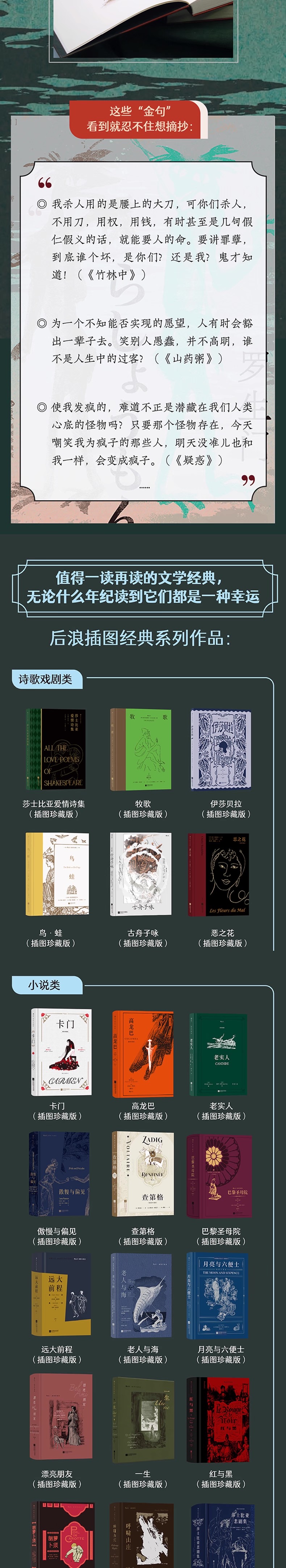 ·严选《罗生门》《竹林中》《鼻子》等24篇芥川必读代表作。题材横跨古今中外,以中国古代文学与世界经典为灵感,用古典外壳包裹现代困境,以鬼斧神工穿凿人性。