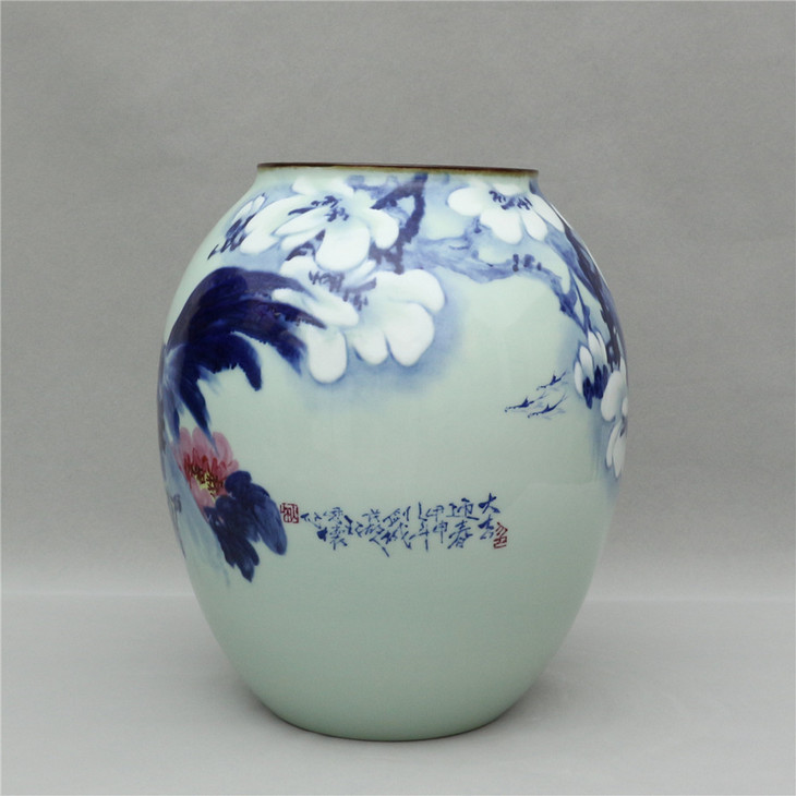 王恩怀先生从小随其父王步学艺,王步乃民国青花大王。王恩怀后师从“珠山八友”之一刘雨岑先生,1993年被授予“中国工艺美术大师”称号。其博采百家融会贯通,以时代变通创出新艺探索。许多作品被国外博物馆、美术馆珍藏。此器釉面肥厚,青花纹色青翠,器形端庄,图样吉祥,呈现王老的新工艺追求。