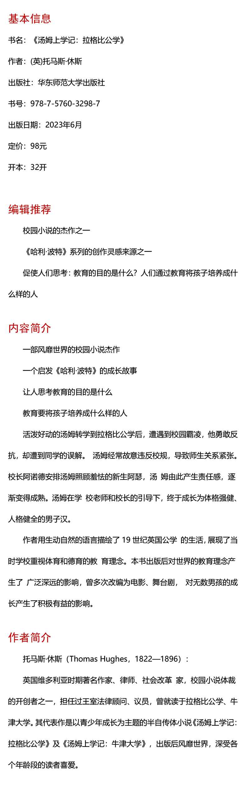 汤姆上学记 拉格比公学 启蒙文库 儿童文学校园小说 精装