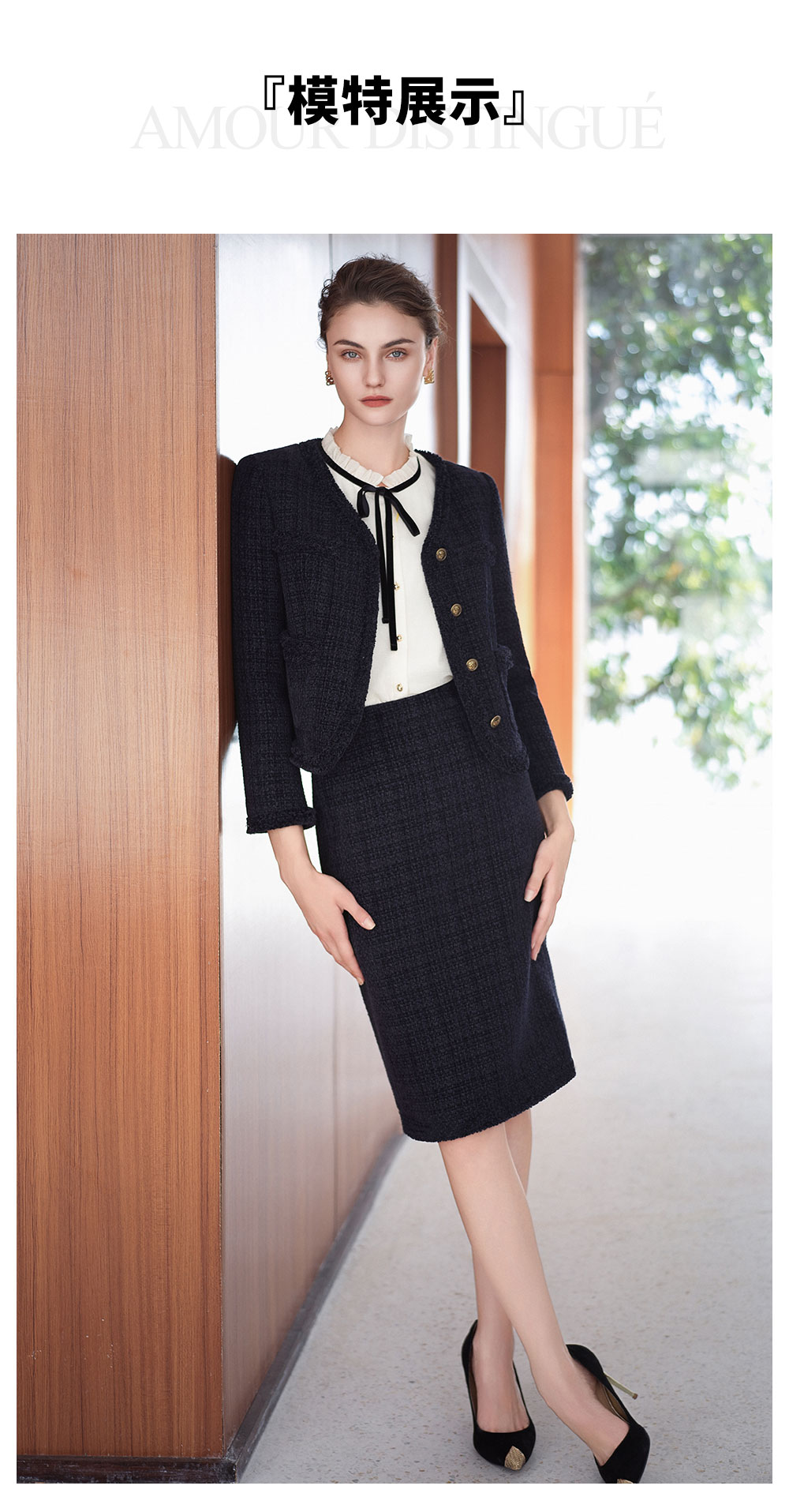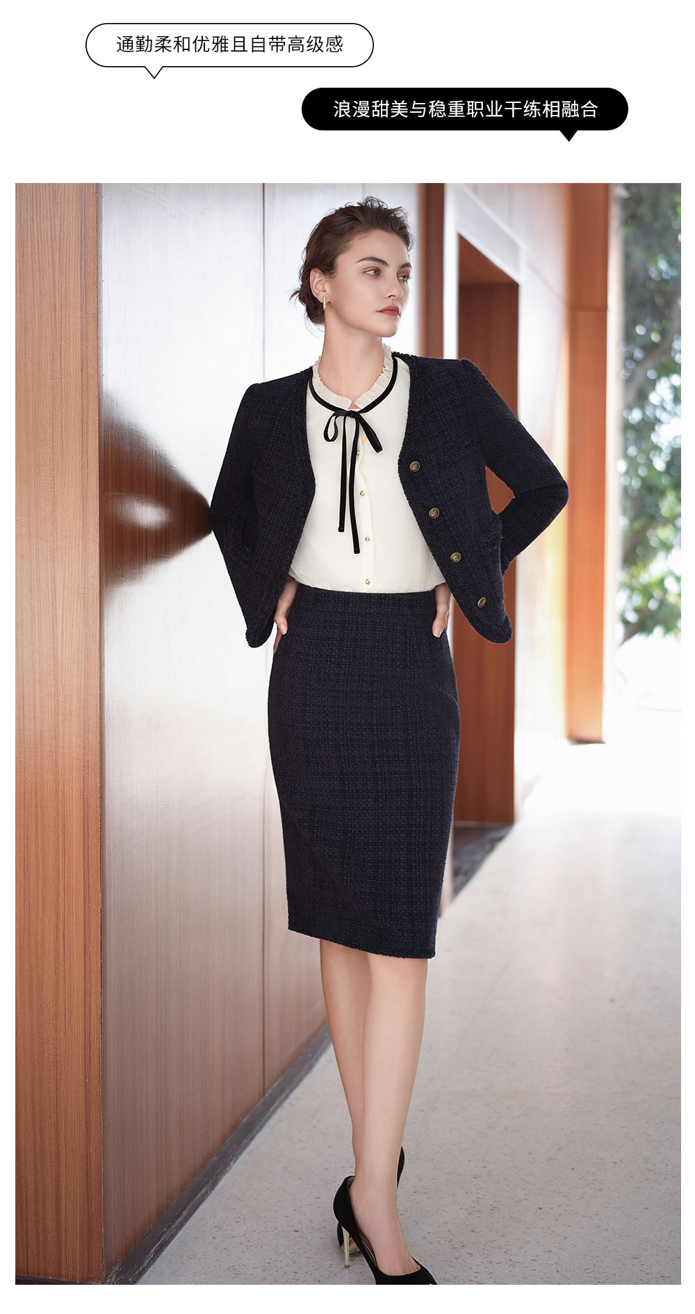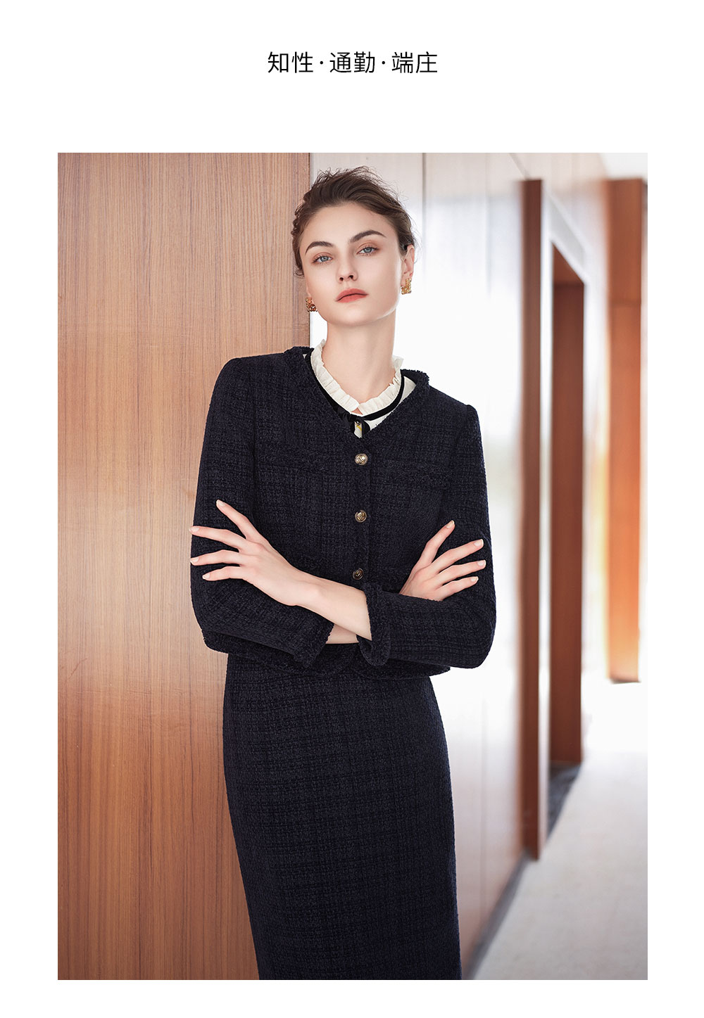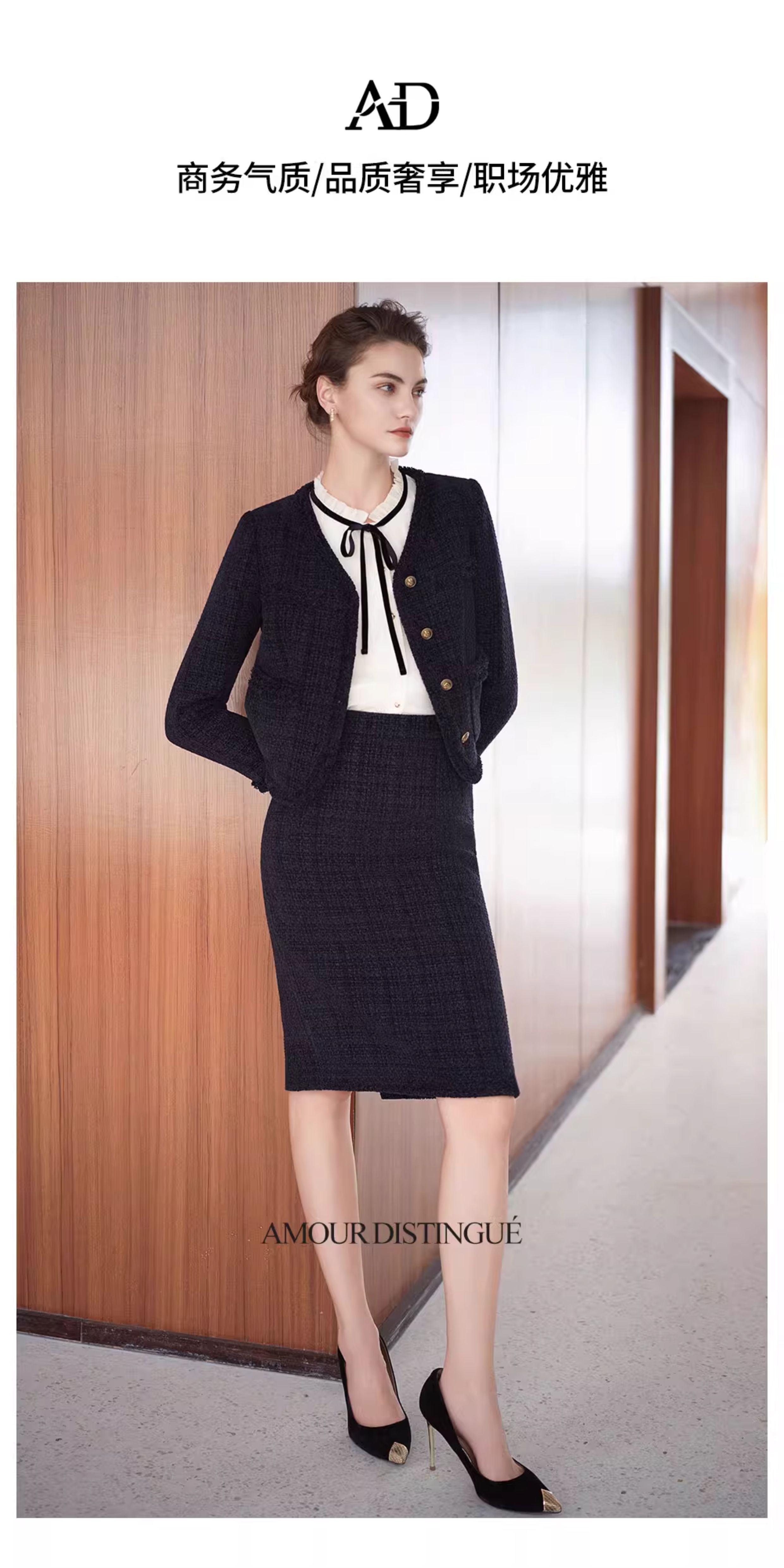 AD法式圆领小香风外套女藏青色雪尼尔套装2025新款秋冬职场两件套