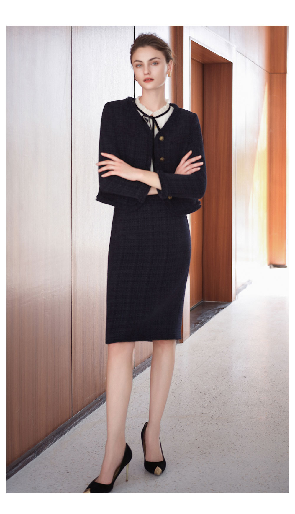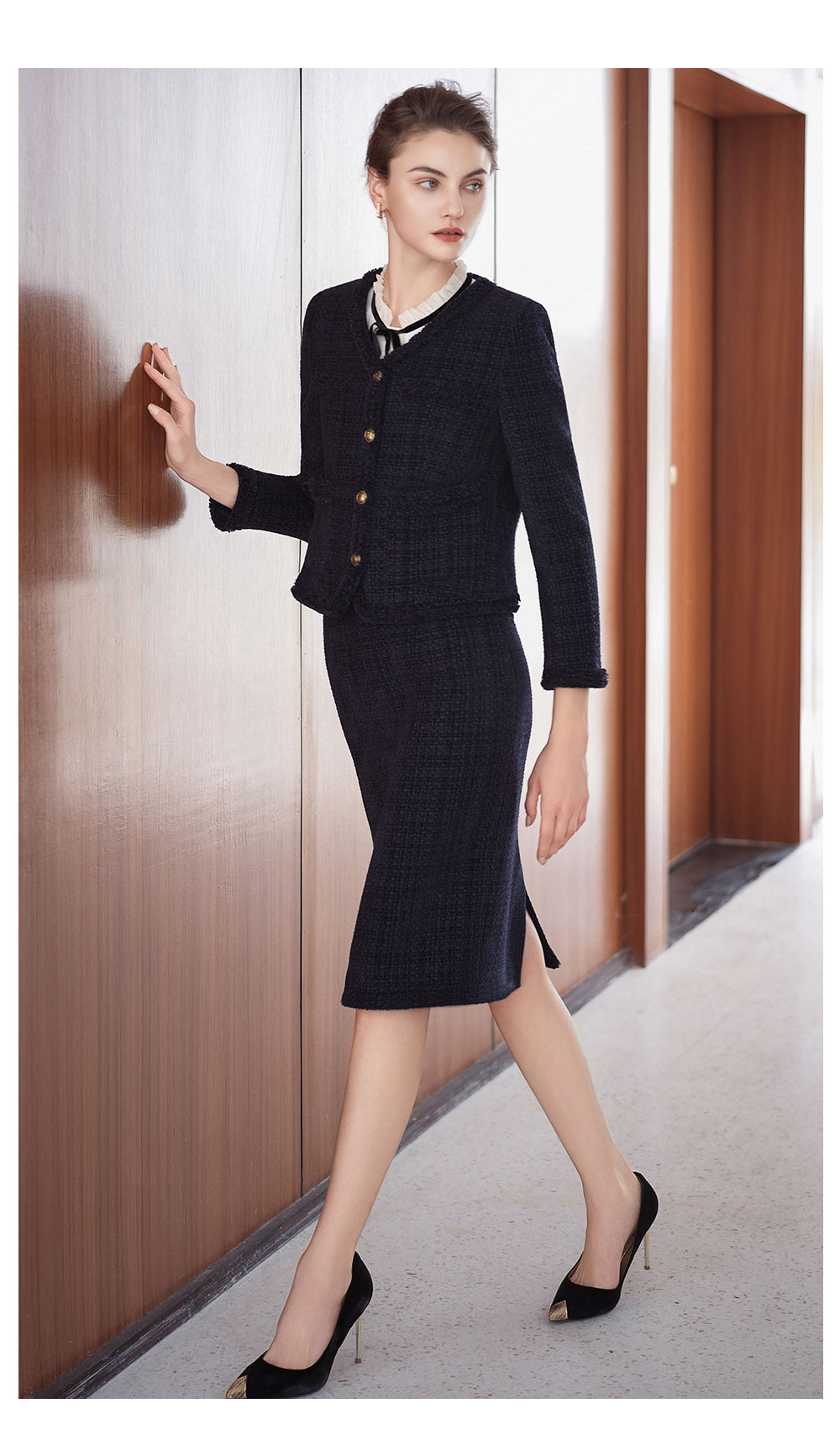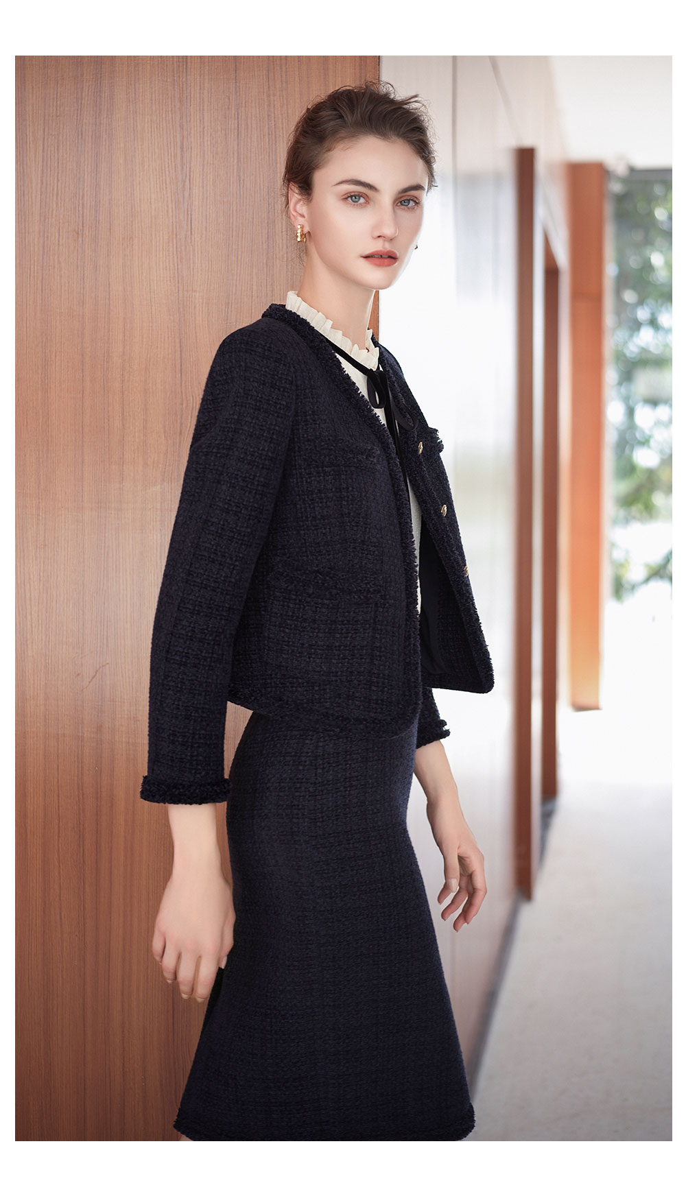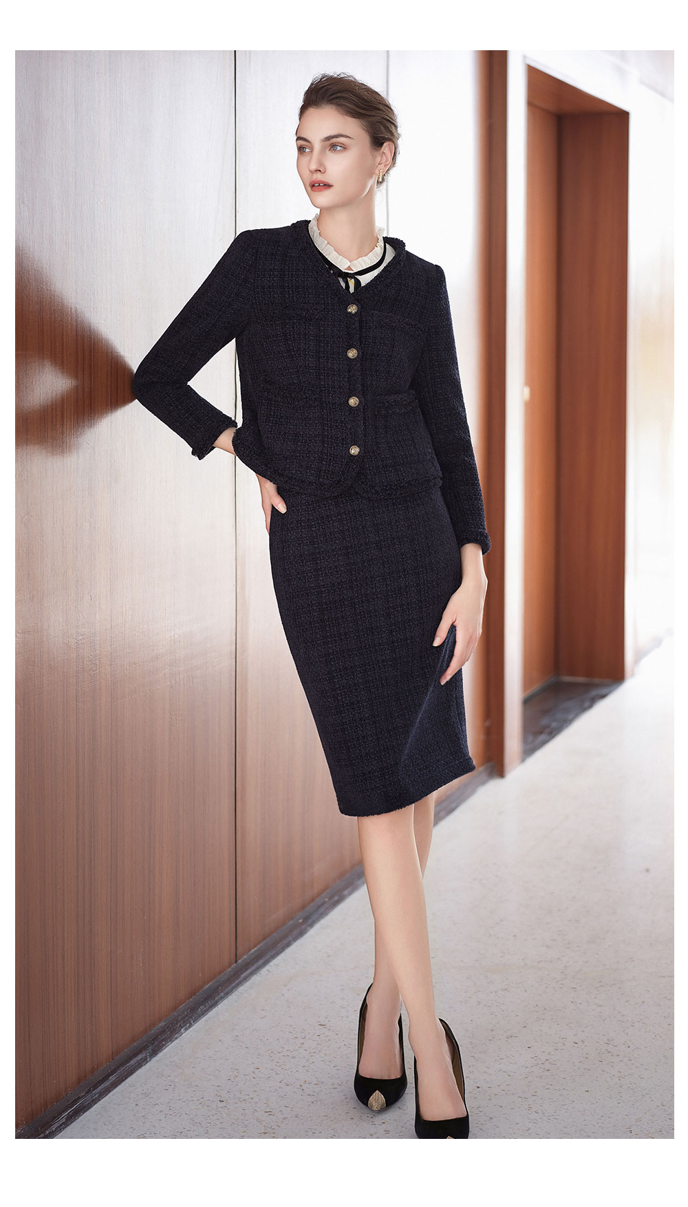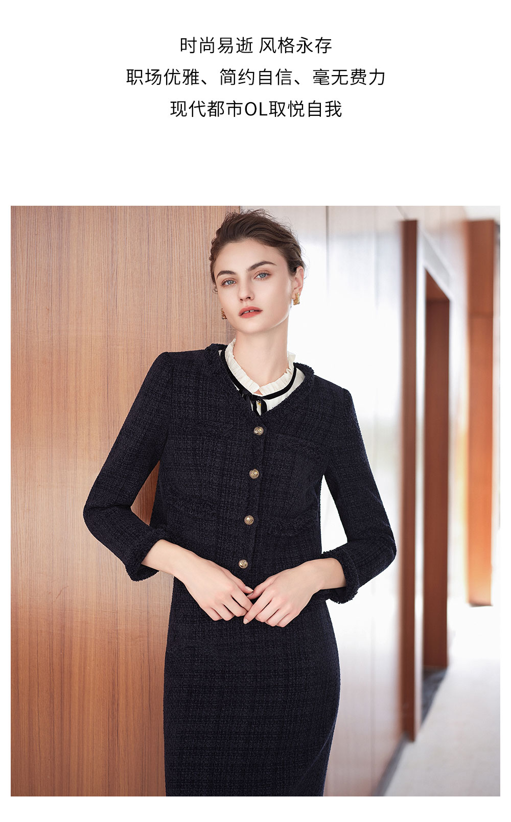 AD法式圆领小香风外套女藏青色雪尼尔套装2025新款秋冬职场两件套