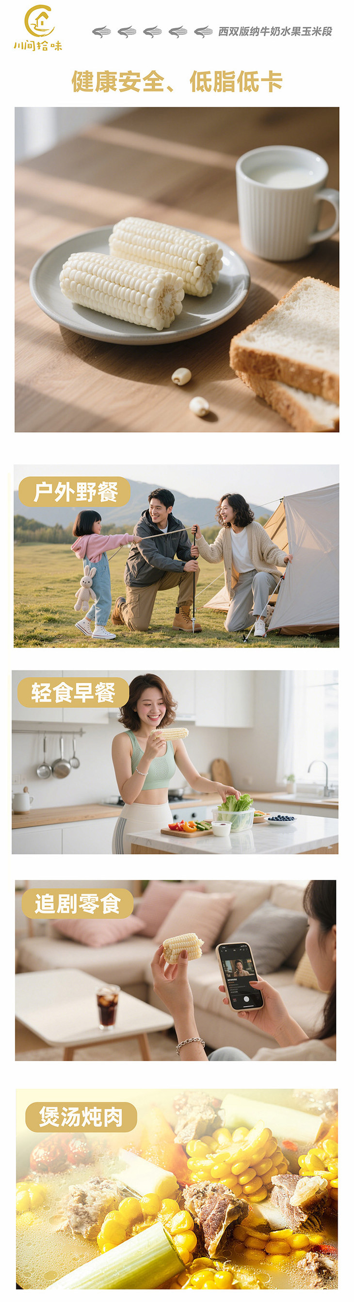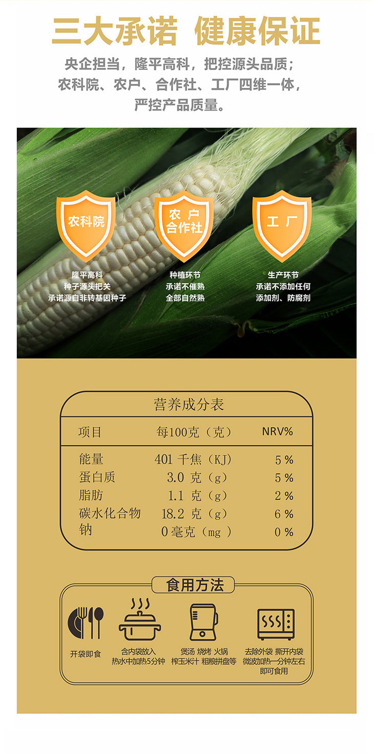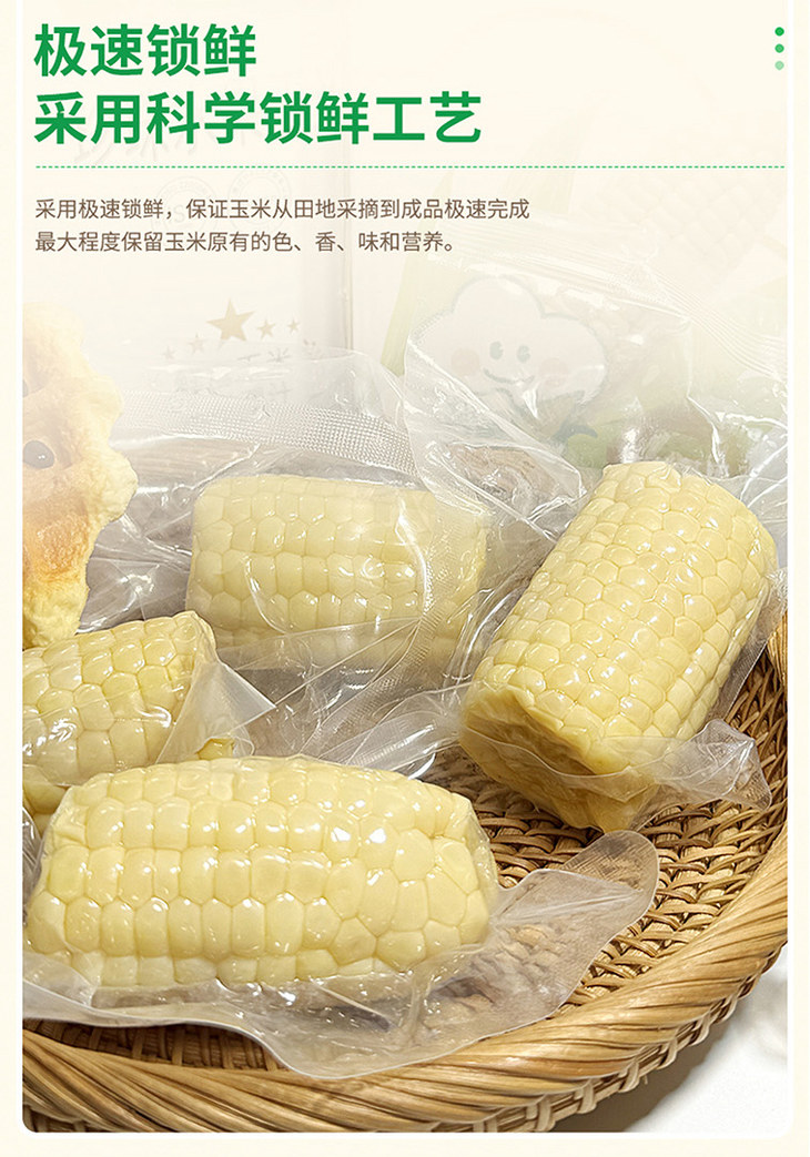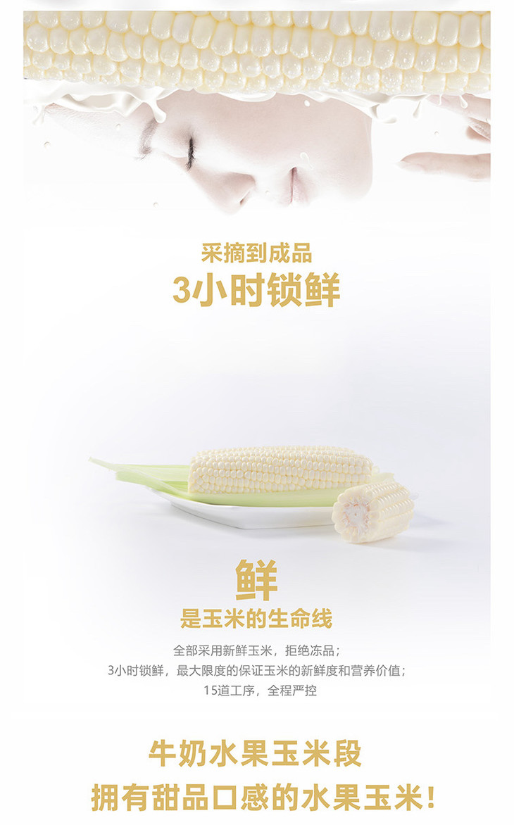 而且牛奶玉米是央企隆平高科把控种子源头,100%非转基因,从种植到生产,有农科院、农户、合作社、工厂组成的四维监管链,每根玉米都经15道工序筛选,没有坏粒、瘪粒。鲜食玉米的灵魂是新鲜,它还有3小时生命线:从地里采摘后不进冷库,直接运到就近授权工厂,清洗、切分、杀菌、包装全在3小时内完成,最大程度锁鲜,留住刚摘的水分、香气和脆嫩口感。配料表只有玉米两个字——无防腐剂、无甜味剂,农残也经过严格检测,老人、小孩、控糖人群都能放心吃。
