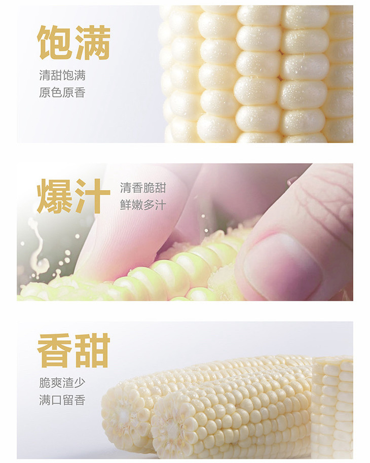 圣甜白珠玉米,口感真的是王炸。果衣薄到轻轻一捏就有清甜汁水流出,嚼着脆爽无渣,糖度也很高,清甜可口还带着牛奶的温润感,像吃玉米味甜品。吃法也超灵活:开袋即食,脆甜如水果;想热吃,内袋煮5分钟或微波1分钟,也可以空气炸锅,玉米香更浓、汁水更暖;换花样榨玉米汁都不用额外加糖,拌粗粮拼盘、煮火锅、煲汤也都合适,久煮不烂,还不用自己切!