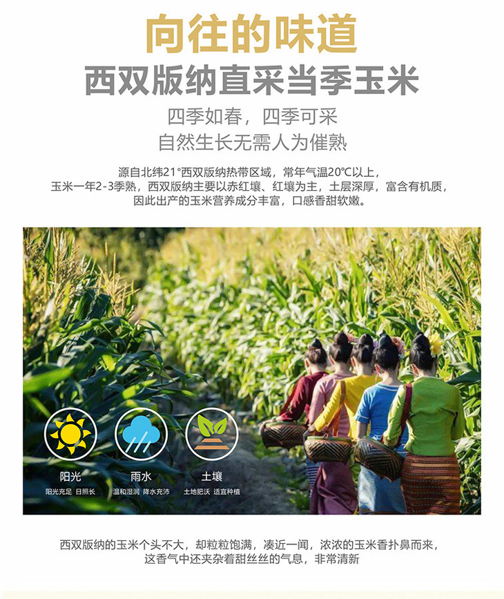 好玉米的好口感,全靠好产地托底。水果玉米来自西双版纳黄金产区,北纬21°的热带季风带,妥妥的作物天堂。一年能自然熟2-3季,全程靠蜜蜂天然授粉,保留最本真的生长状态。所以玉米个头虽比普通品种小巧,却颗颗饱满,凑近就是阳光晒过的玉米香,还带着一丝清甜,像刚从雨林里采摘,新鲜!