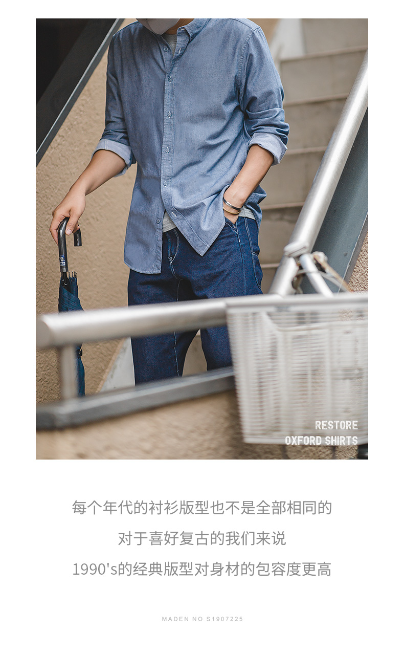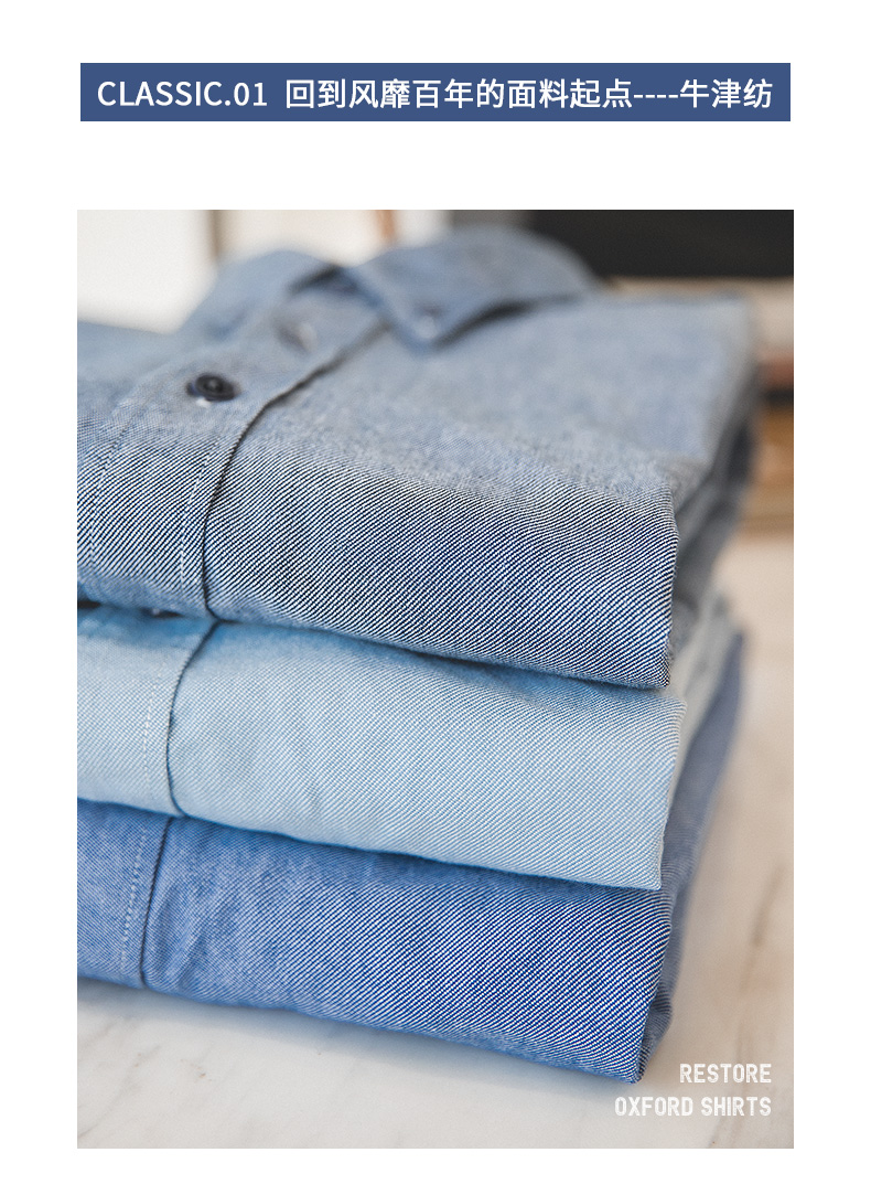工装优选 美式复古磨毛蓝色细条纹衬衫港风尖扣领薄款商务休闲
