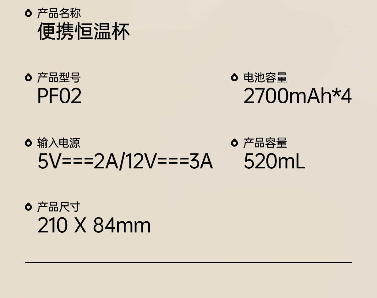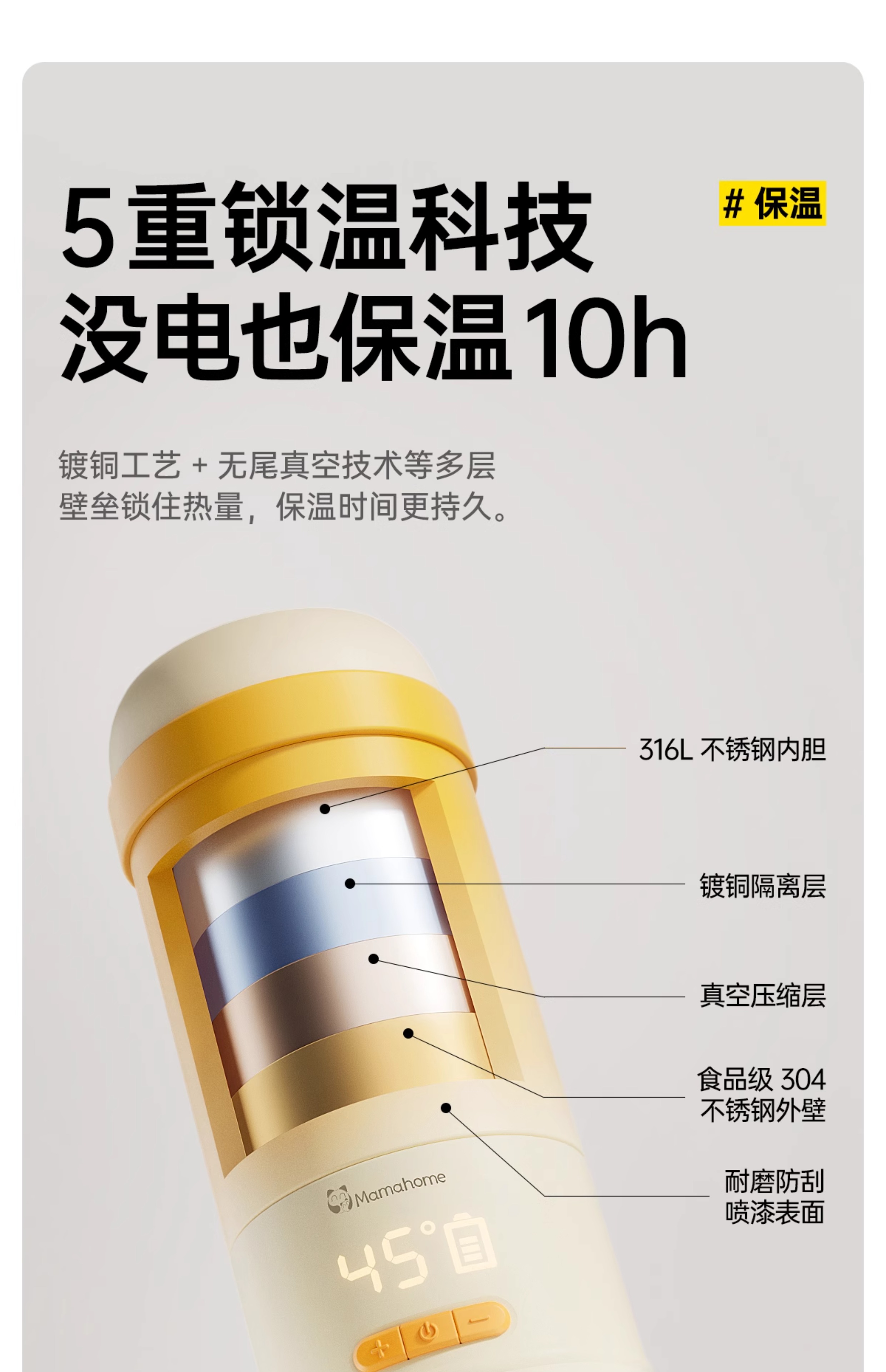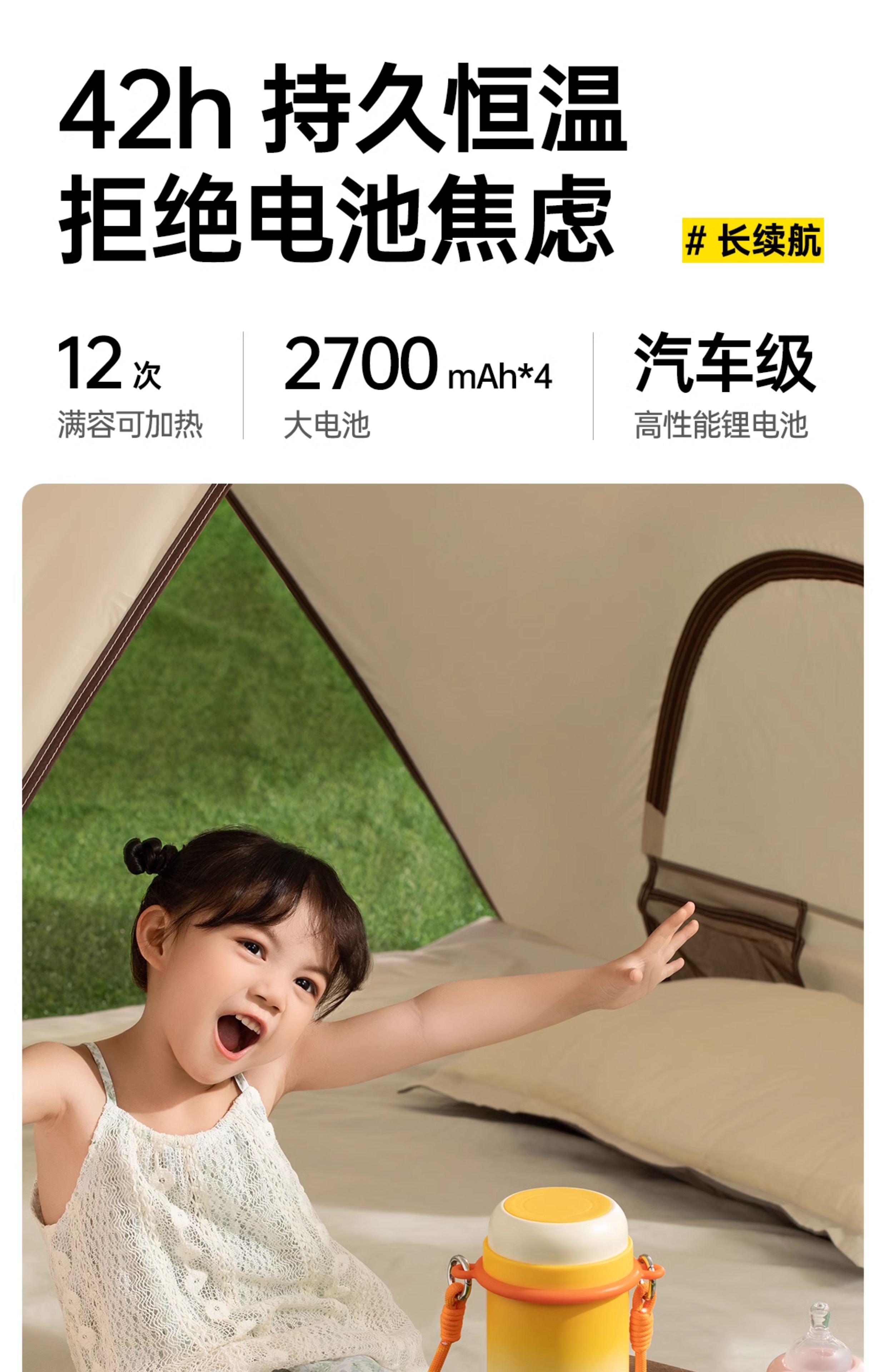【大容量电池】电池容量2700mahx4,充满电可以烧12次200ml水,恒温42小时;