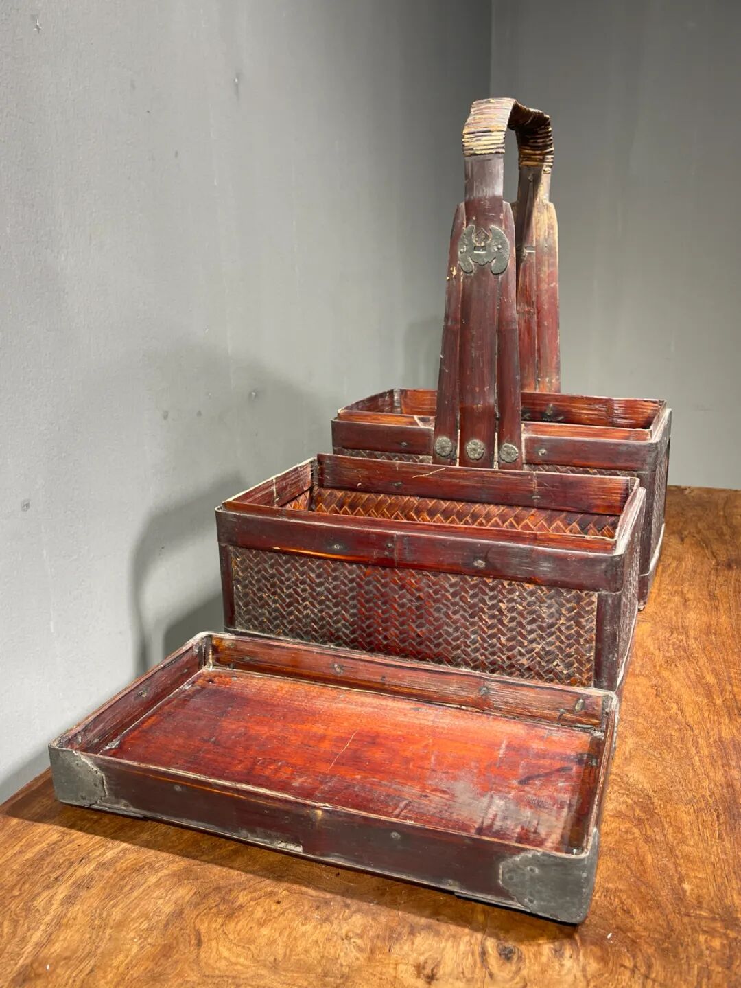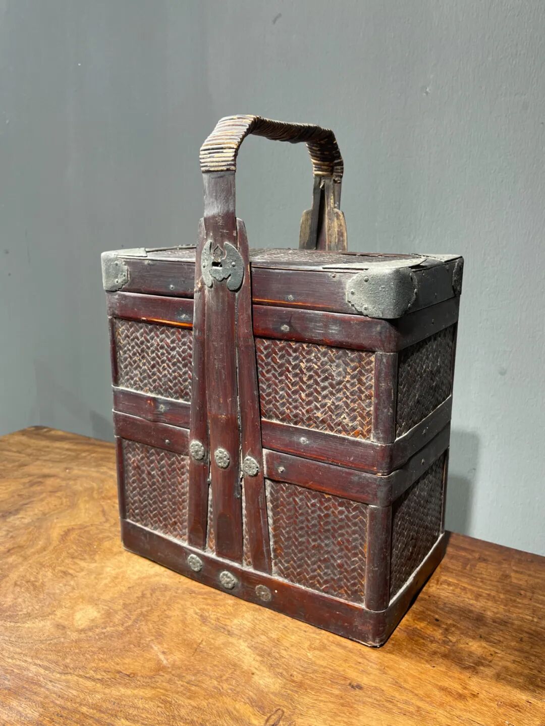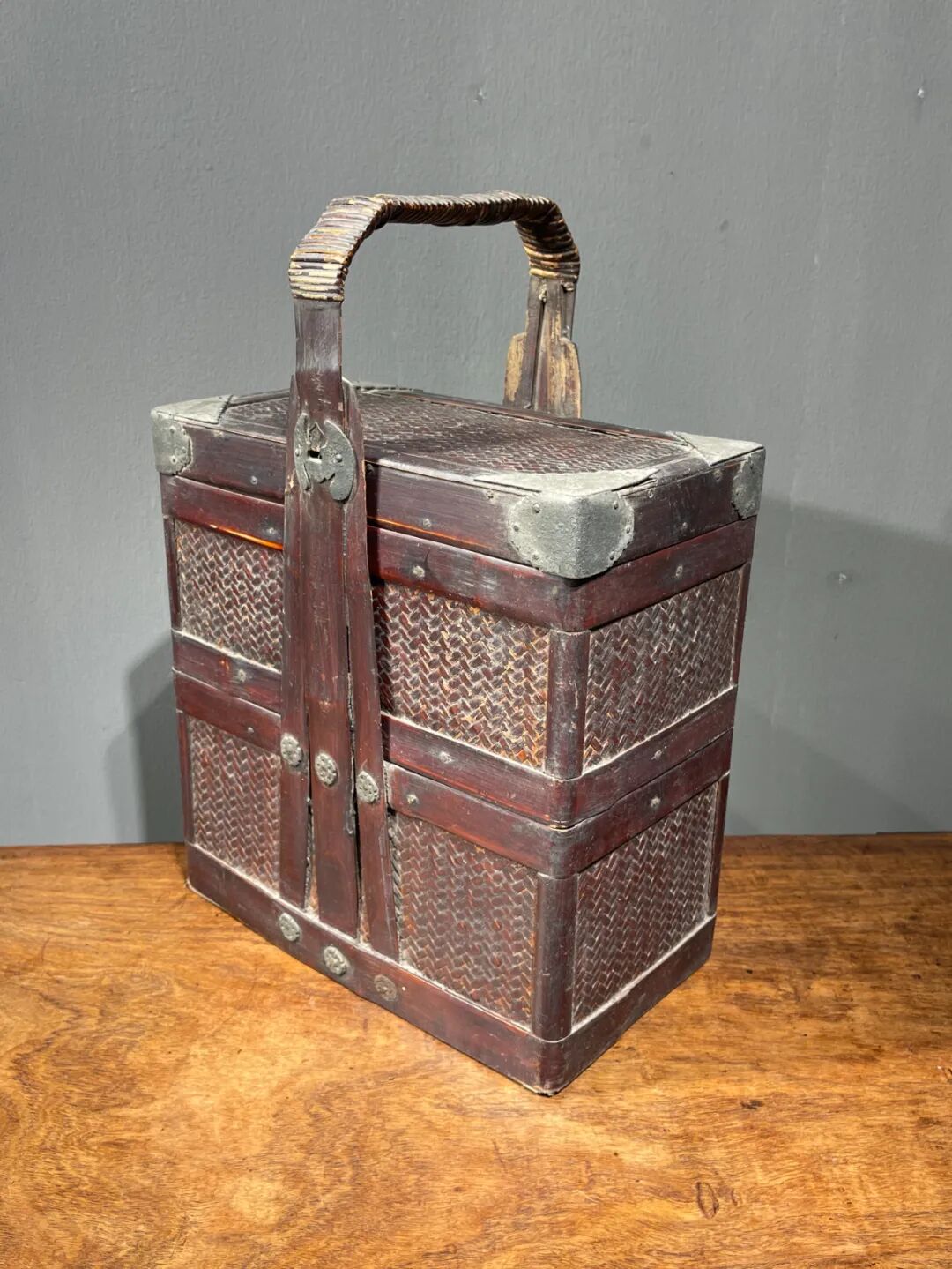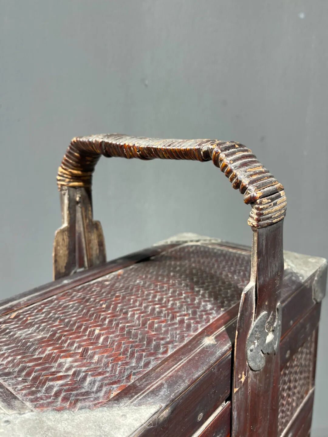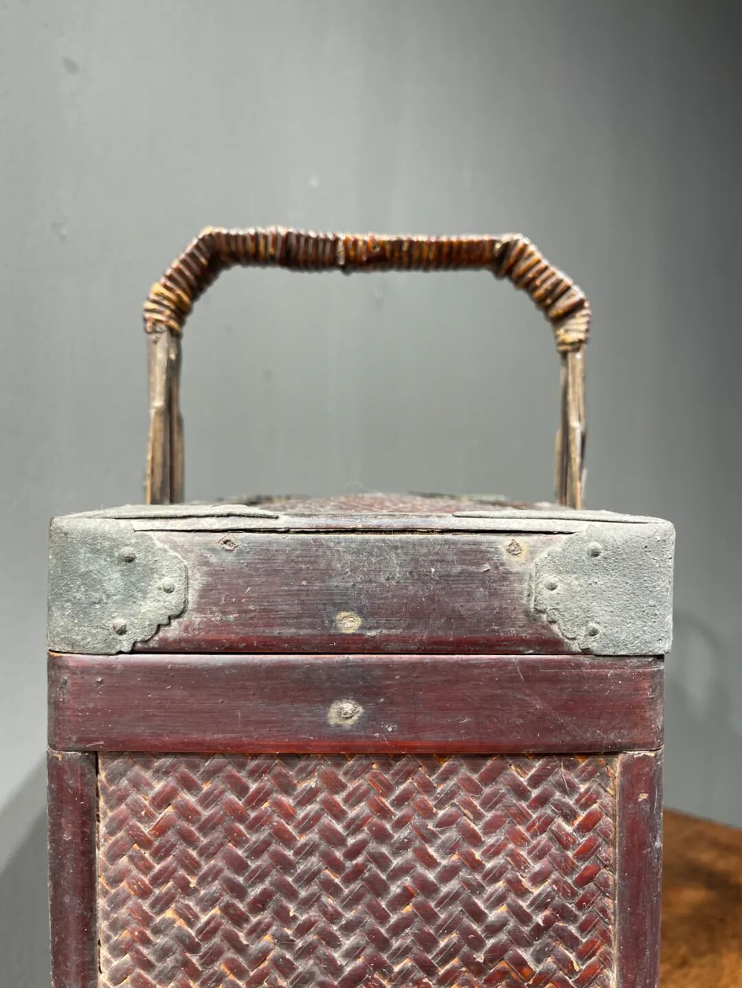 这是一件造型独特典雅,制作精美、年代久远的竹编髹漆双层提梁食盒,长方形食盒整体设计风格独特精緻,整器完全以传统竹编工艺加锡金属边角扣环手工制作编成,长方形器身,可下收方形提把,双层结构可以上下置物,应是清末民初厢房间搬移食物的食盒,全器竹蓖编成后髹棕色大漆,边角加锡扣环加固,逾百年之包浆皮壳渾厚温润,设计精巧别致,优雅大方,气质非凡,如今可摆放于当代空间内,因其独特风格与优良之细节,可以与各种空间搭配,而且可以实用当茶具收纳。
