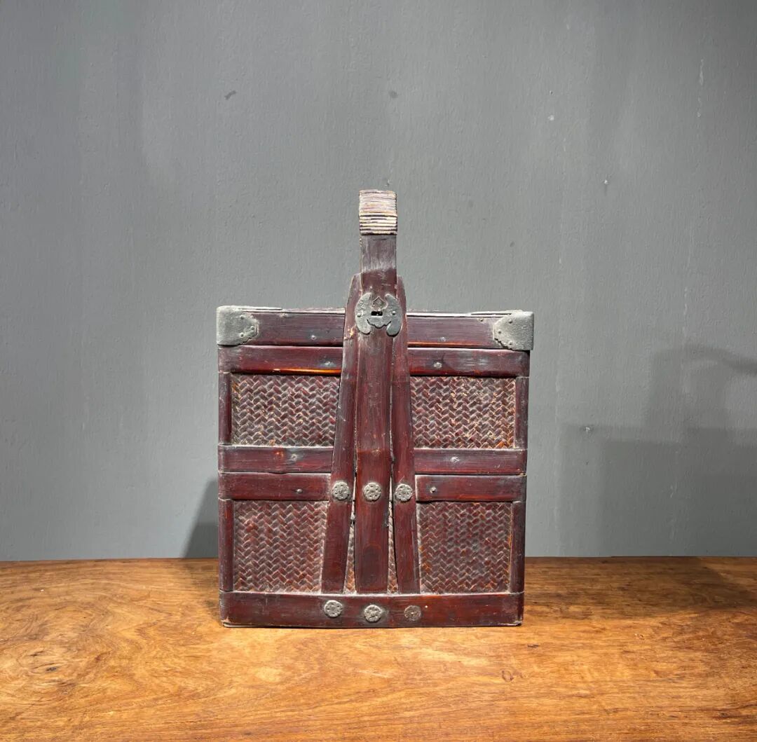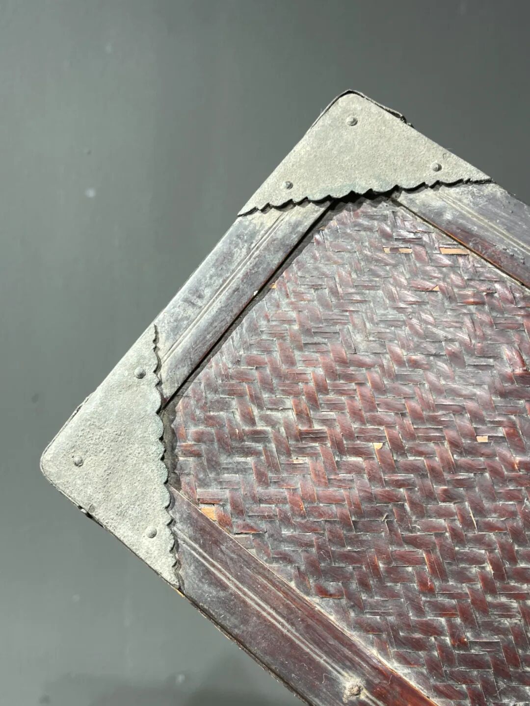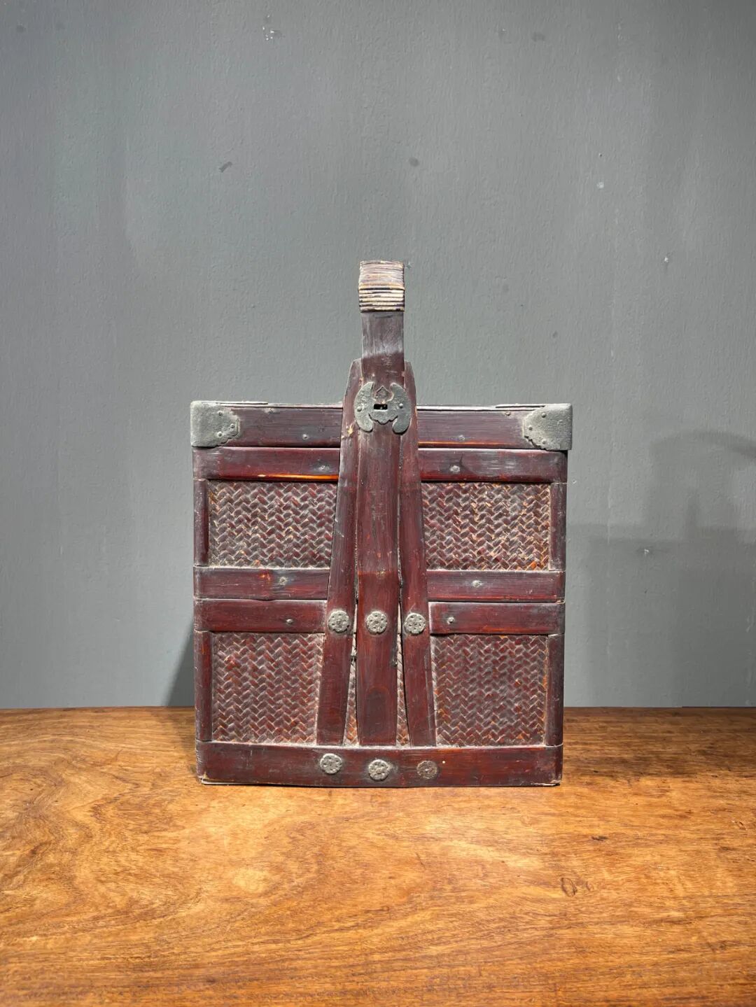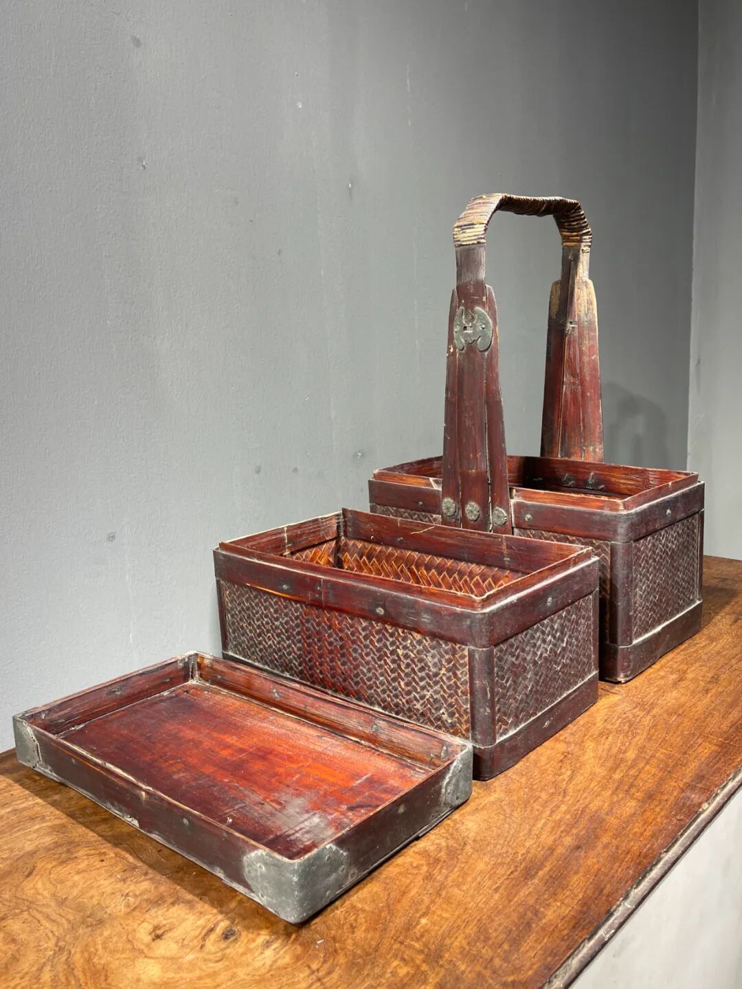 这是一件造型独特典雅,制作精美、年代久远的竹编髹漆双层提梁食盒,长方形食盒整体设计风格独特精緻,整器完全以传统竹编工艺加锡金属边角扣环手工制作编成,长方形器身,可下收方形提把,双层结构可以上下置物,应是清末民初厢房间搬移食物的食盒,全器竹蓖编成后髹棕色大漆,边角加锡扣环加固,逾百年之包浆皮壳渾厚温润,设计精巧别致,优雅大方,气质非凡,如今可摆放于当代空间内,因其独特风格与优良之细节,可以与各种空间搭配,而且可以实用当茶具收纳。