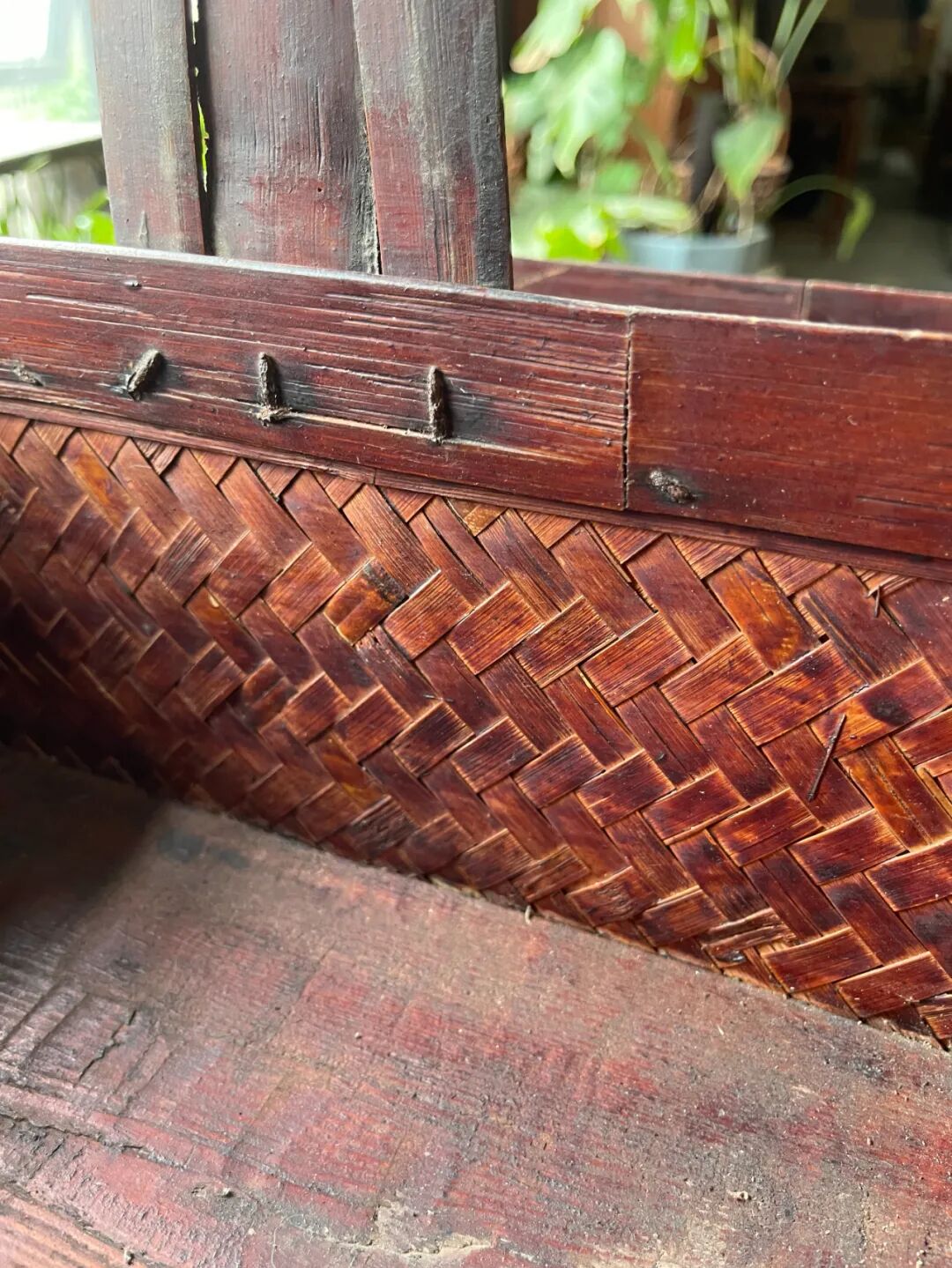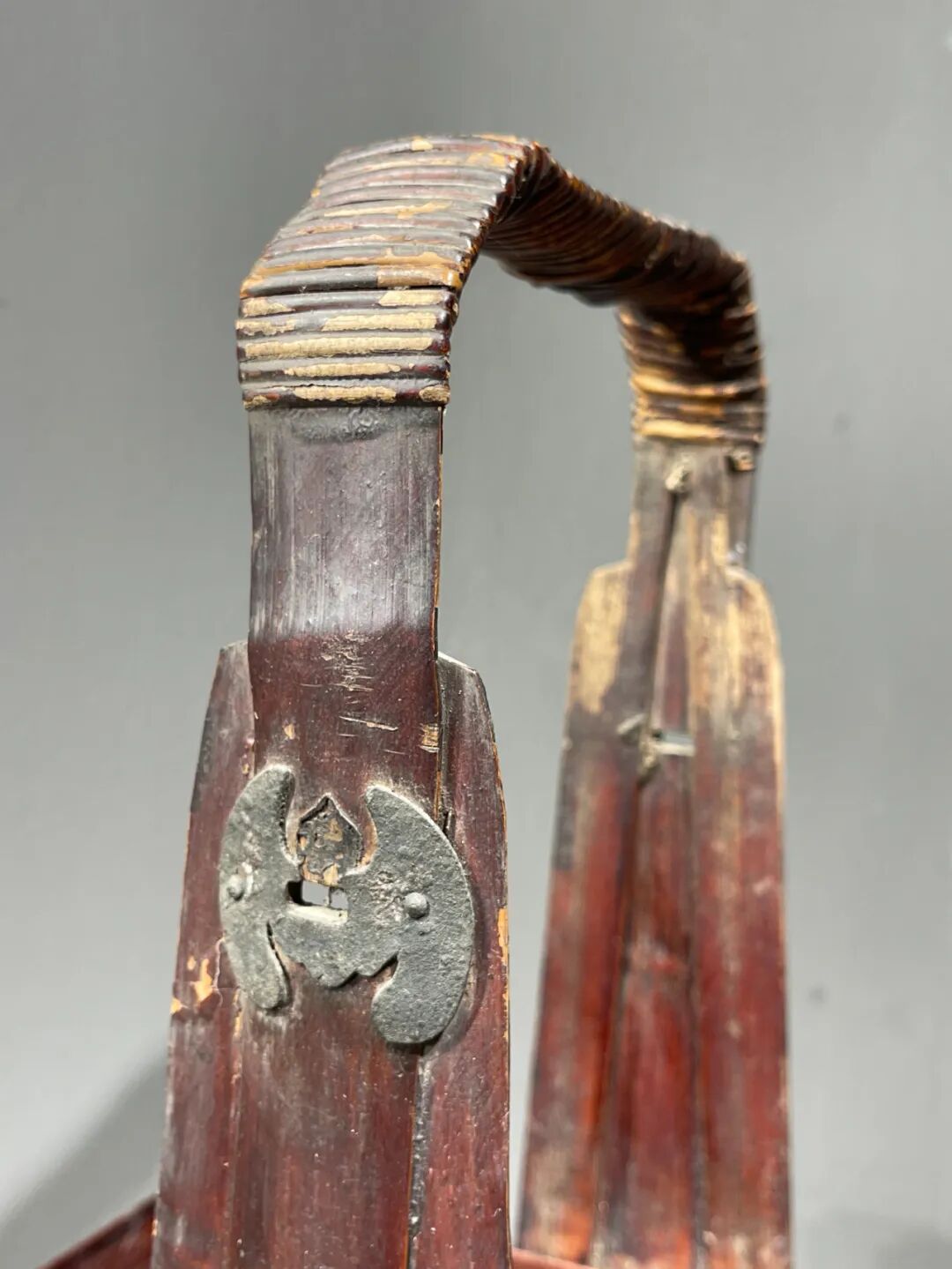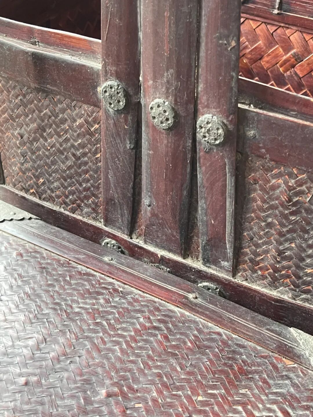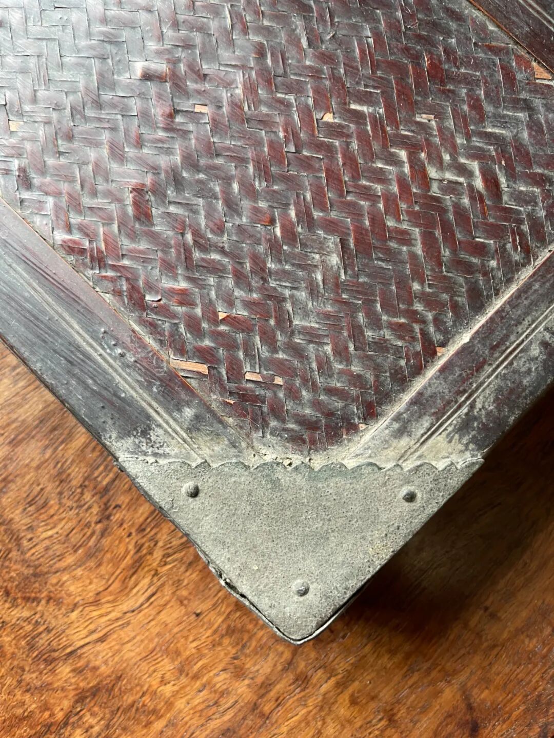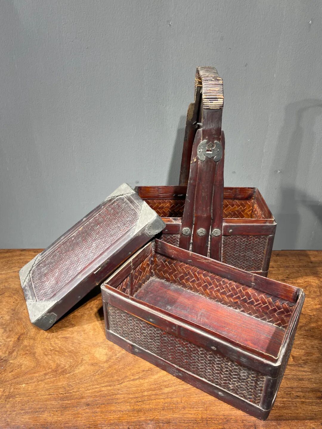 这是一件造型独特典雅,制作精美、年代久远的竹编髹漆双层提梁食盒,长方形食盒整体设计风格独特精緻,整器完全以传统竹编工艺加锡金属边角扣环手工制作编成,长方形器身,可下收方形提把,双层结构可以上下置物,应是清末民初厢房间搬移食物的食盒,全器竹蓖编成后髹棕色大漆,边角加锡扣环加固,逾百年之包浆皮壳渾厚温润,设计精巧别致,优雅大方,气质非凡,如今可摆放于当代空间内,因其独特风格与优良之细节,可以与各种空间搭配,而且可以实用当茶具收纳。