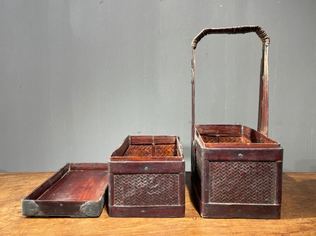 此竹编髹漆双层提梁食盒,整体设计清新脱俗,材质与作工皆气质典雅古朴,是当代茶桌上之美好器皿,尽显手工编竹及旧时代市井文化的凤采,如今可以表现主人之优雅品味。