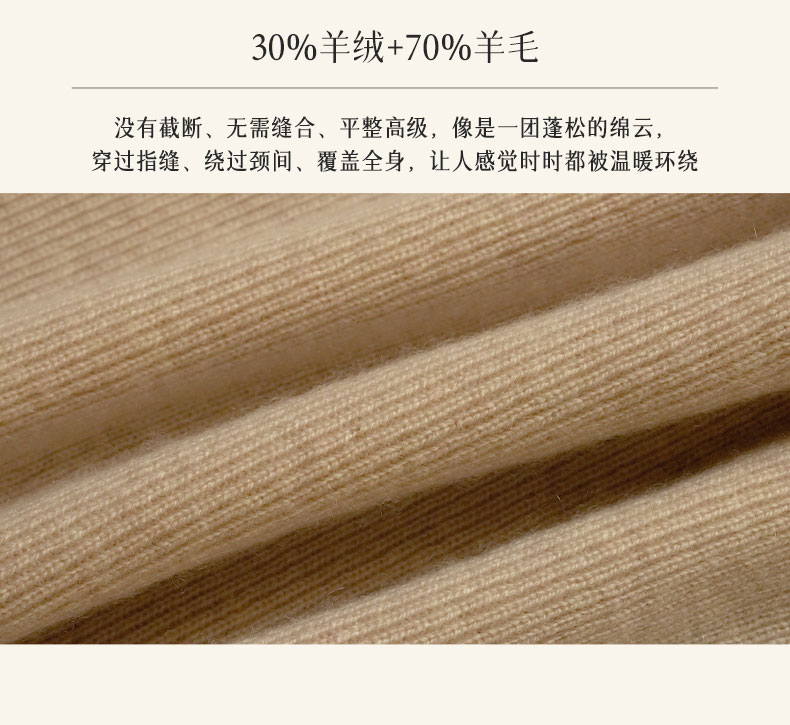 没有截断、无需缝合、平整高级,像是一团蓬松的绵云,穿过指缝、绕过颈间、覆盖全身,让人感觉时时都被温暖环绕。