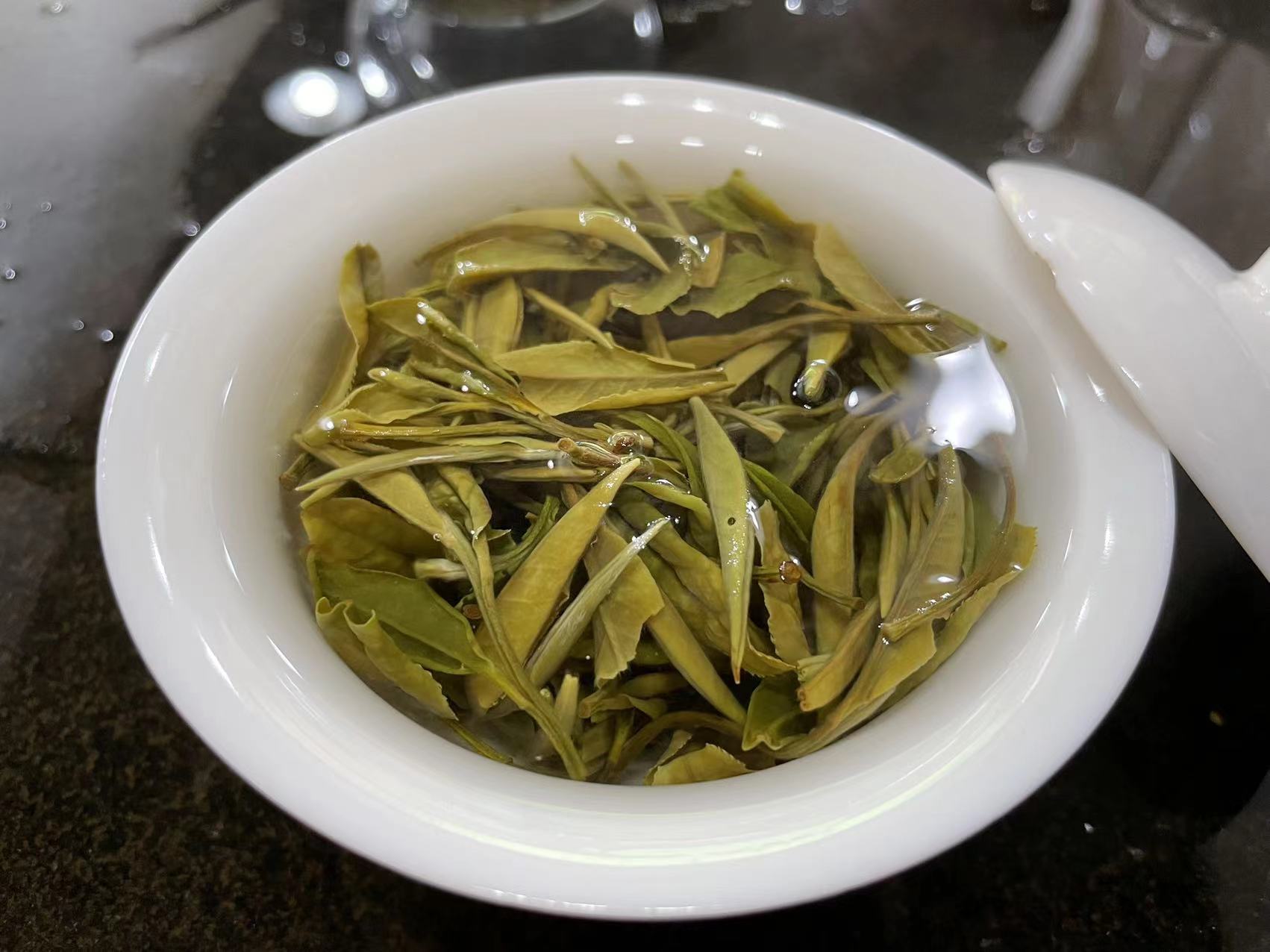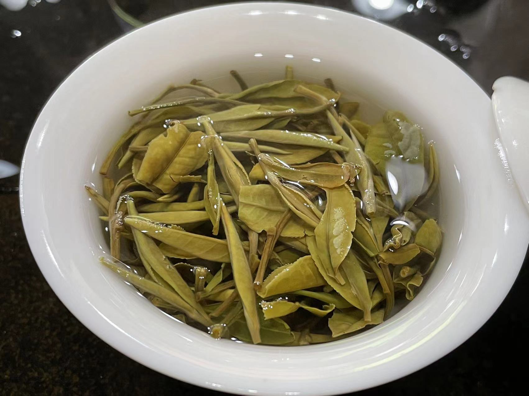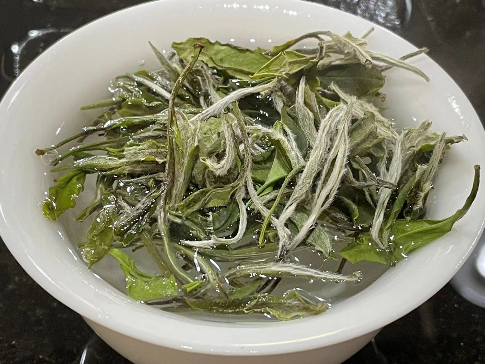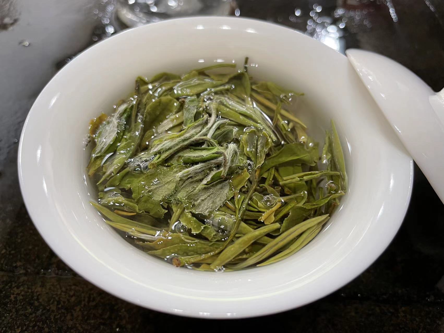 第四道注水:芽、叶都吸水完成后,开始呈现出鲜叶时的状态,这个时候我们能清楚的辨别出来等级。芽头的占比高于叶片、同时芽头长于叶张,故稳稳的一级茶。