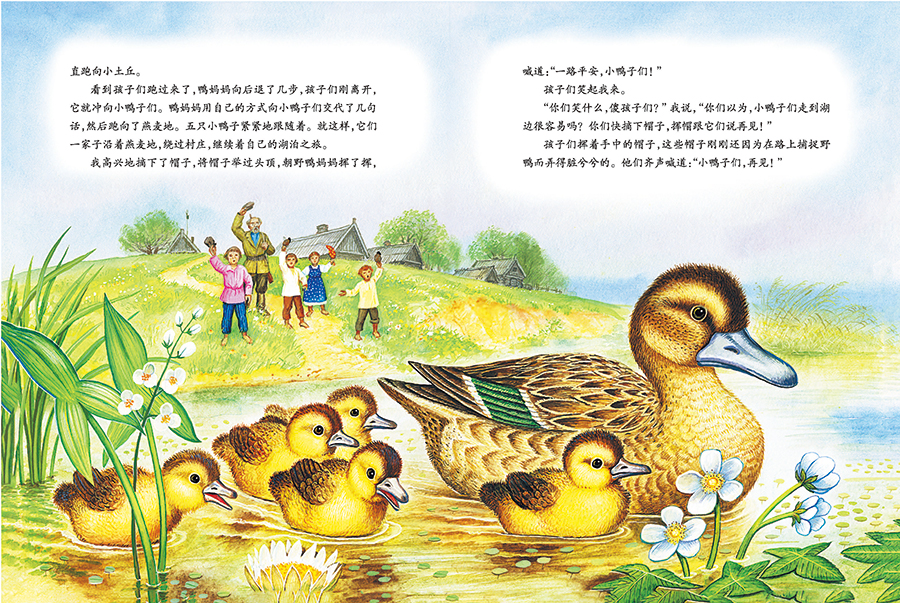只要彼佳一拨开树枝,走到岸边,鸟儿们就立刻开始啼鸣;熊蜂飞到空中喊着:“让路!让路!”鱼儿们为了在彼佳面前炫耀五光十色的鳞片,纷纷跳出水面;啄木鸟这么用力地敲击着黑杨树,以至于河狸都蜷缩起尾巴,碎步快走到洞里;飞得比所有鸟儿都要高的百灵鸟发出了悠扬的啼鸣;以至于蓝色的风铃草都乐呵呵地直晃脑袋。