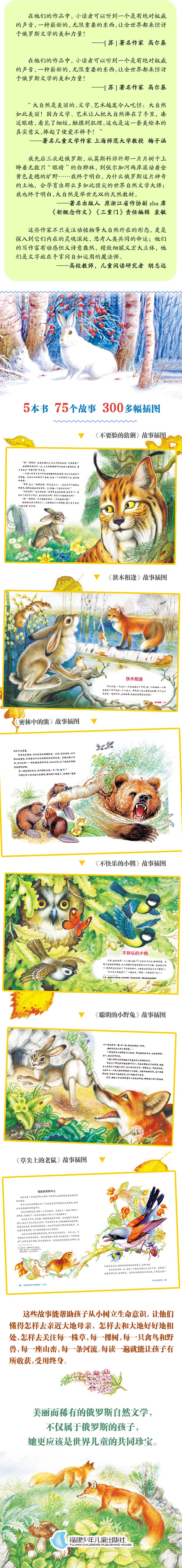这些故事是五位俄罗斯自然文学大师的智慧创作,作家们简直能听懂树的谈话、花的低语、泉的浅唱、飞禽走兽的喜怒哀乐。