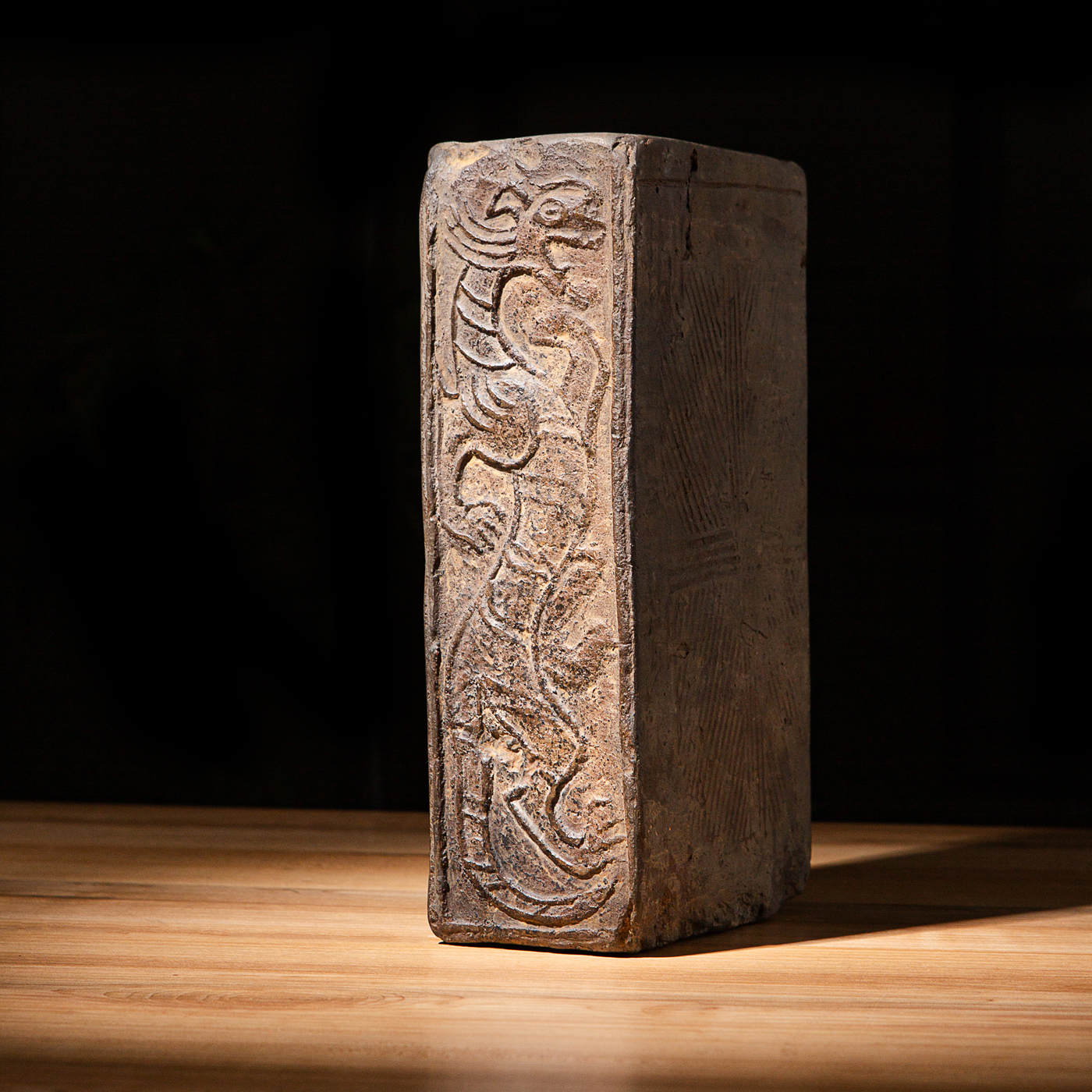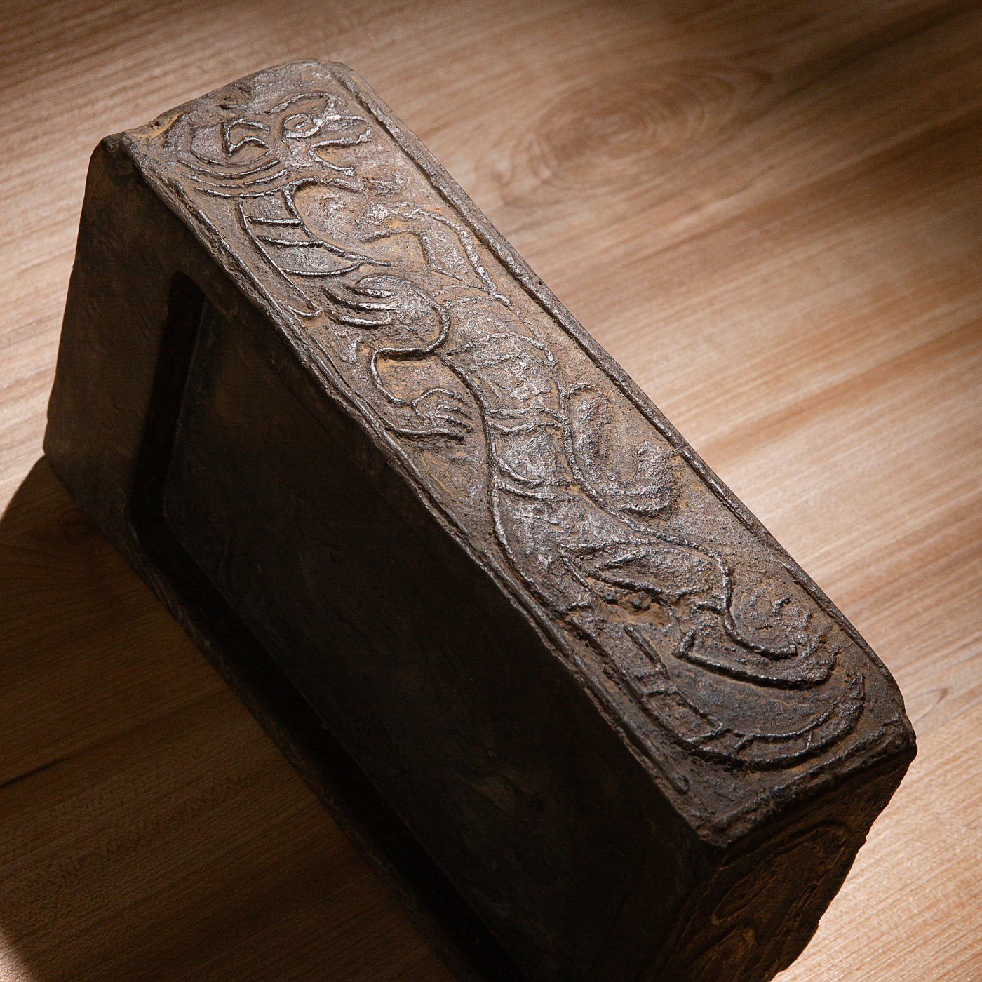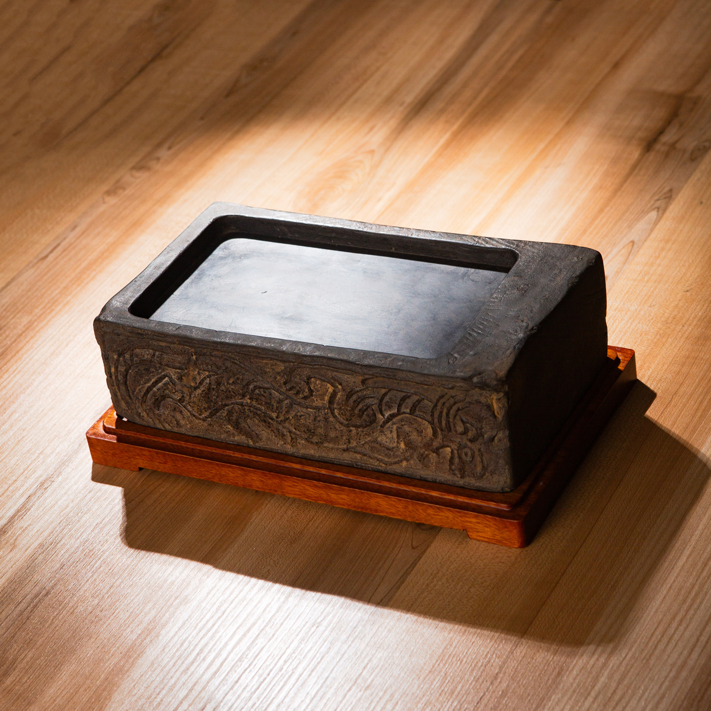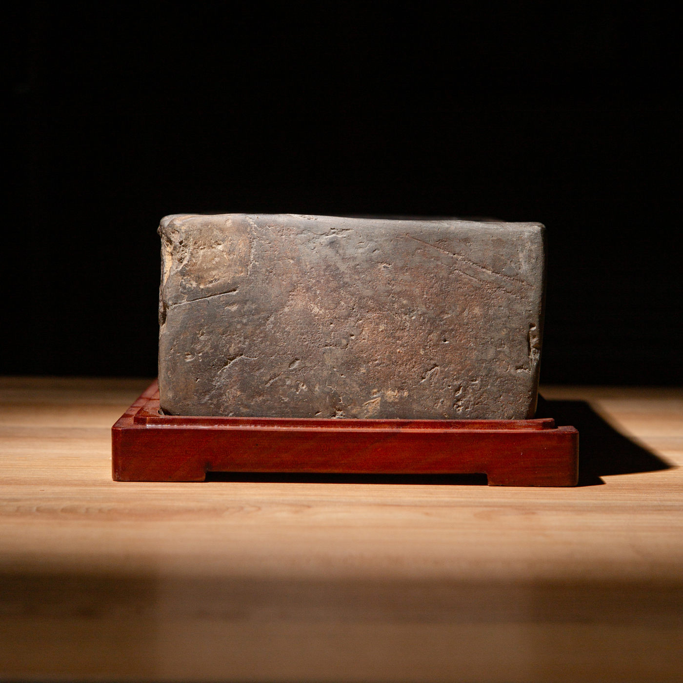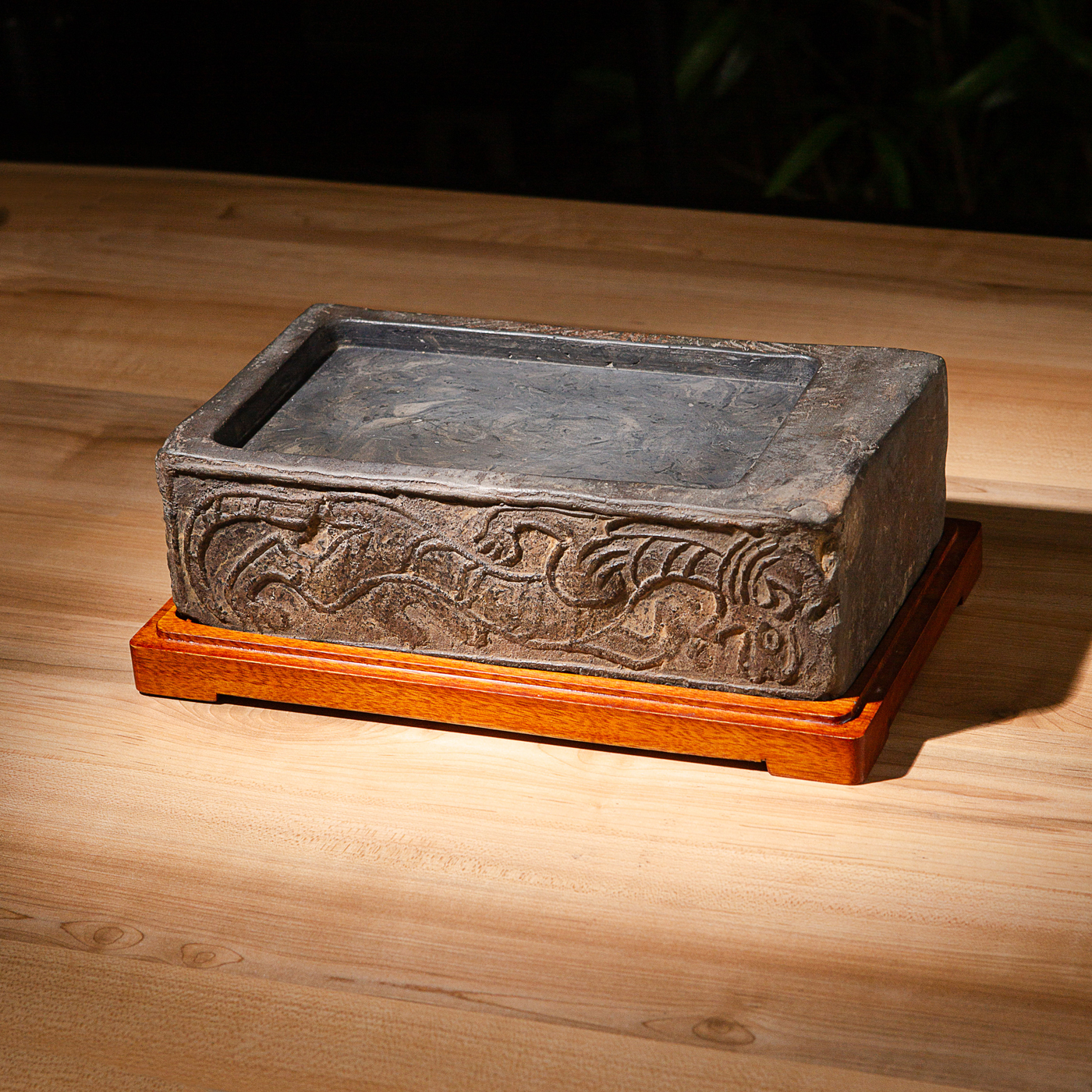 “兴乐山君”古砖制砚,图案精美生动,胎质坚实细腻,器型沉稳端庄,配手工精制刻字木盒,是文人案头之佳品。