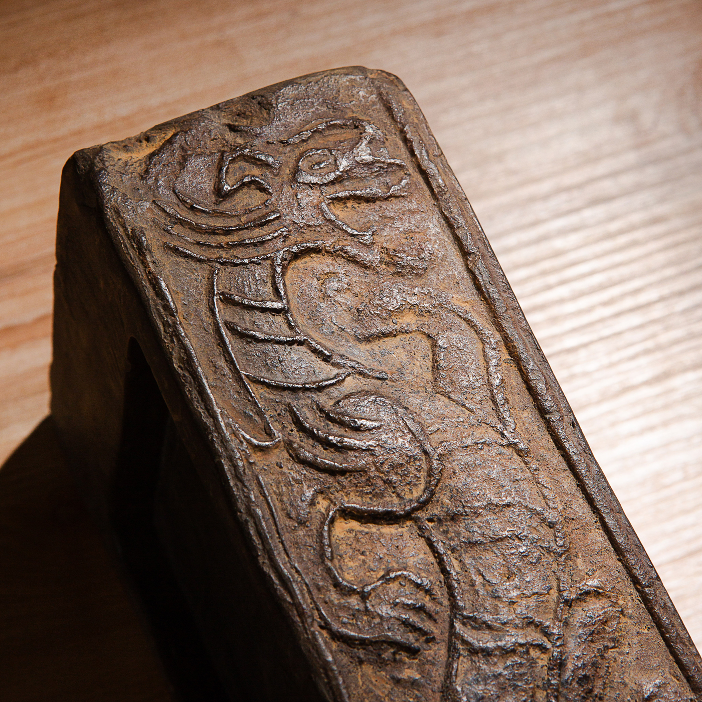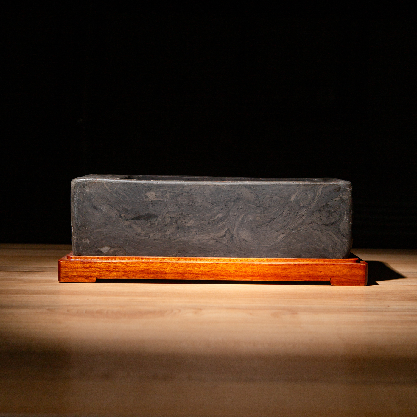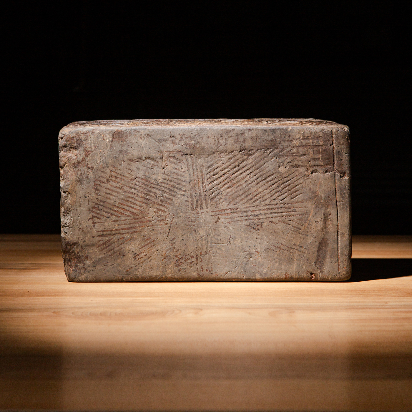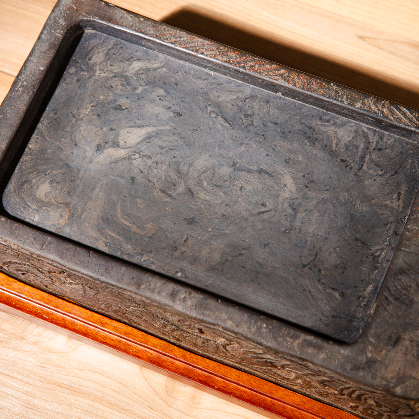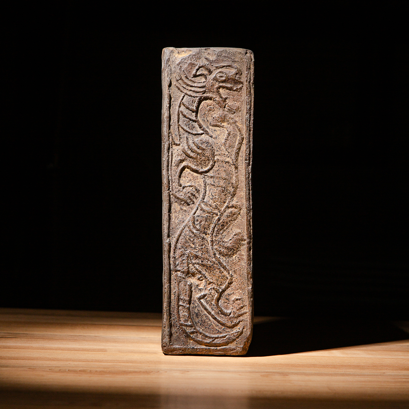 “兴乐山君”古砖制砚,图案精美生动,胎质坚实细腻,器型沉稳端庄,配手工精制刻字木盒,是文人案头之佳品。