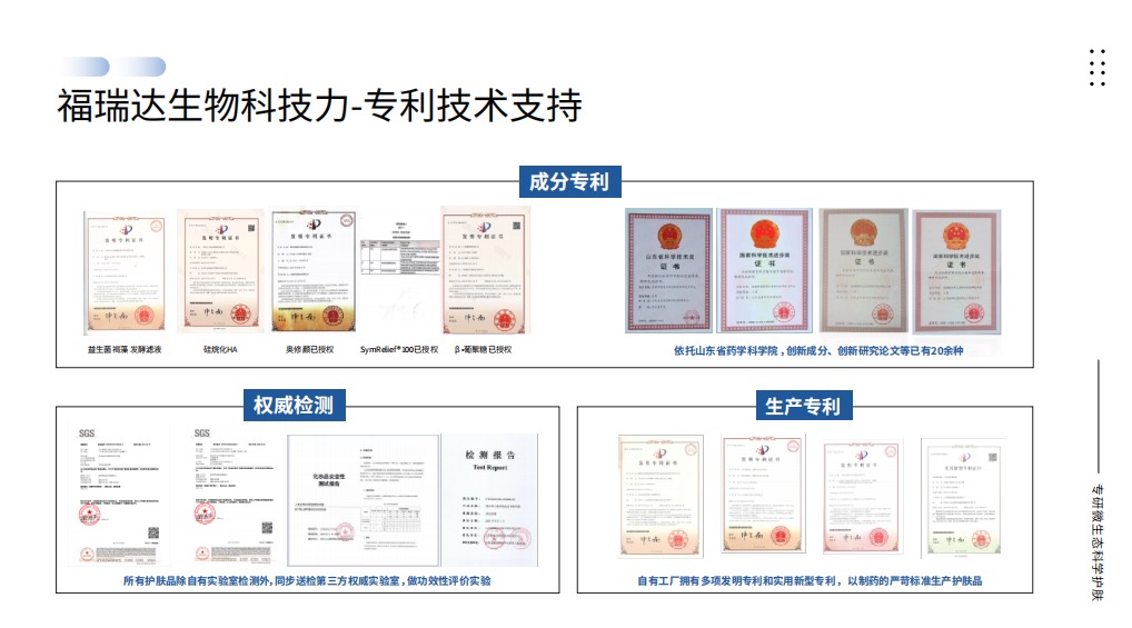 不仅有山东省科学院强大的,科研团队坐镇,专制科学美肤37年,更是设有两个万级微生物检验室,三十万级包装车间,十万级标准净化车间、万级无菌配置和GMP认证标净化生产