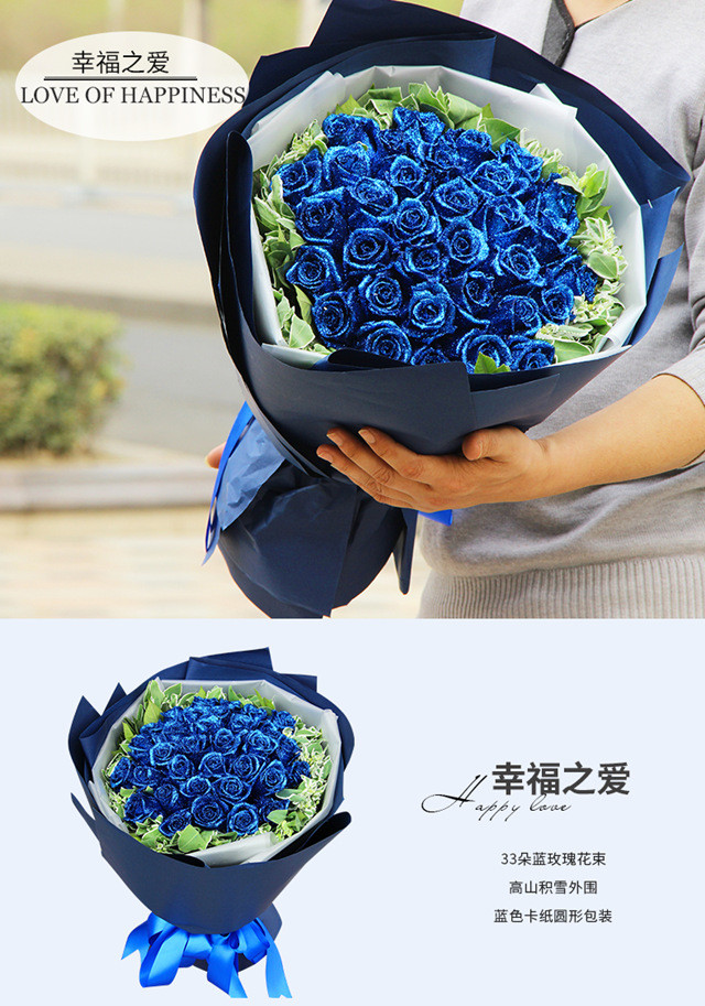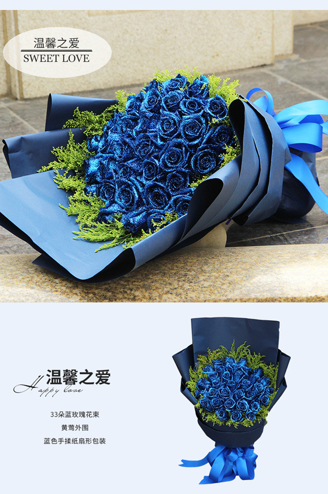 蓝玫瑰代表敦厚善良和独一无二; 玫瑰象征爱情和真挚纯洁的爱,人们多把它作为爱情的信物,是情人间首选花卉