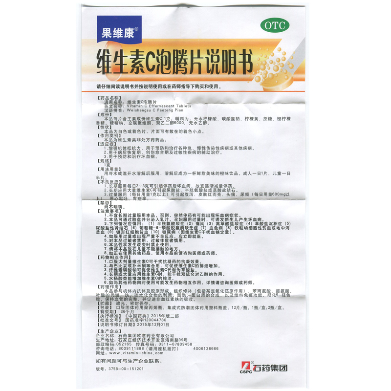 石药 果维康 维生素C泡腾片(橙味) 12片 维C vc