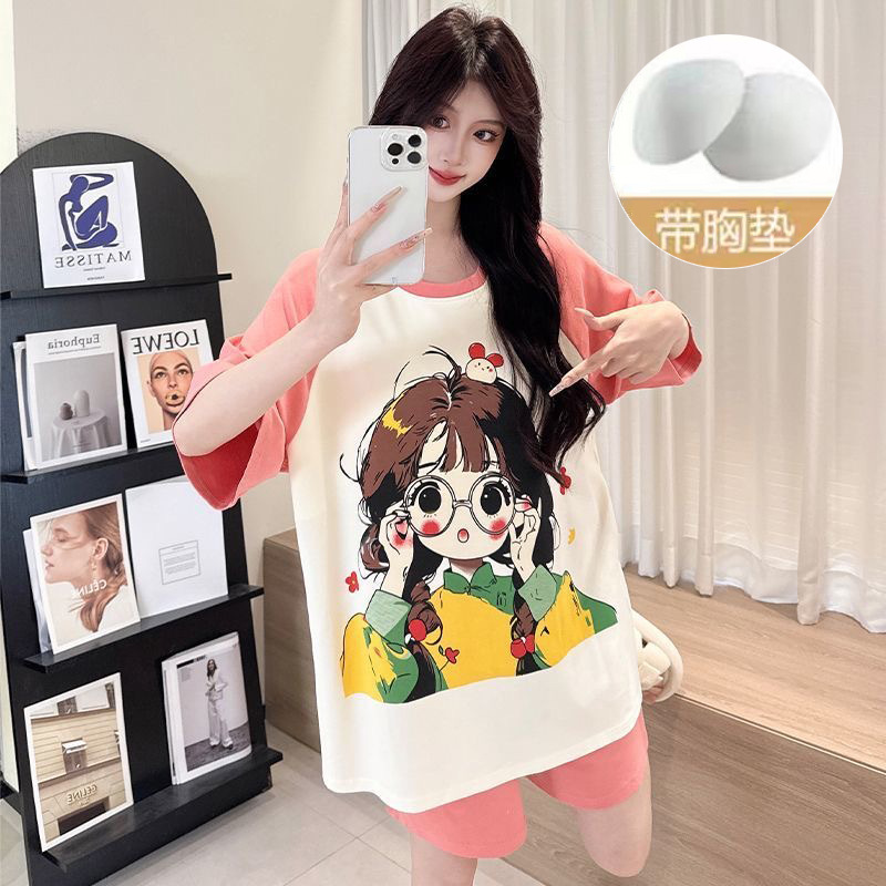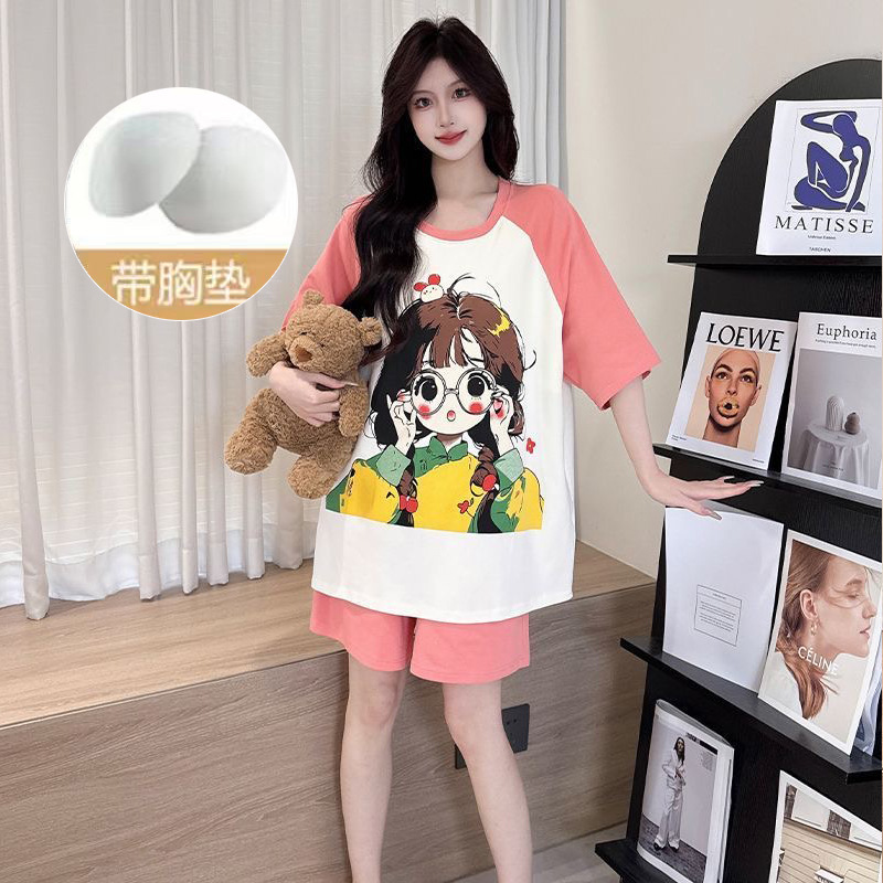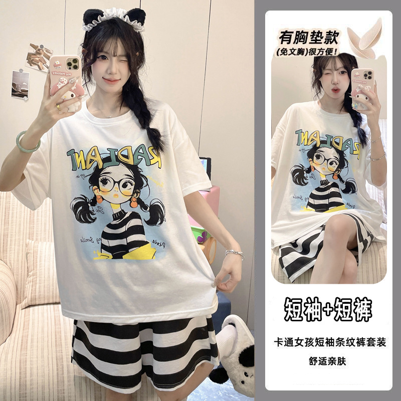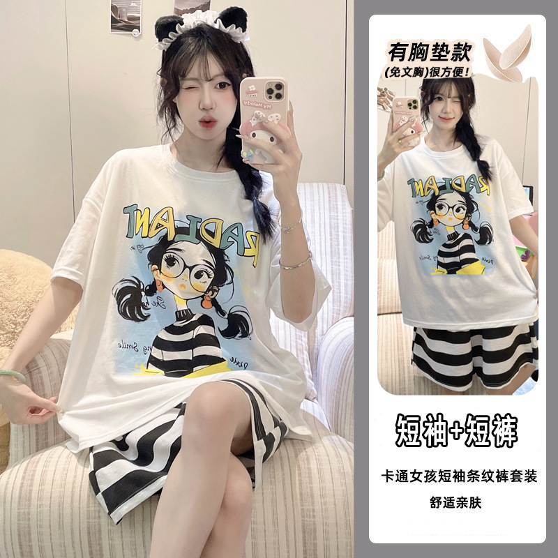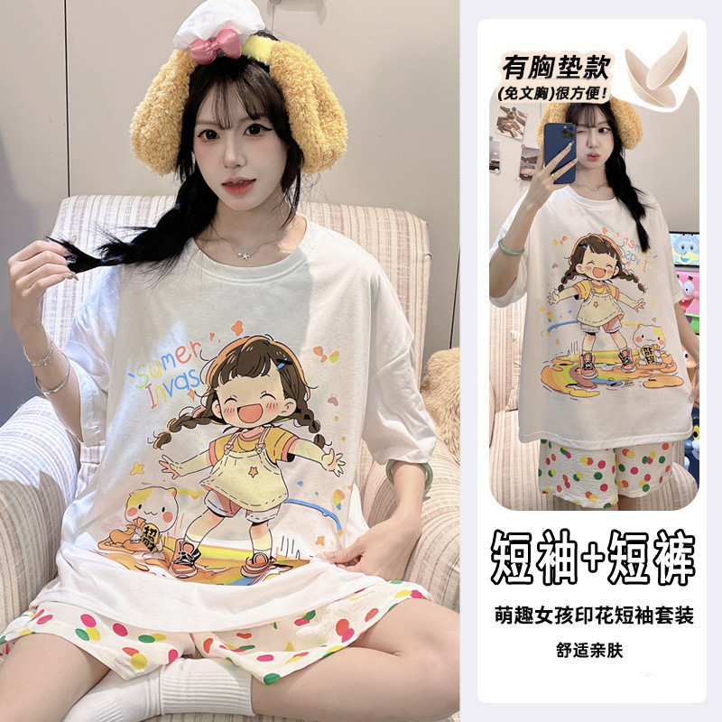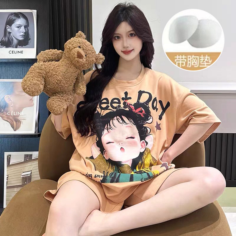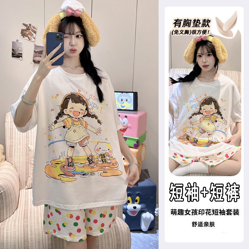 【今日份OOTD❗️卡通睡衣套装】可爱感直接拉满,自带胸垫免穿文胸,宽松大版型不挑身形,柔软亲肤透气不闷汗,短袖短裤甜美卡通女孩韩版印花家居服套装QQ