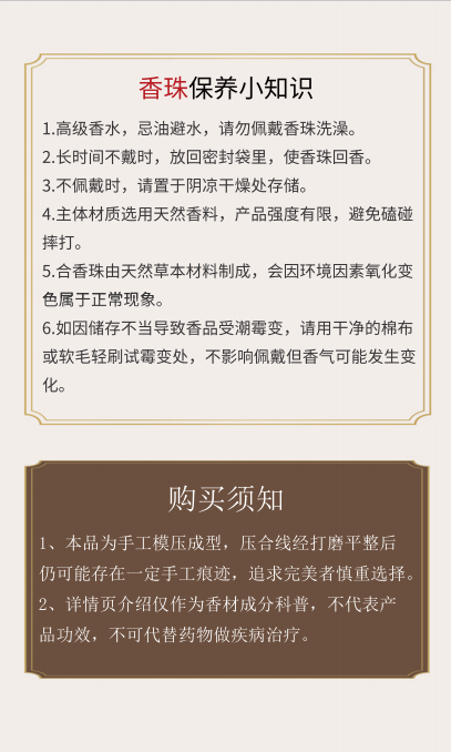 【品名】 宫造 金缕含翠合香珠手串 春夏适宜 【规格】 招财金缕含翠合香珠手串 祥云金缕含翠合香珠手串 【产地】国内 【发货包装】独立包装 【发货地】莆田 【发货快递】圆通、中通随机发 【不发货区域】新疆、西藏、港澳台 【补邮费地区】宁夏、甘肃、内蒙古、青海+10元 【发货时效】48-72小时,周末节假日顺延 【产品说明】该产品是天然中药粉压制成的,没有胶水,忌水忌油 不能带着洗手 洗澡! |