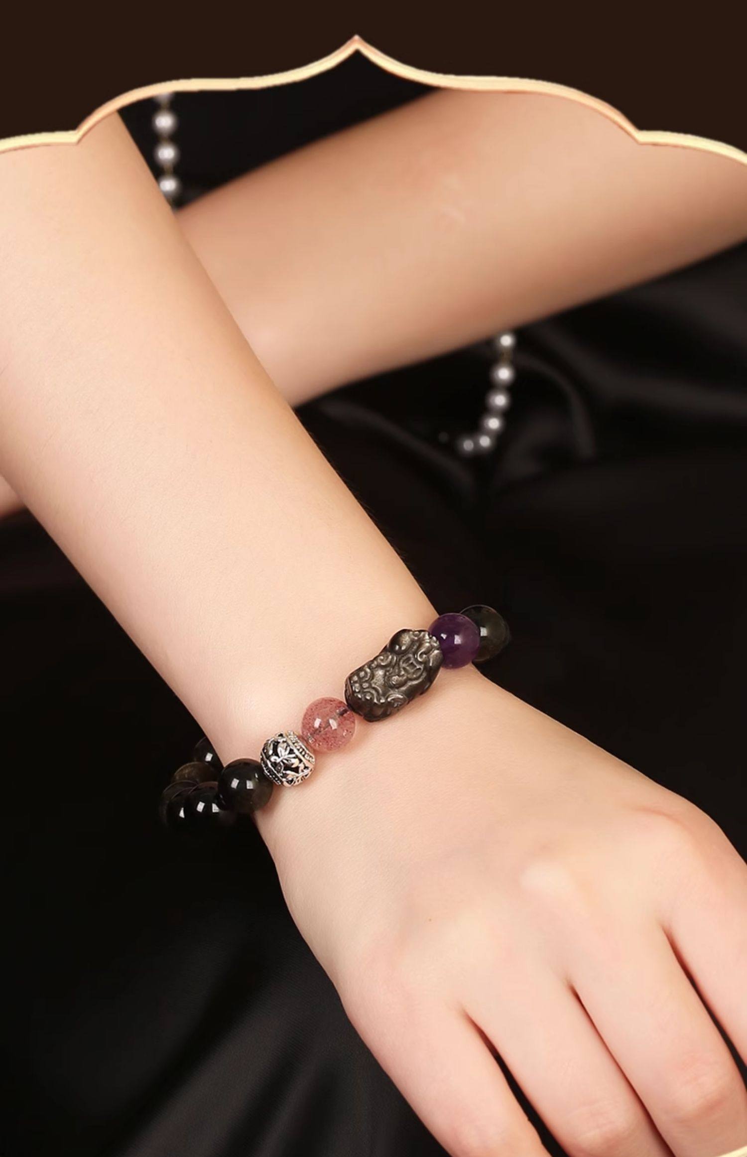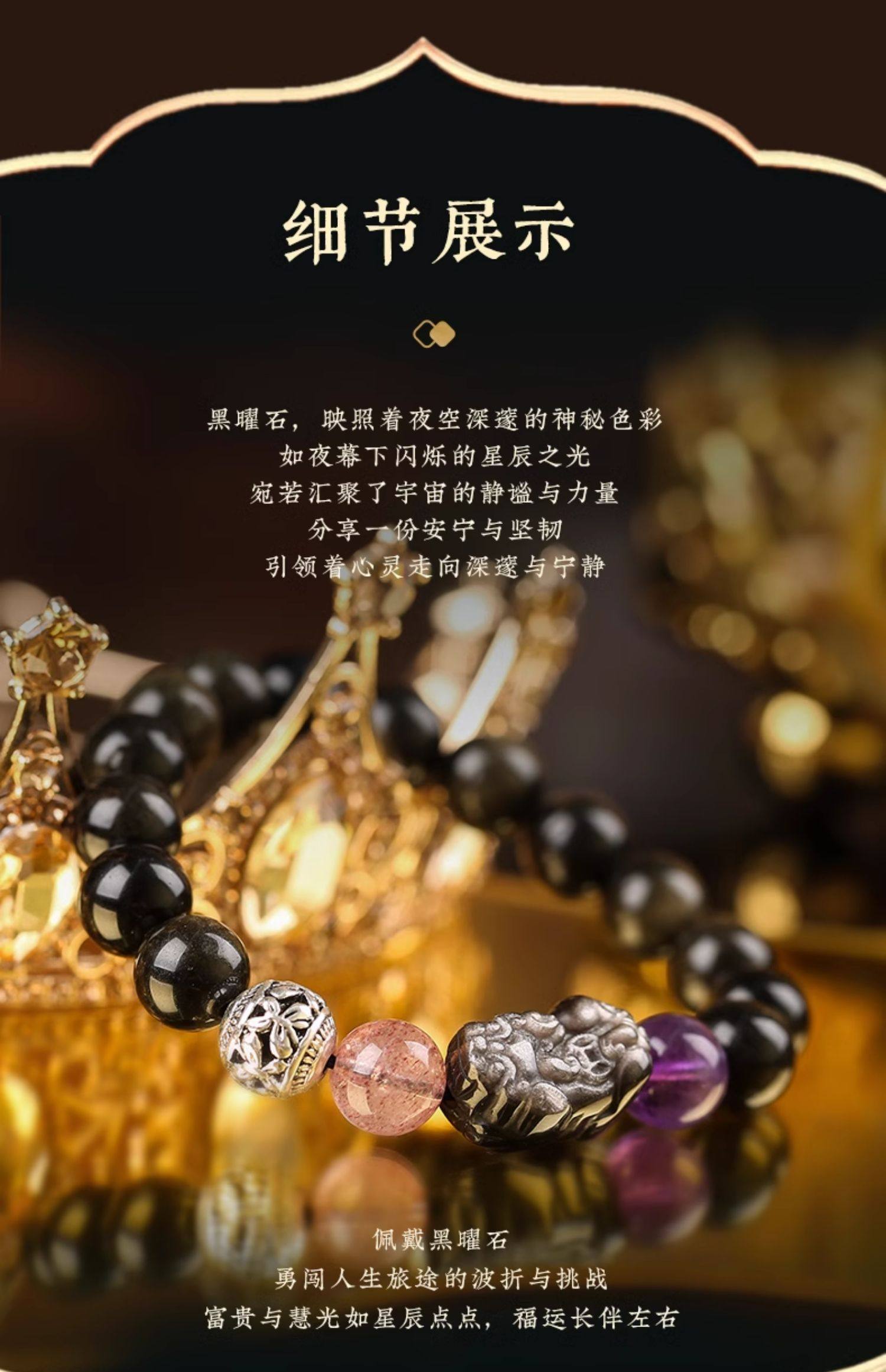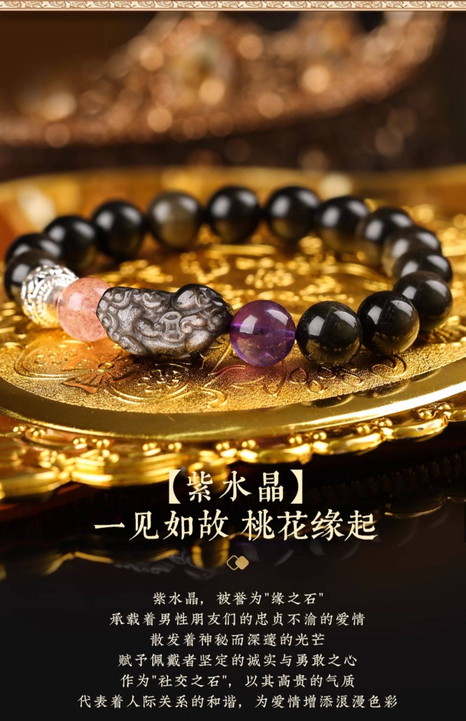 【祈愿吉品】【 財囍双收】貔貅黑曜石紫水晶手链 情定三生手串男