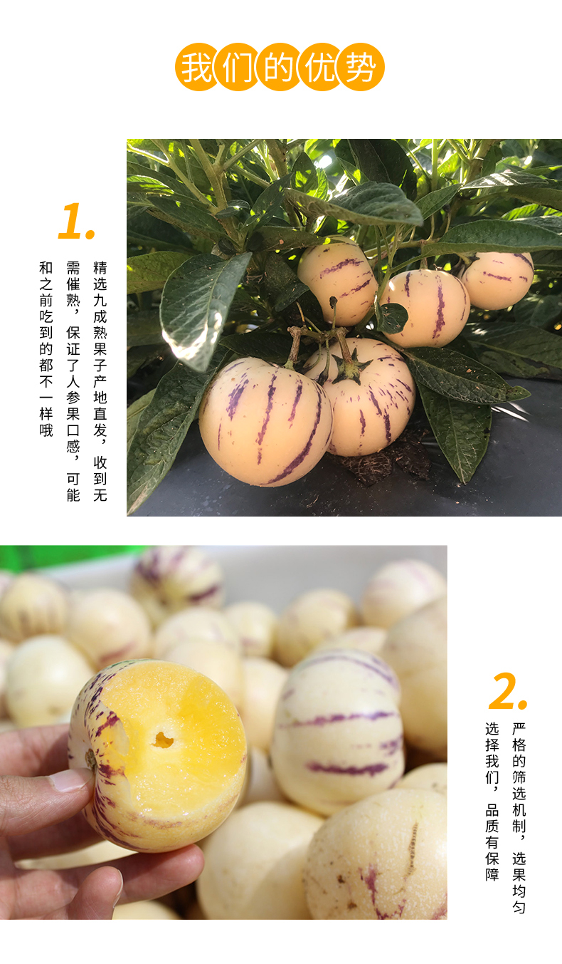 2.由于人参果果皮犹如纸一般非常薄虽然包装很结实但也会有个别的遭受暴力快递导致轻微压伤,这不是坏果不影响食用不在售后范围。
