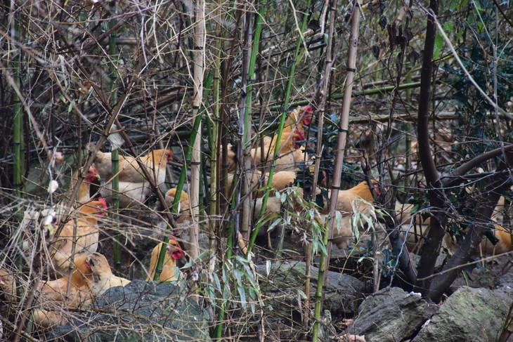 ●土鸡在山里自由活动,但是它们也不会跑太远